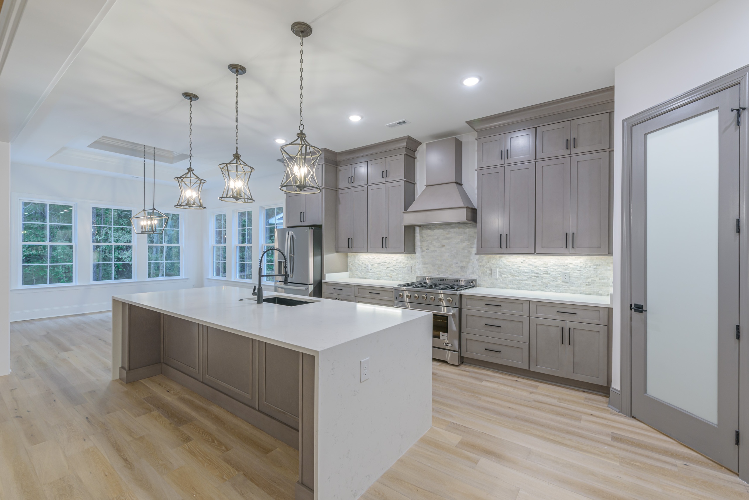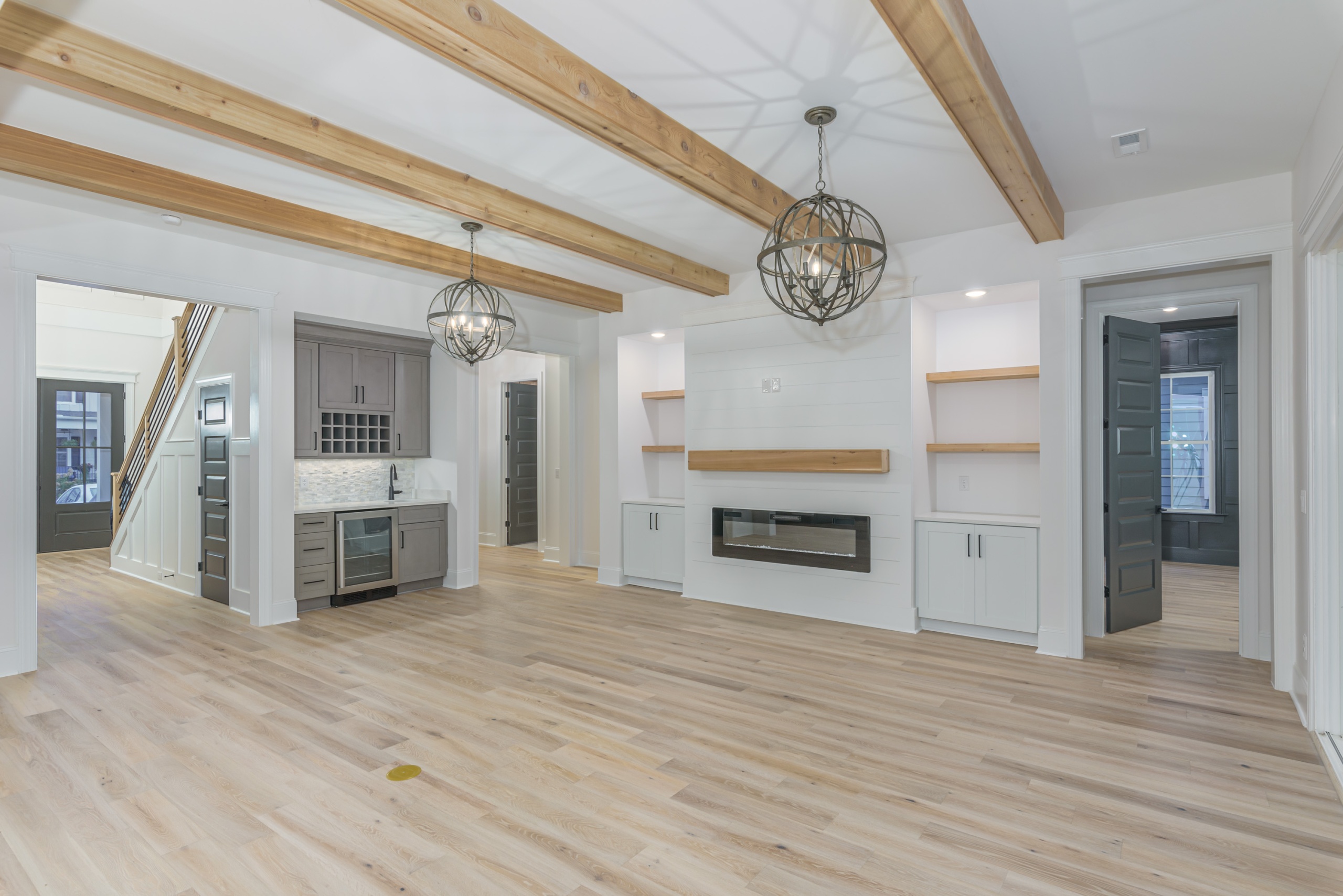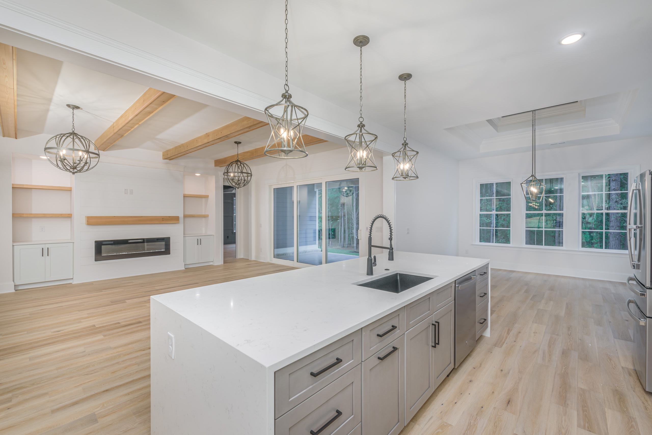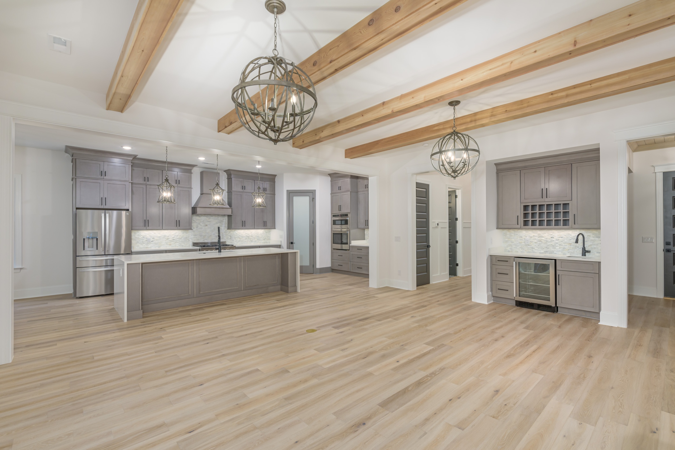 Entertaining is effortless in the spacious living areas, which showcase beam or tray ceilings adorned with craftsman moldings. The living room adds a cozy ambiance with its accent fireplace and bar area, complete with a beverage center. The chef’s dream kitchen is equipped with a double oven, high-end appliances, abundant cabinet space, a large work island, and a walk-in pantry.