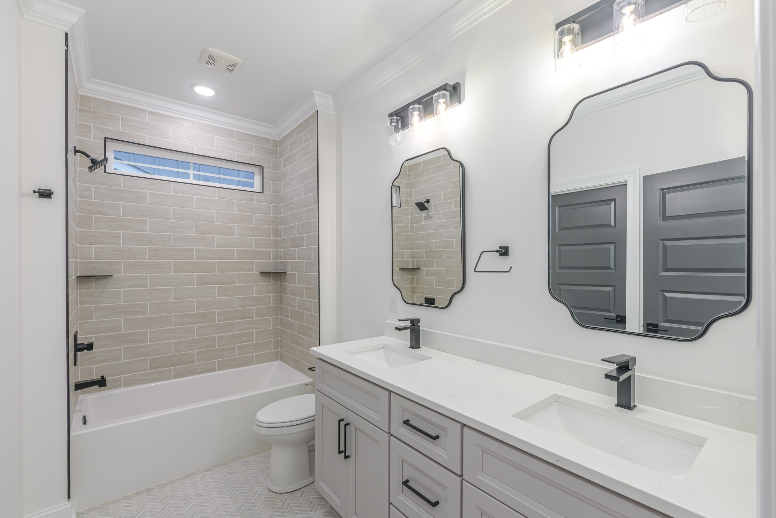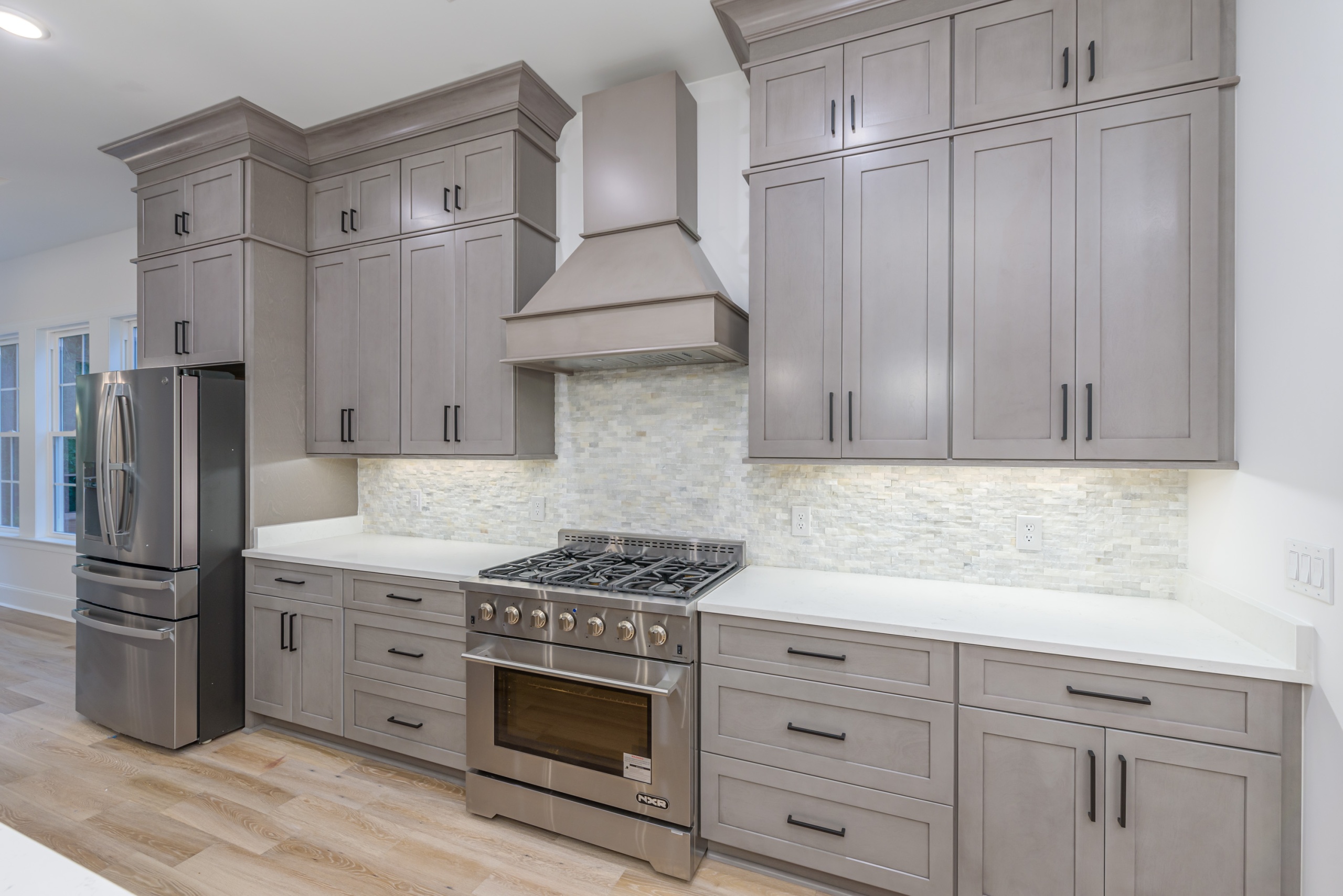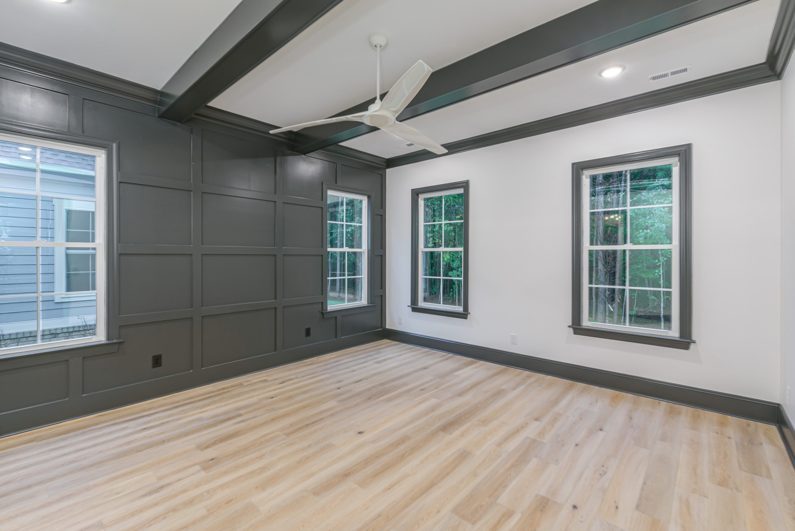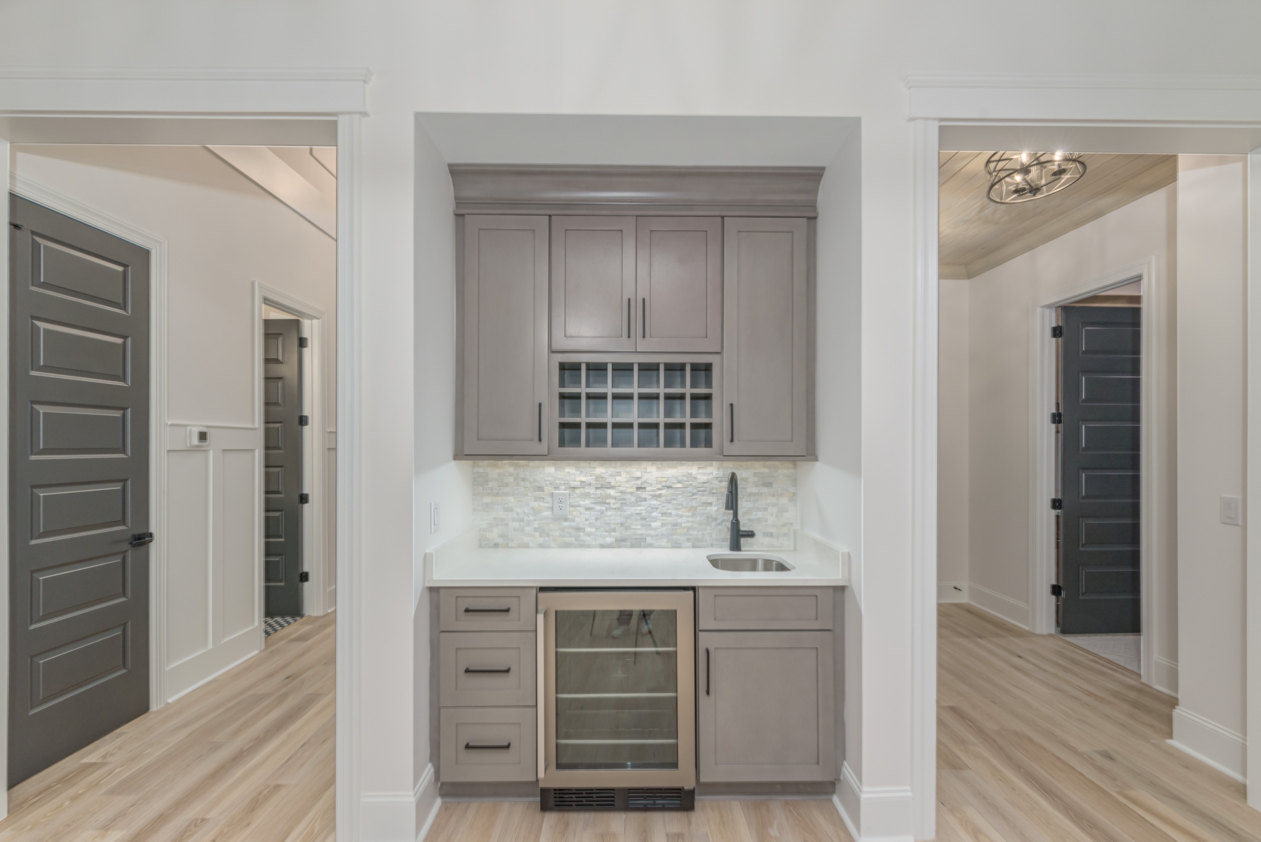 Entertaining is effortless in the spacious living areas, which showcase beam or tray ceilings adorned with craftsman moldings. The living room adds a cozy ambiance with its accent fireplace and bar area, complete with a beverage center. The chef’s dream kitchen is equipped with a double oven, high-end appliances, abundant cabinet space, a large work island, and a walk-in pantry.