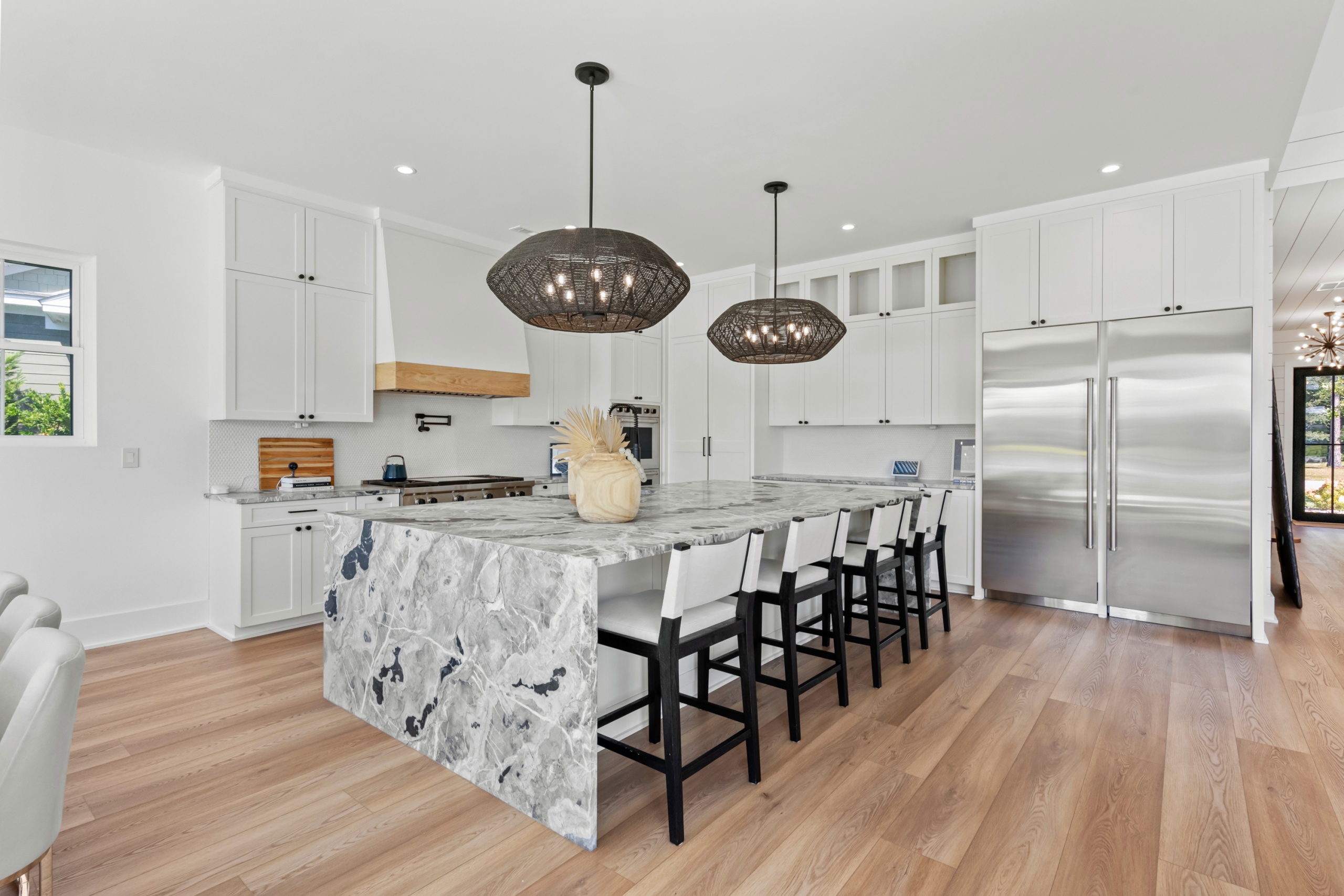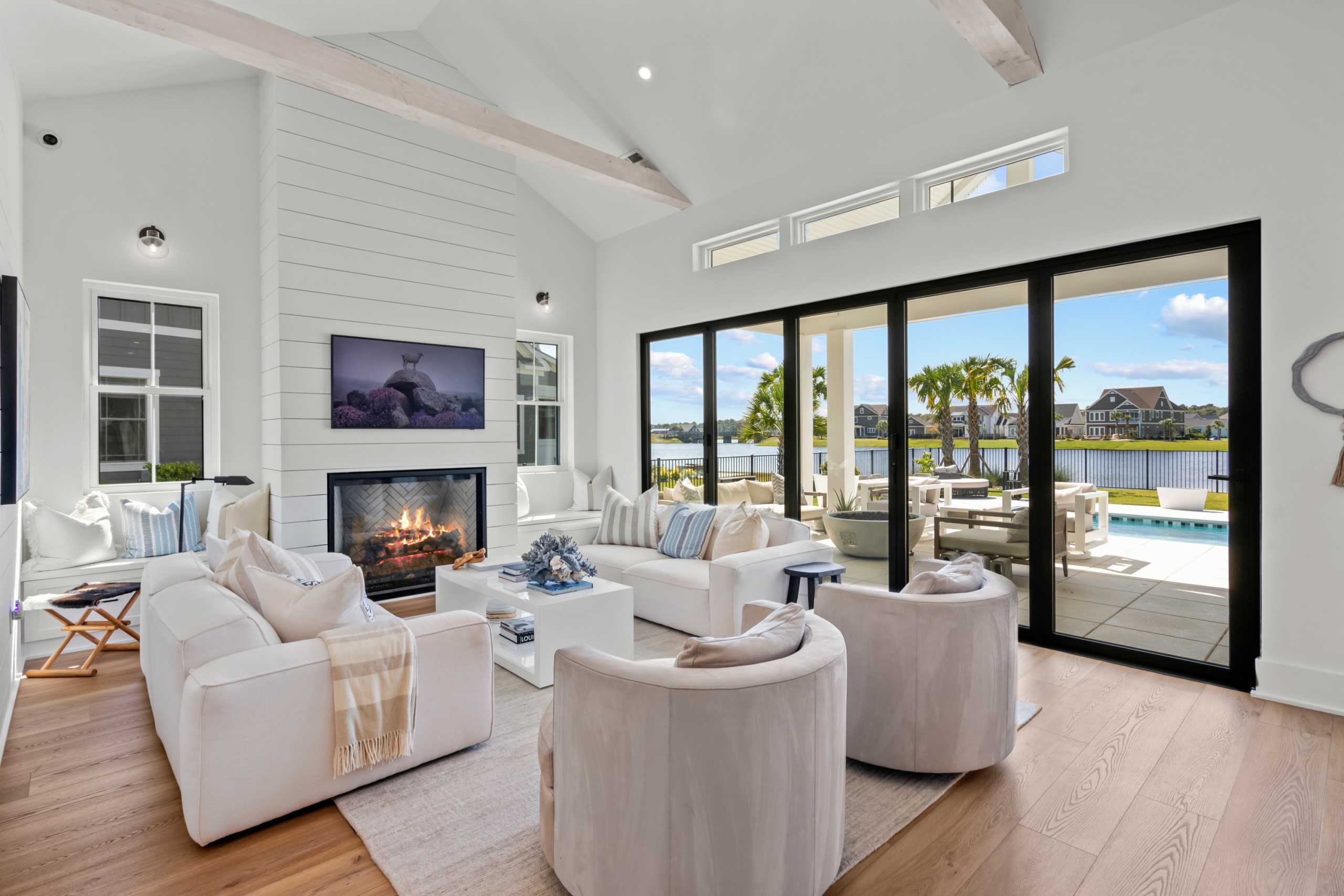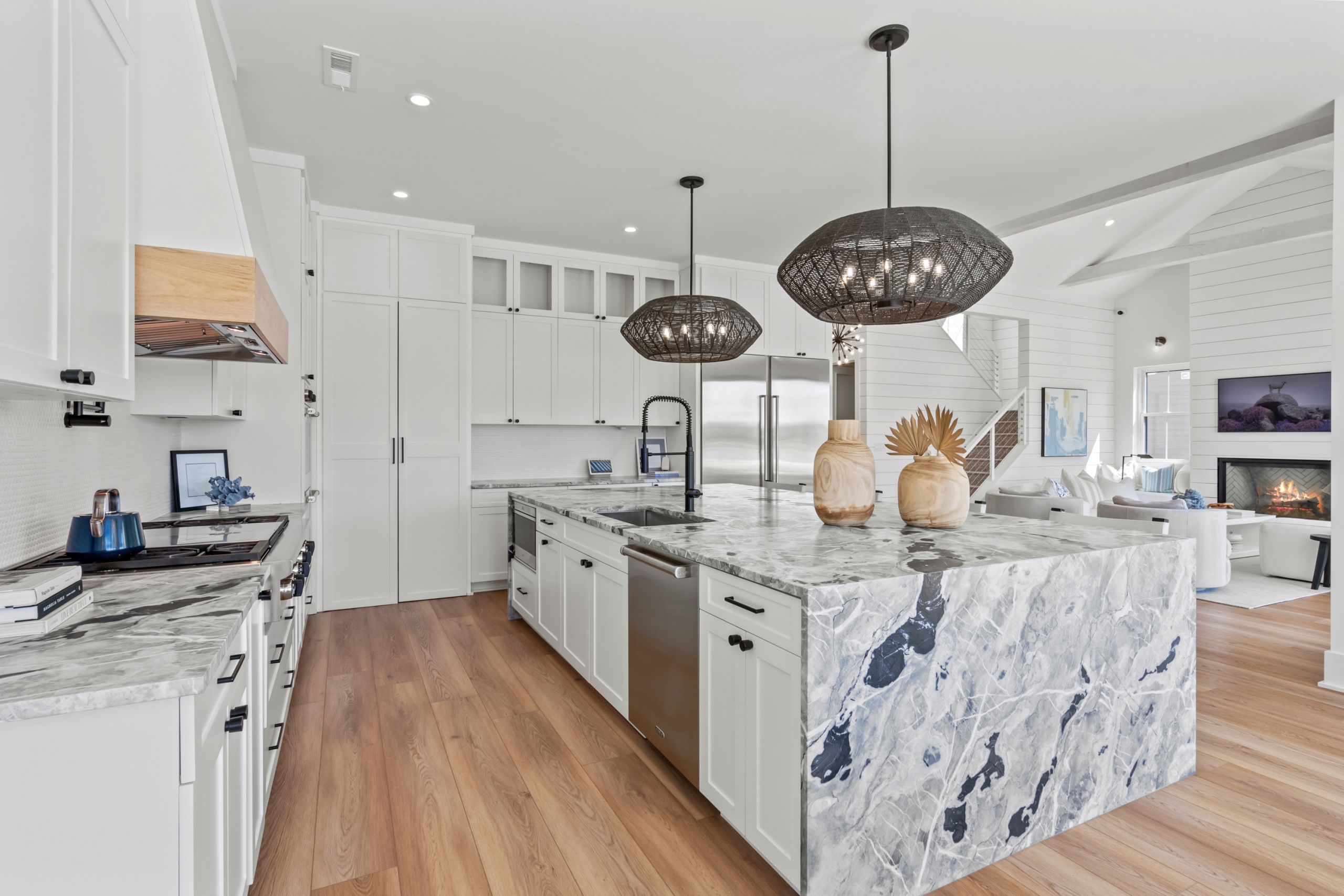 For the culinary enthusiast, the kitchen is a masterpiece in its own right, showcasing Italian quartzite countertops, top-of-the-line Wolf/Sub-Zero appliances, a 4-burner range with griddle and grill, double wall ovens, and a concealed pantry. Noteworthy is the custom KitchenAid stand mixer easy lift cabinet, a testament to the meticulous attention to detail. The living area seamlessly connects to the outdoors through Nanawalls, which allow the entire rear of the house to open up to breathtaking water views. Step onto the expansive covered porch, complete with a ceiling fan, and immerse yourself in the tranquility of the surroundings.