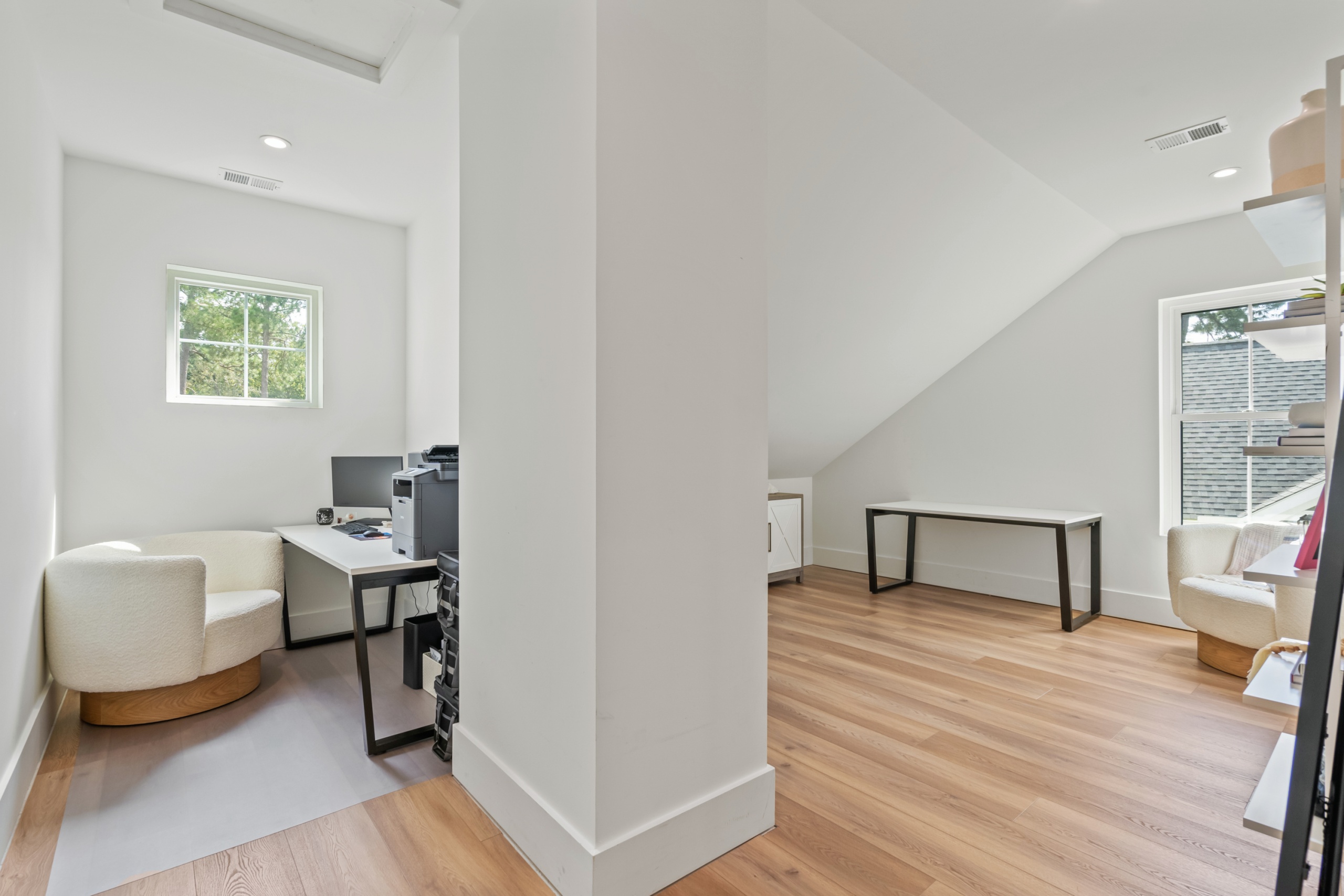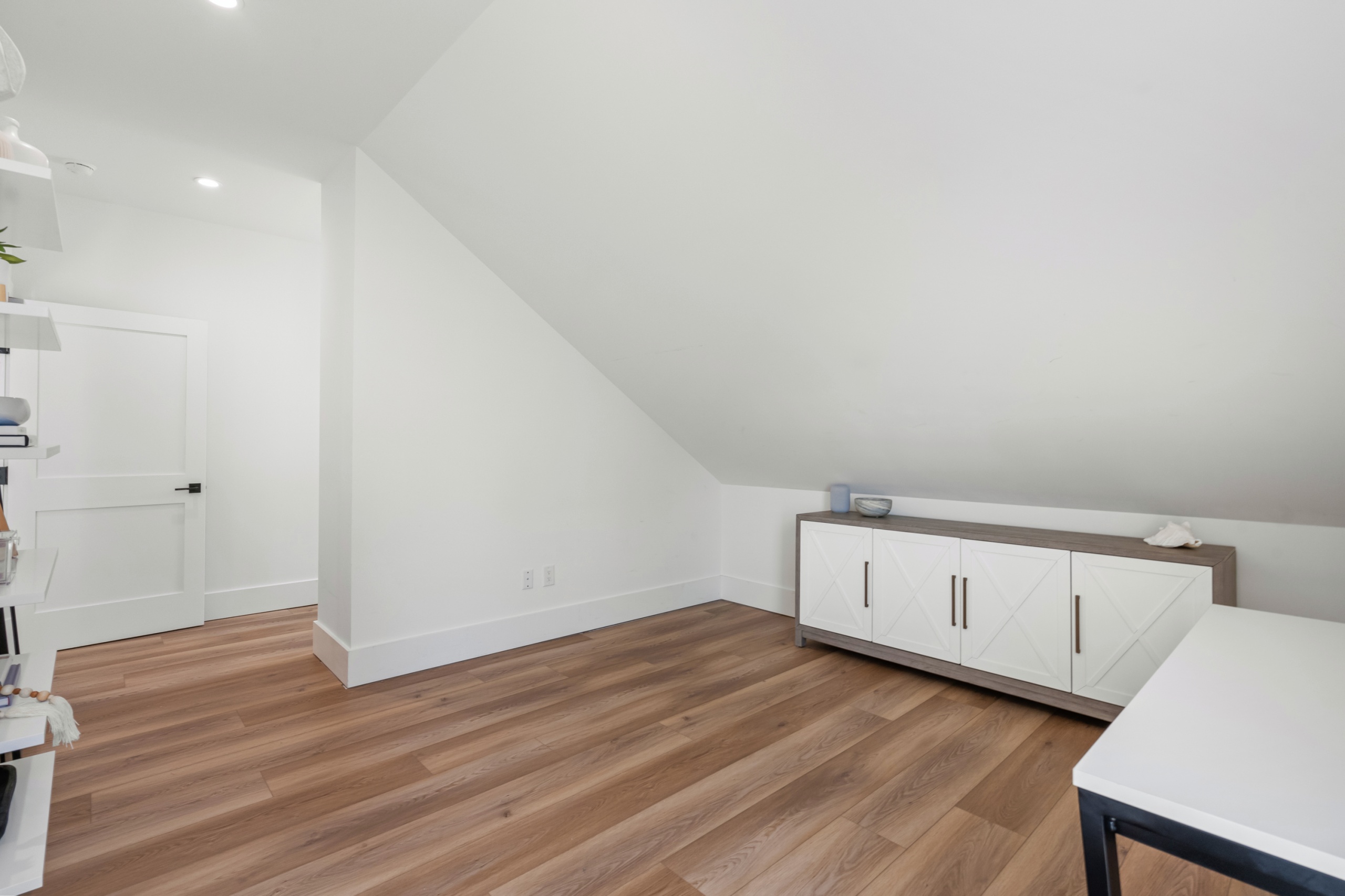 As you ascend to the upper level, you'll discover two bedrooms, a bonus room, and a loft area. The shared wet room offers a spa-like experience with a soaking tub and impeccable marble and Italian tile finishes. Throughout the master bath and laundry room, these luxurious materials further emphasize the home's opulence. Custom hardwood beams sourced from the Cape Fear River impart character and charm throughout the property.