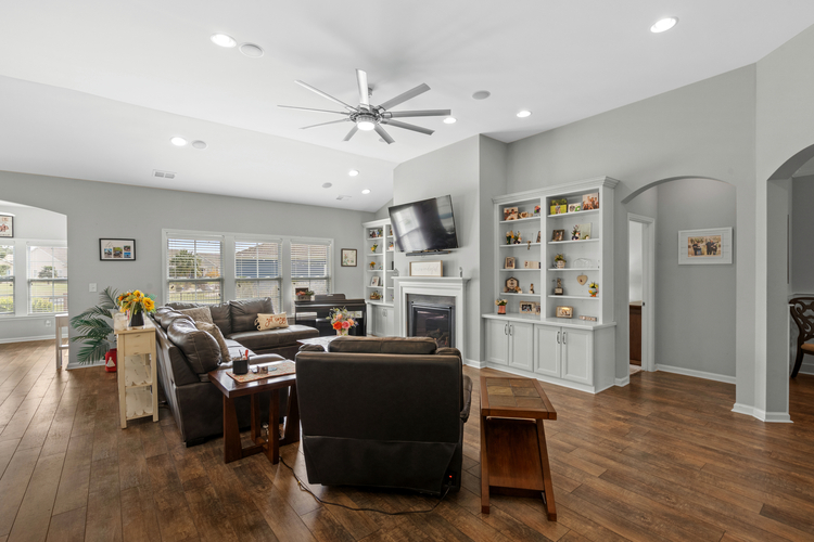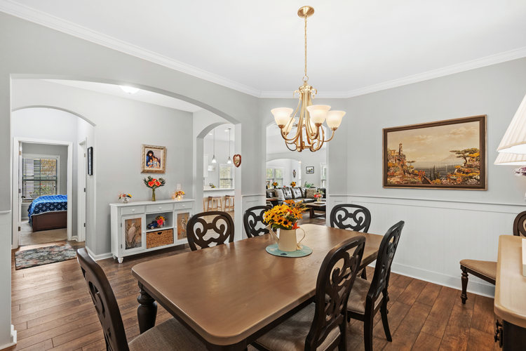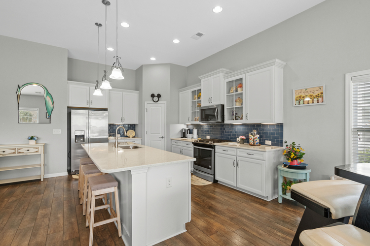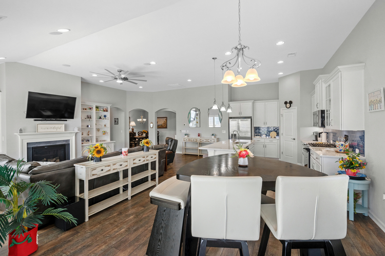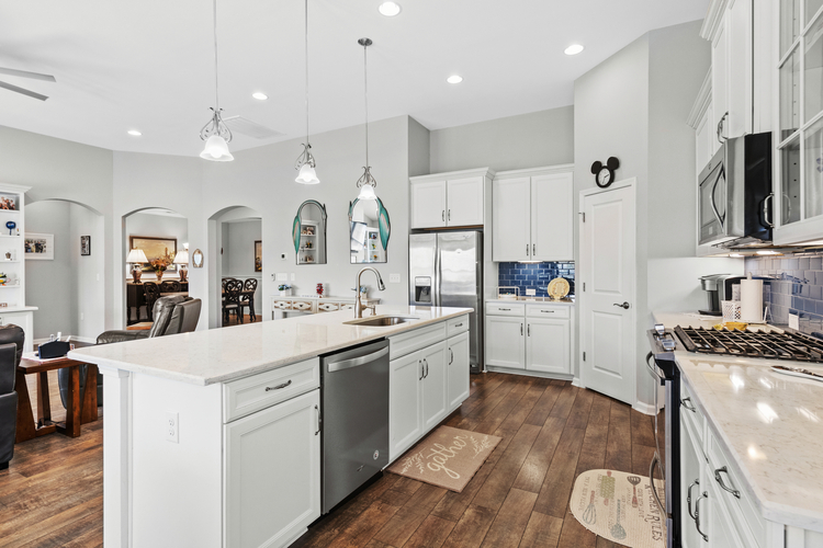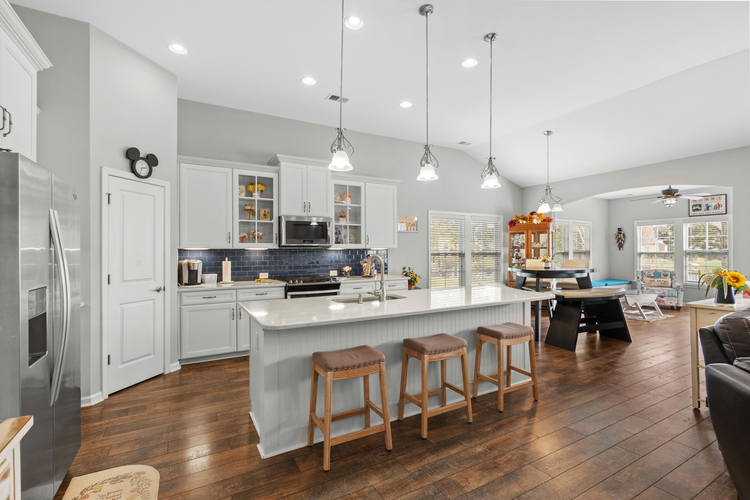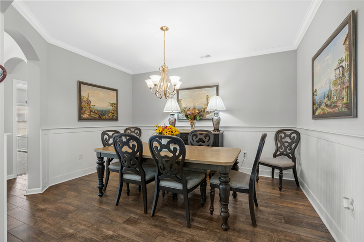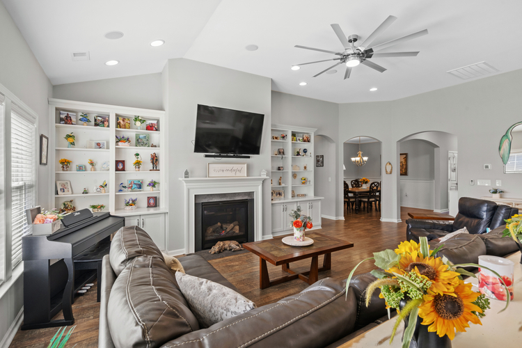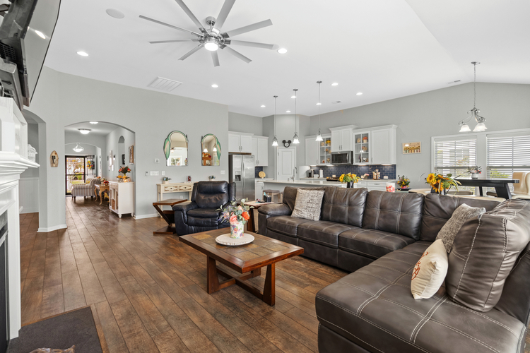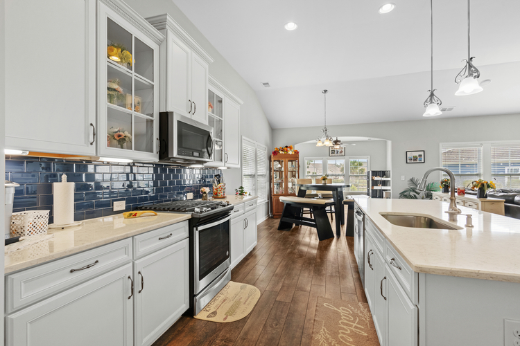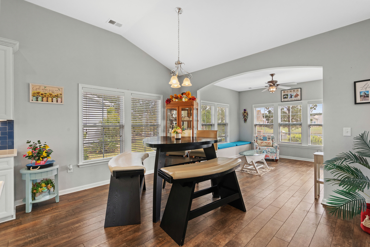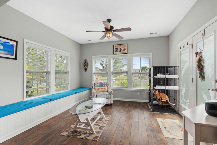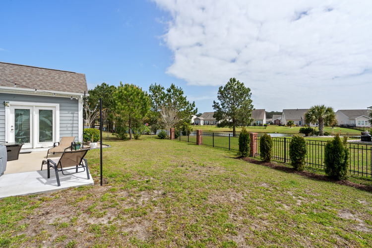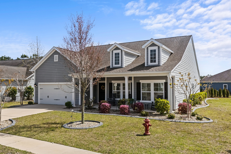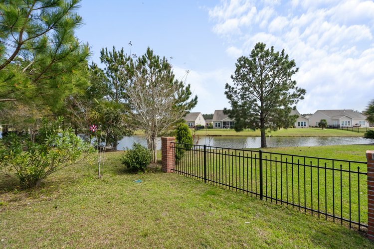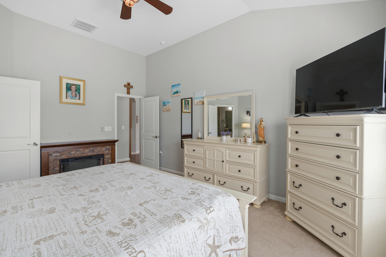 Discover the epitome of coastal luxury in this expansive 4-bedroom, 3-bath residence nestled in the exclusive gated section of Windsor Plantation. Boasting a robust Hardi-Plank Fiber Cement exterior for unmatched durability and charm, this home is complemented by tasteful concrete curbscaping and a comprehensive irrigation system, ensuring curb appeal that captivates and impresses. Inside, the soaring vaulted ceilings and an open-concept design merge the family/great room—with its cozy fireplace and oversized ceiling fan—with a modern kitchen, featuring stainless steel appliances, a tile backsplash, and a breakfast bar that promises both style and function. The sunroom extends your living space, offering serene pond views, while the formal dining room dazzles with elegant beadboard wainscotting.