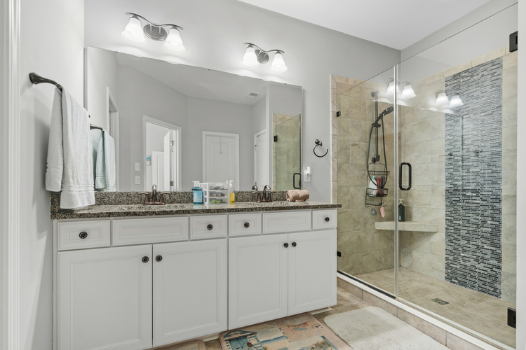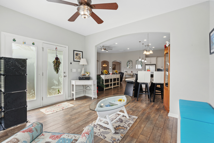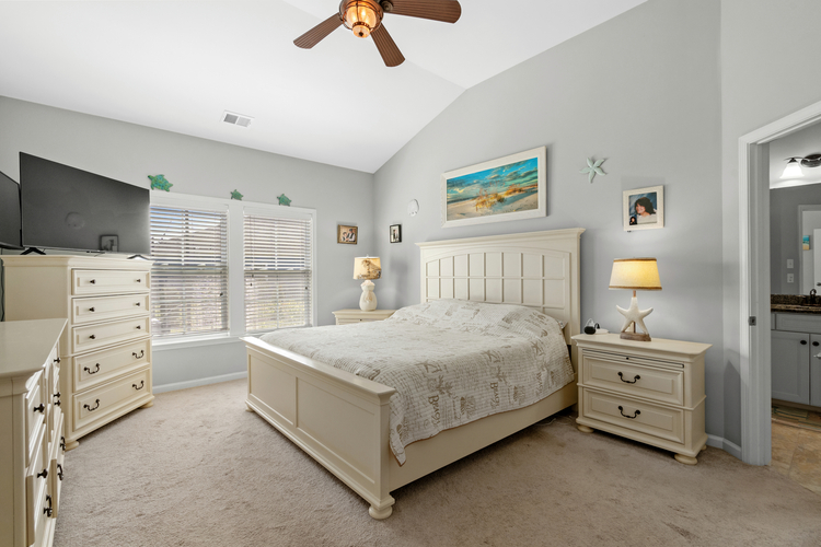 The master suite, a sanctuary of relaxation, presents high vaulted ceilings, a private bath with dual sinks, a tiled shower, and a spacious walk-in closet. The home’s thoughtful layout includes a welcoming den off the foyer, two additional bedrooms with a full bath, and a split floor plan that ensures guest privacy with a fourth bedroom and bath. Rich wood flooring, tile in all baths, and plush carpeting in the bedrooms define luxury underfoot, while the extended front porch and back patio promise endless enjoyment of the coastal breeze.