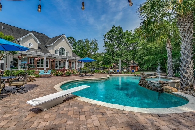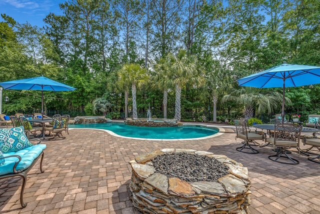 The outdoor setting is incredible. The custom saltwater pool is heated and features natural rock accents, a sun shelf, and a built-in hot tub. Surrounding it is an extensive paver patio designed for entertaining, relaxing, or enjoying quiet evenings by the water. Mature landscaping and accent lighting add to the peaceful atmosphere, while sections of the yard are already fenced for added convenience.