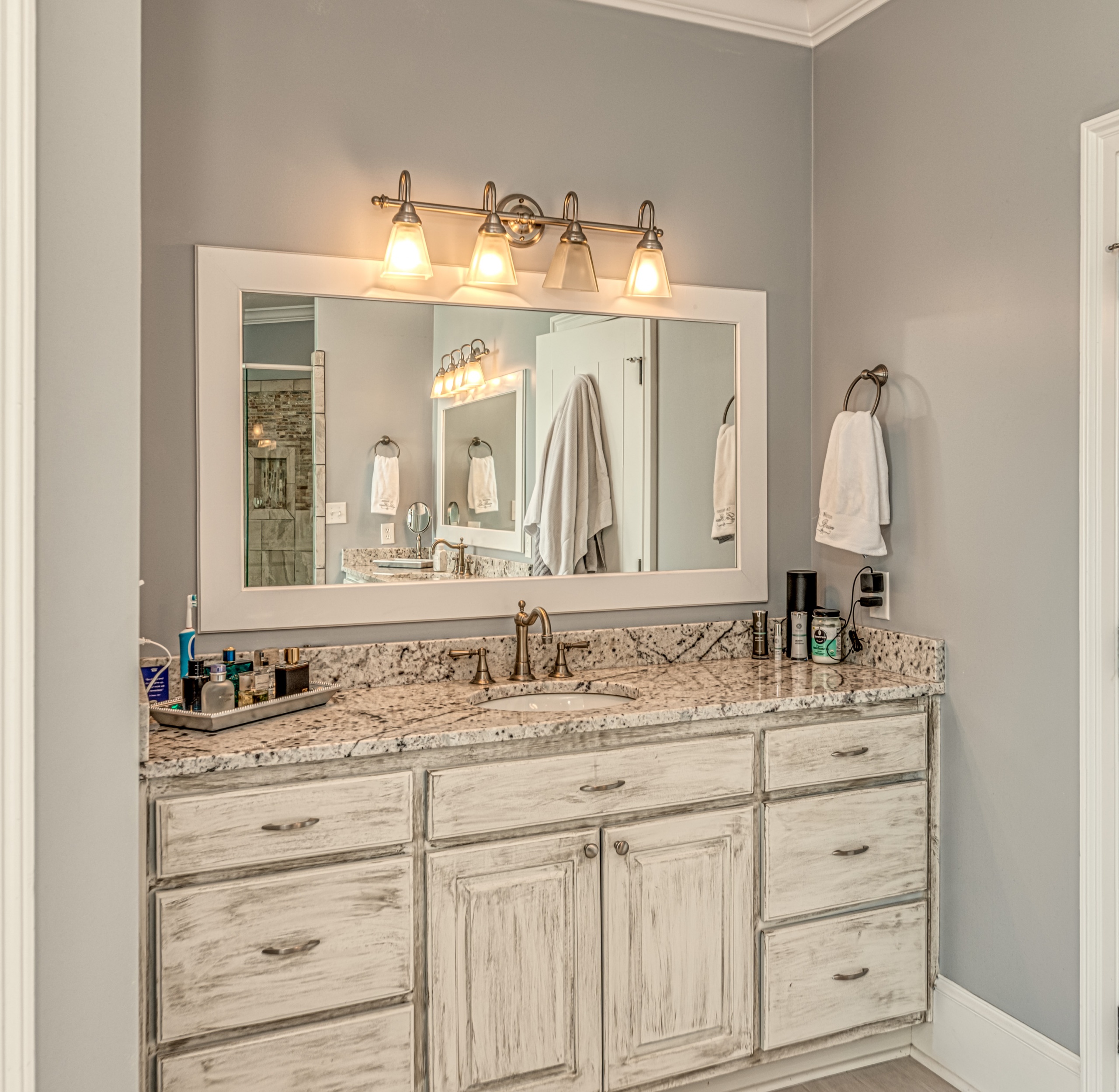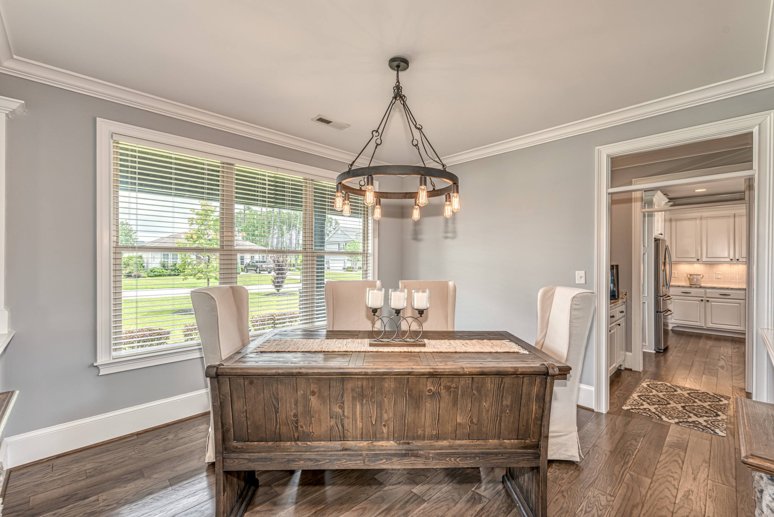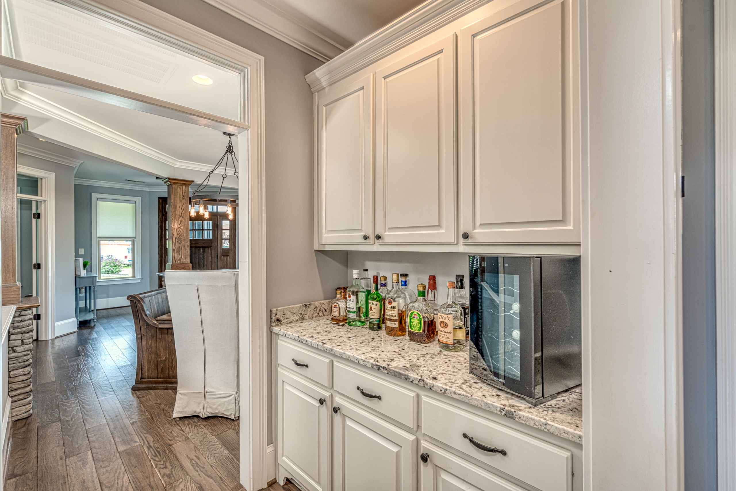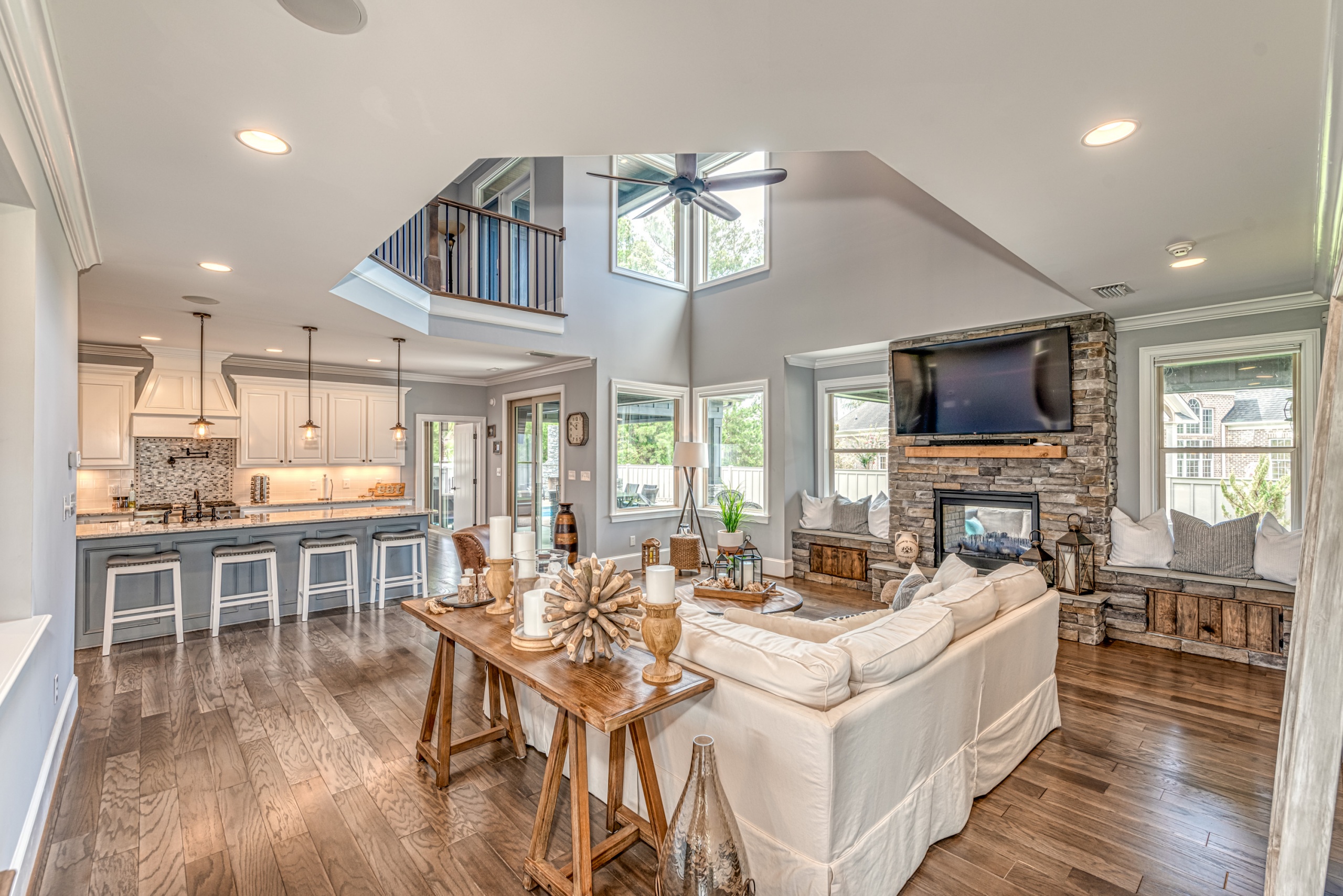 Once through the front door, you are drawn into the home by rich hardwood flooring, detailed moldings, a double-sided stacked stone fireplace, and a two-story living area. Now that you are inside, the quality craftsmanship and attention to detail are evident at every turn. The open kitchen and great room combination have become the staple of southern living. The large kitchen has a stainless gas range with a custom hood matching the cabinets. A secondary wall oven is a necessity for those who enjoy cooking. The large breakfast bar, oversized pantry, and butler pantry leading into the dining room make this an ideal home for entertaining. Rounding out the first level is a private guest suite ideal for in-laws or weekend guests, a study, playroom/den, and a 1st-floor laundry room.
