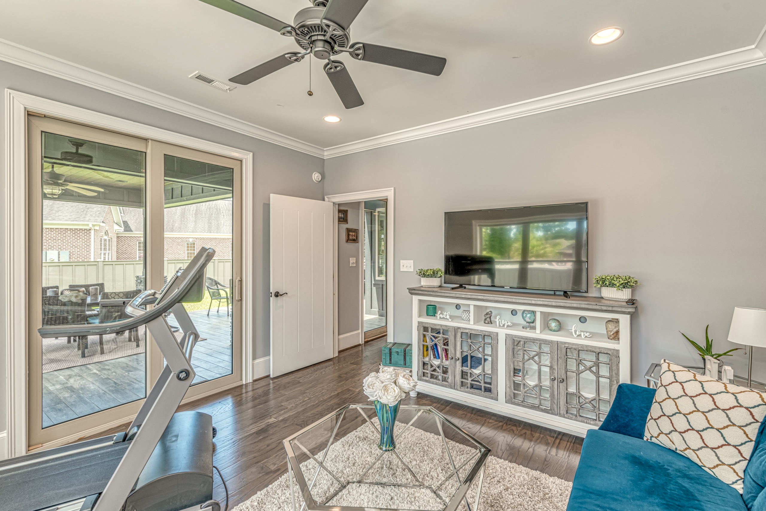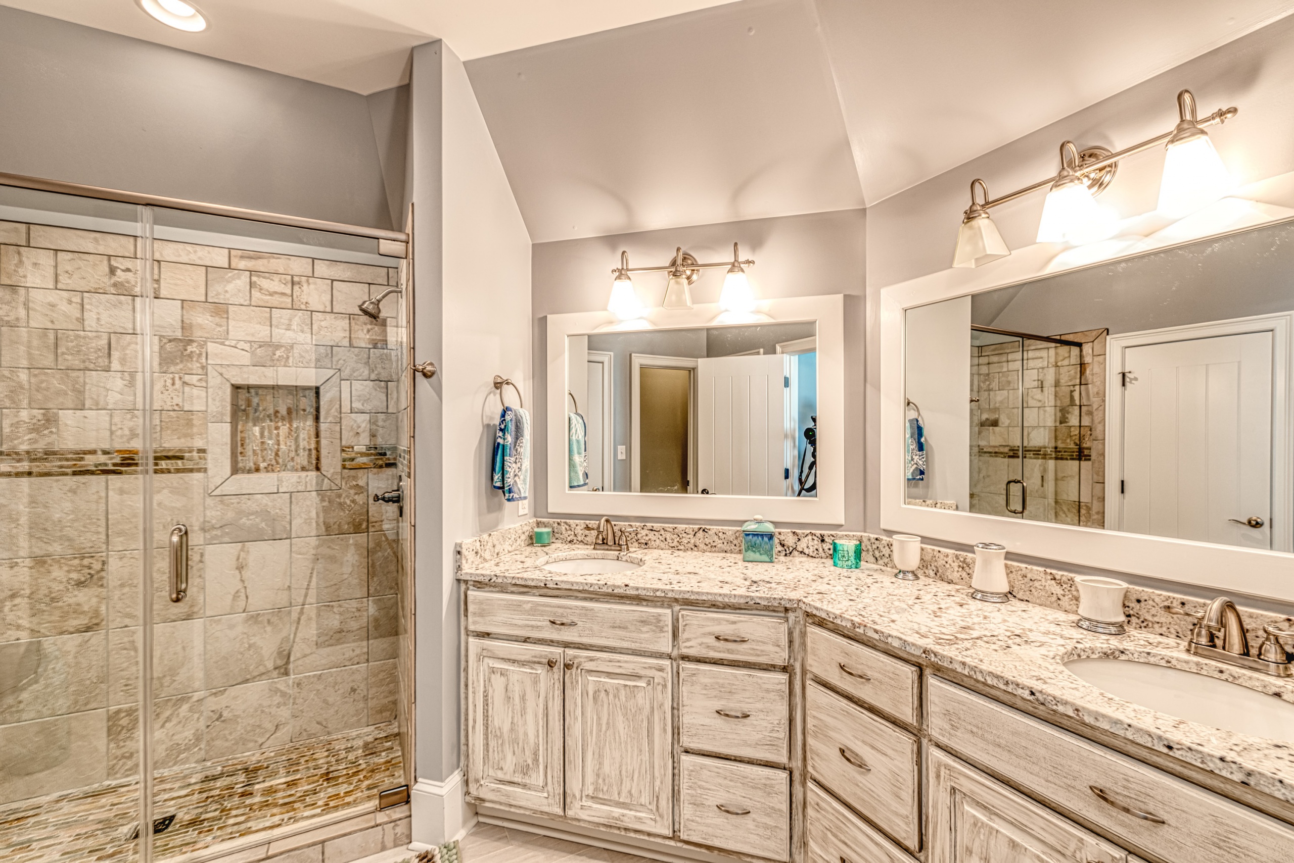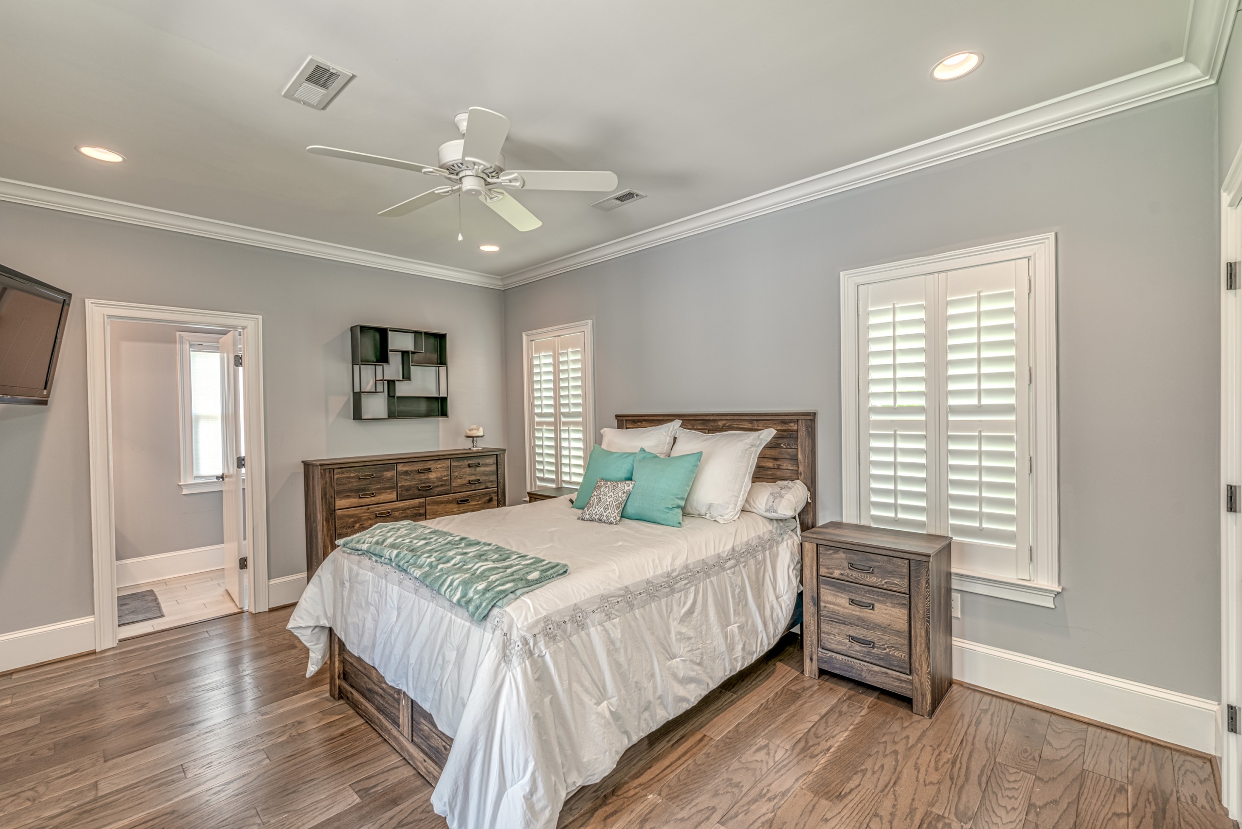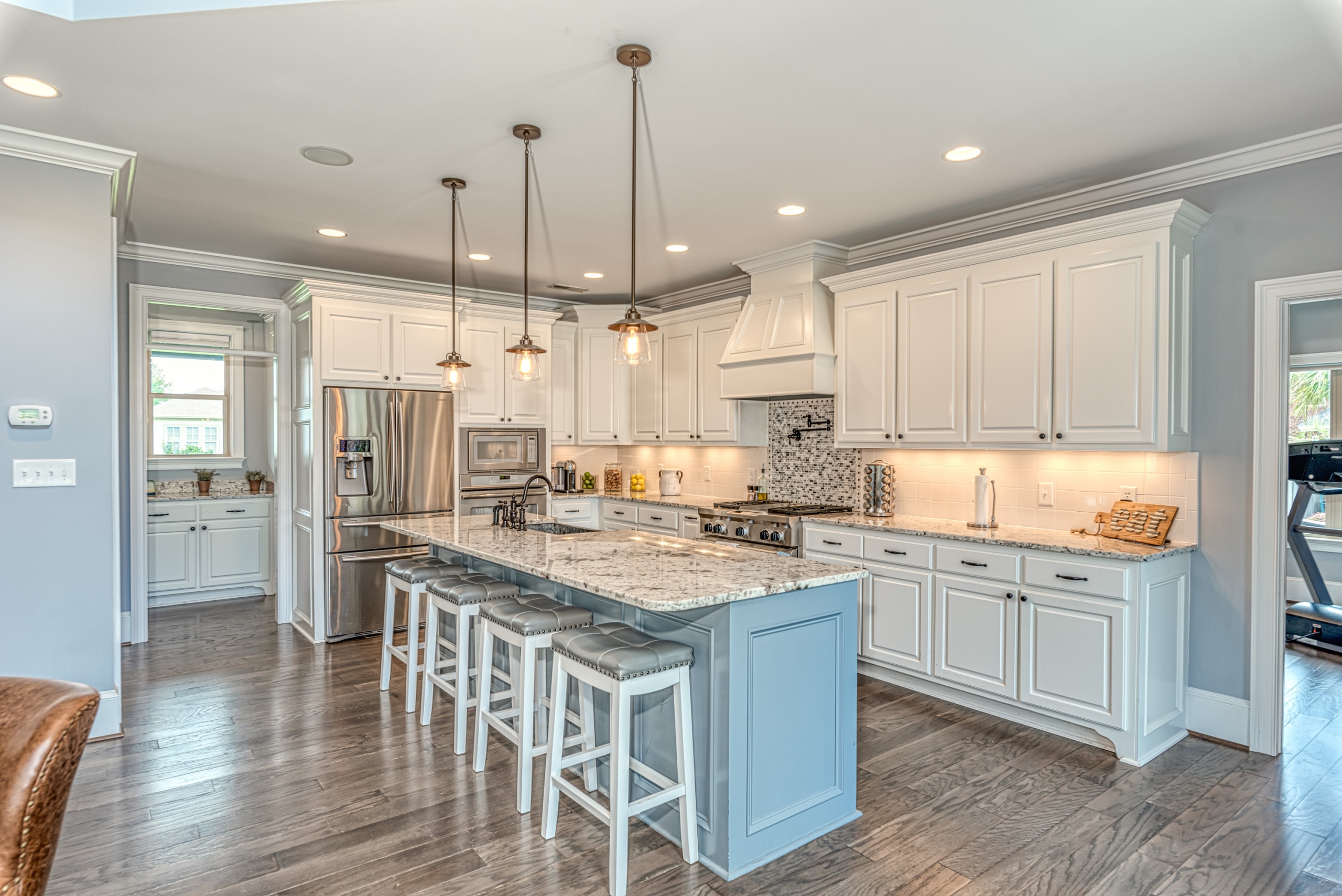 Once through the front door, you are drawn into the home by rich hardwood flooring, detailed moldings, a double-sided stacked stone fireplace, and a two-story living area. Now that you are inside, the quality craftsmanship and attention to detail are evident at every turn. The open kitchen and great room combination have become the staple of southern living. The large kitchen has a stainless gas range with a custom hood matching the cabinets. A secondary wall oven is a necessity for those who enjoy cooking. The large breakfast bar, oversized pantry, and butler pantry leading into the dining room make this an ideal home for entertaining. Rounding out the first level is a private guest suite ideal for in-laws or weekend guests, a study, playroom/den, and a 1st-floor laundry room.
