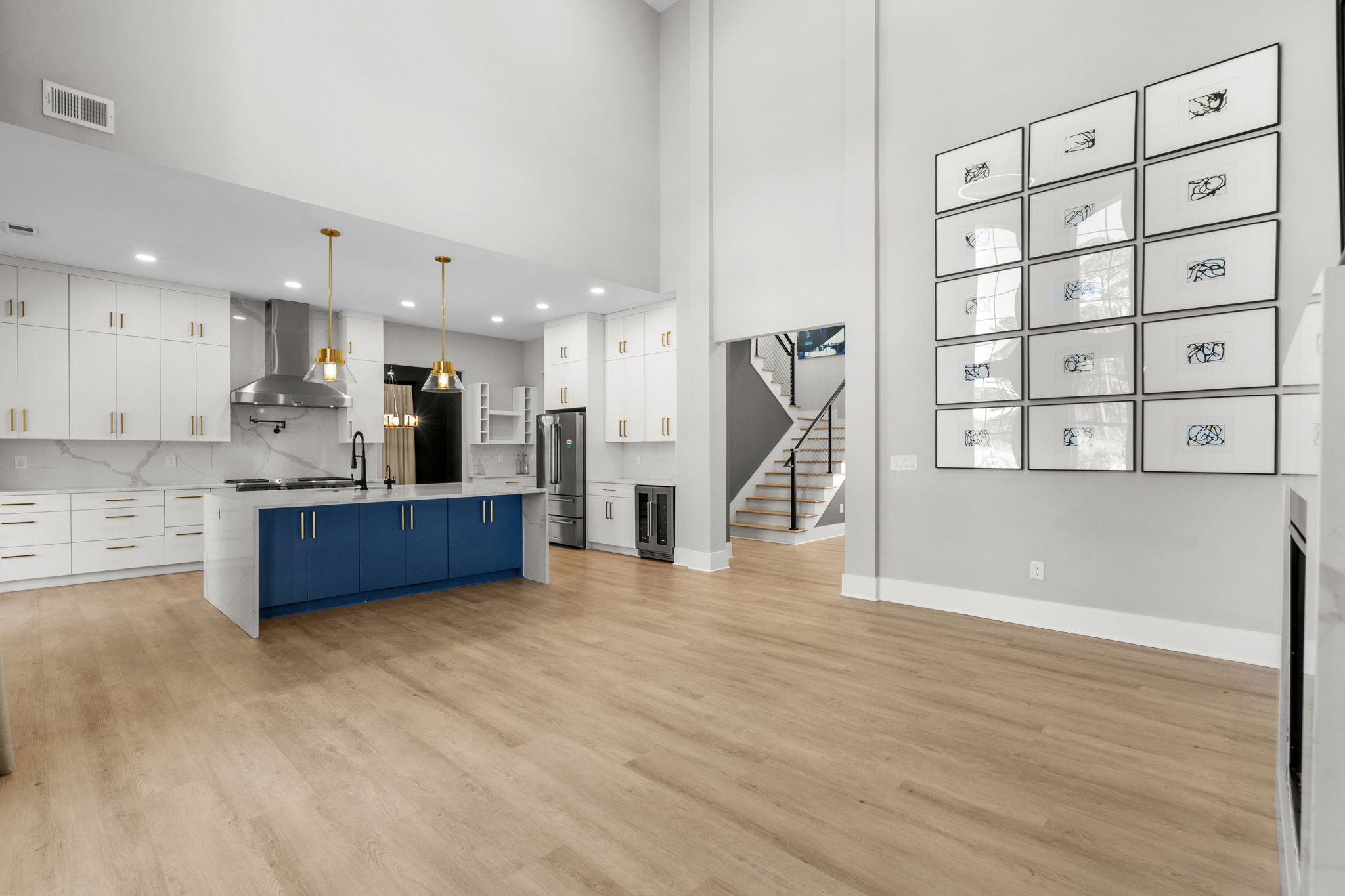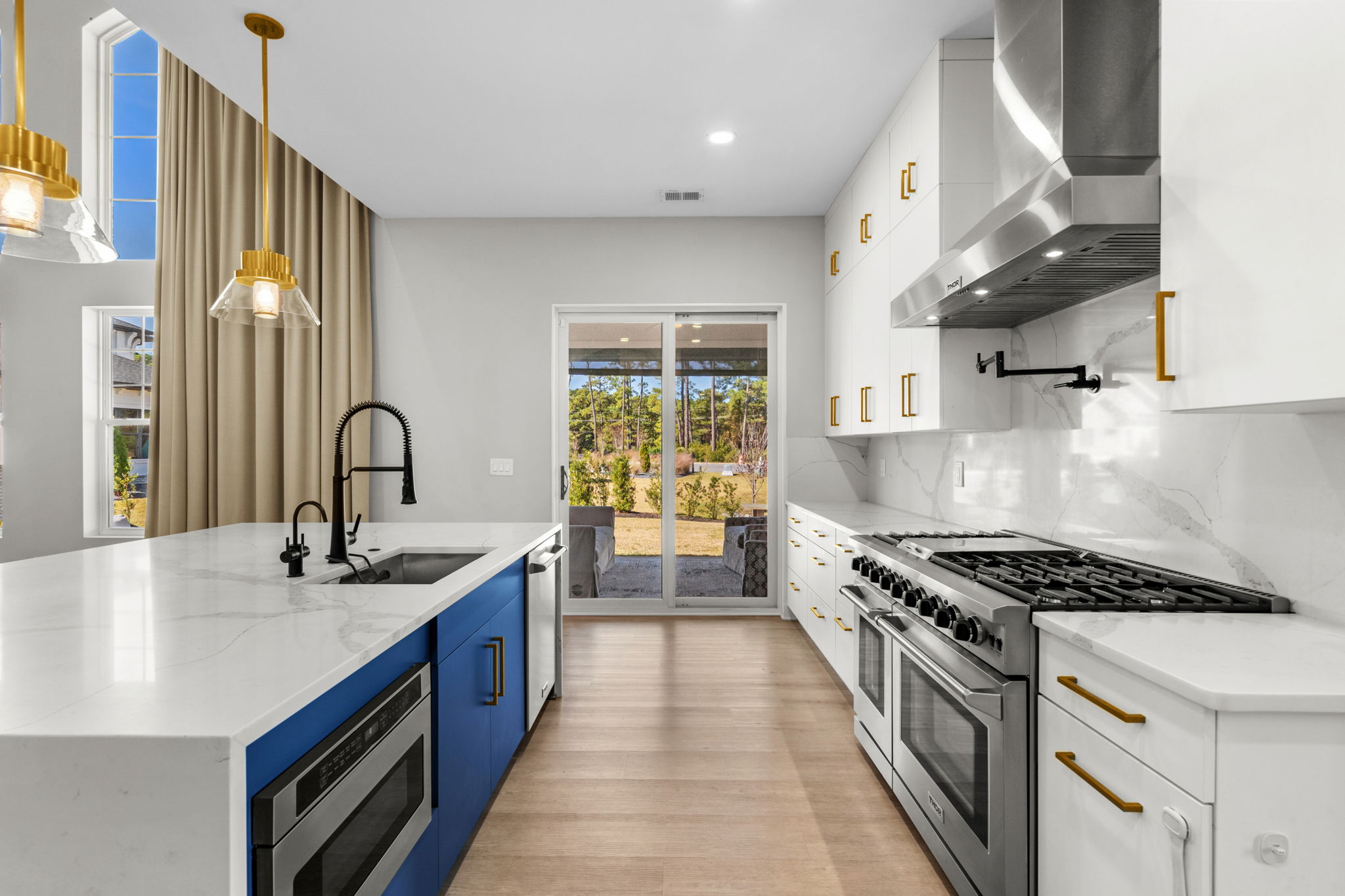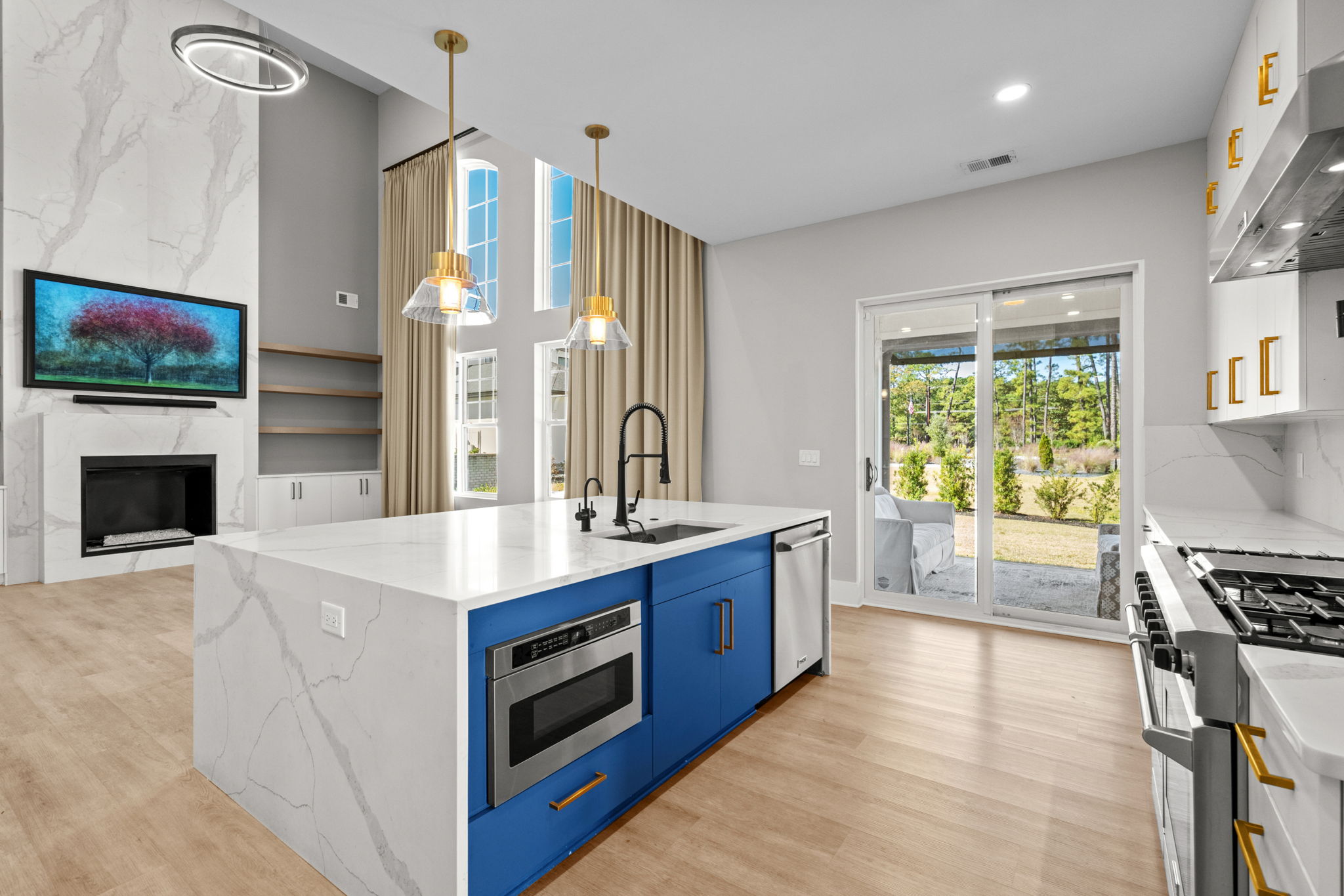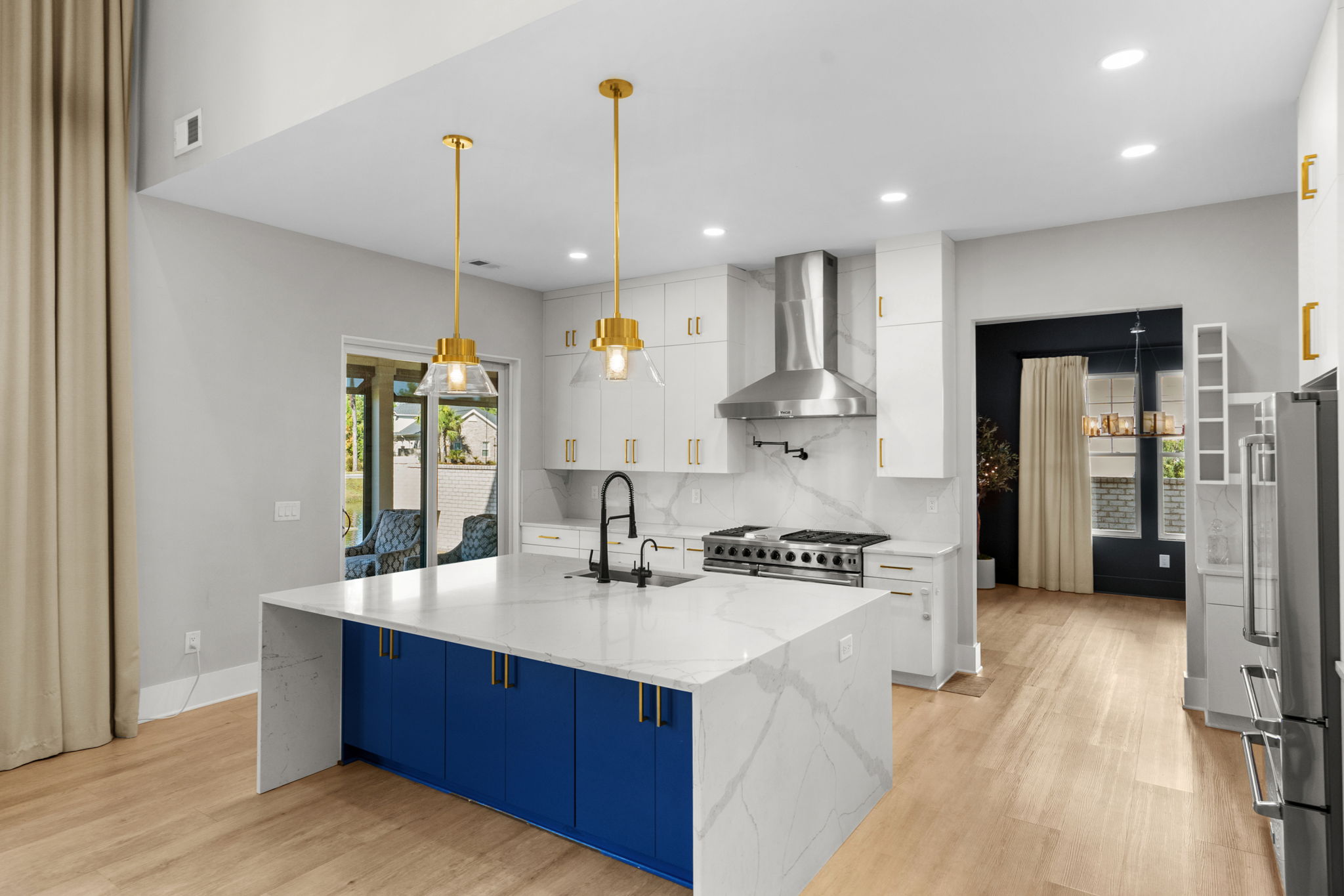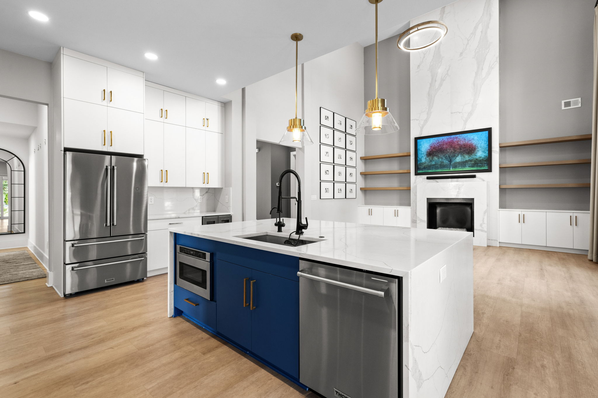 The designer kitchen is both striking and functional, featuring sleek white cabinetry, quartz countertops, and a bold navy island accented with gold hardware. Professional-grade stainless appliances, double ovens, a pot filler, and a walk-in pantry create the perfect balance between elegance and practicality.
