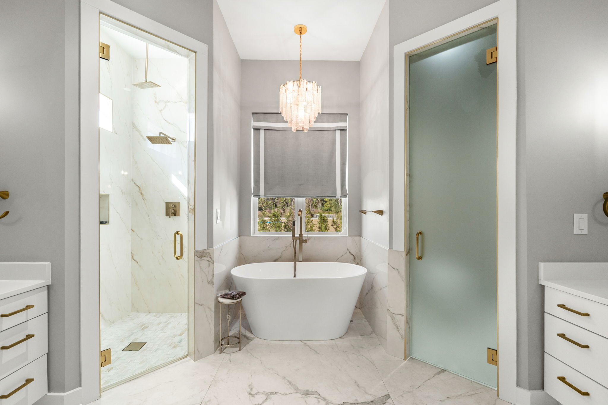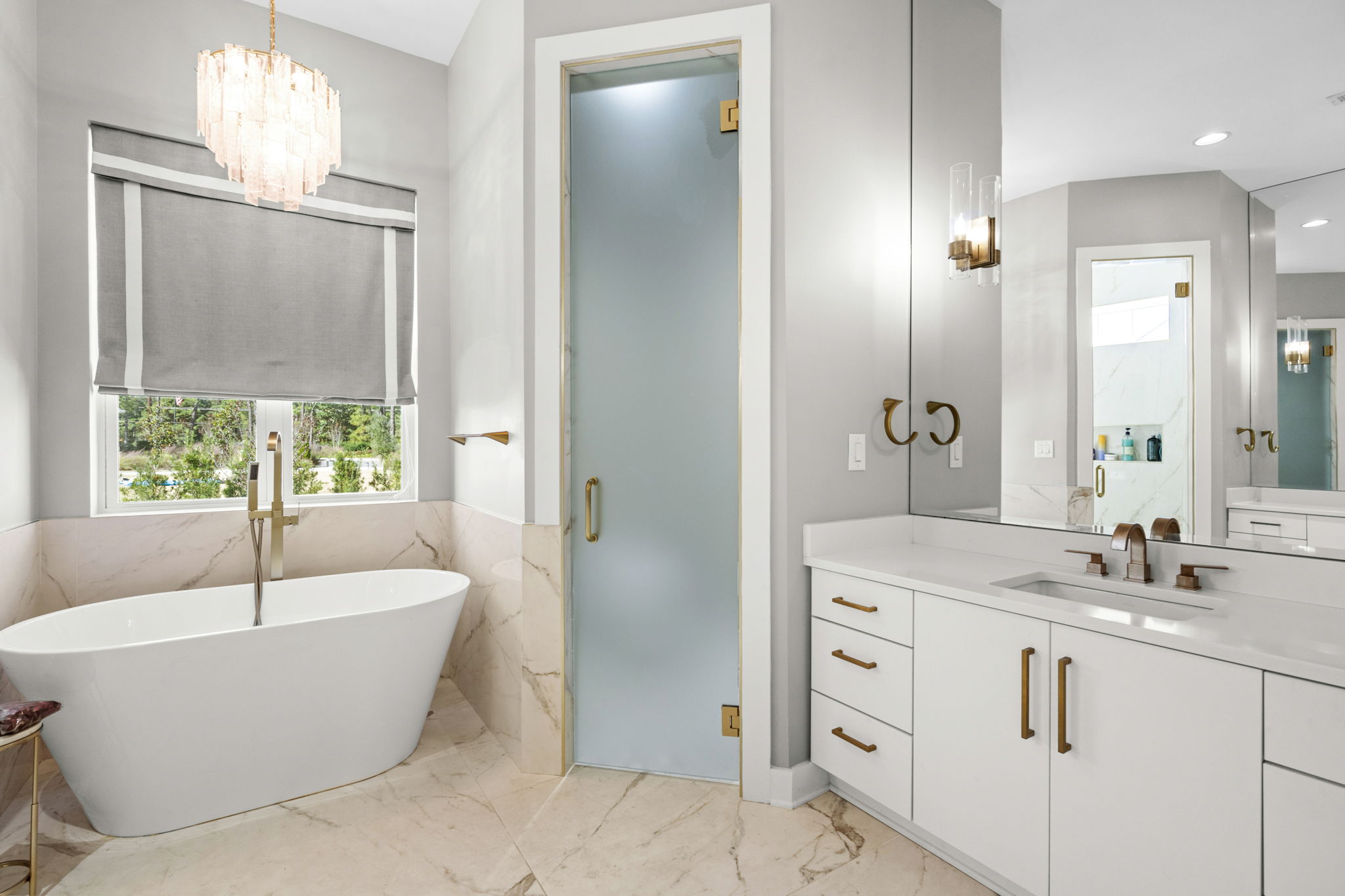The primary suite on the main level offers a tranquil retreat with a spa-inspired bath, freestanding tub, spacious shower, and dual vanities. Upstairs, four additional bedrooms and three full baths provide comfort and flexibility. The fifth bedroom is exceptionally large, allowing for a private living area, home theater, fitness space, or multi-use room.