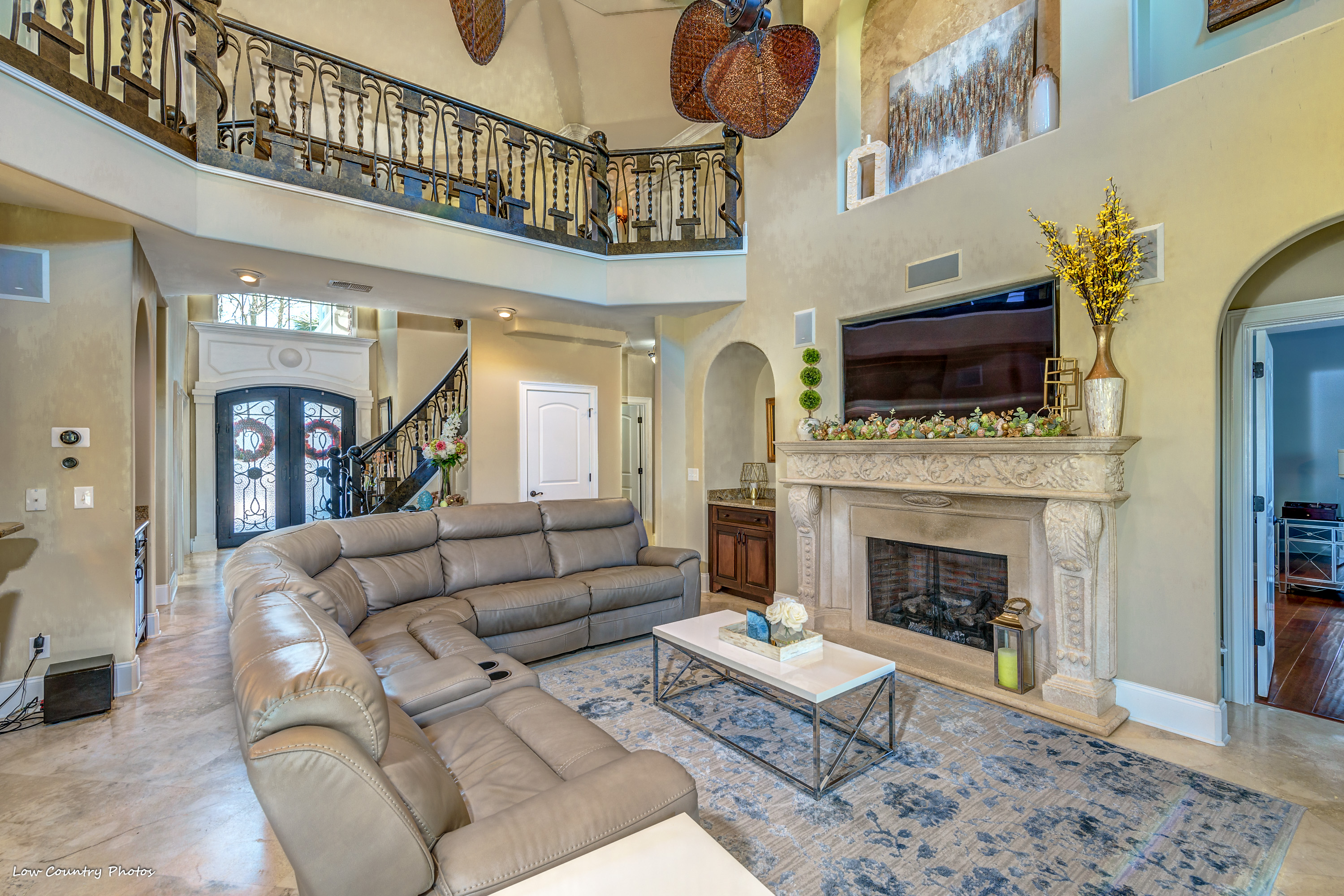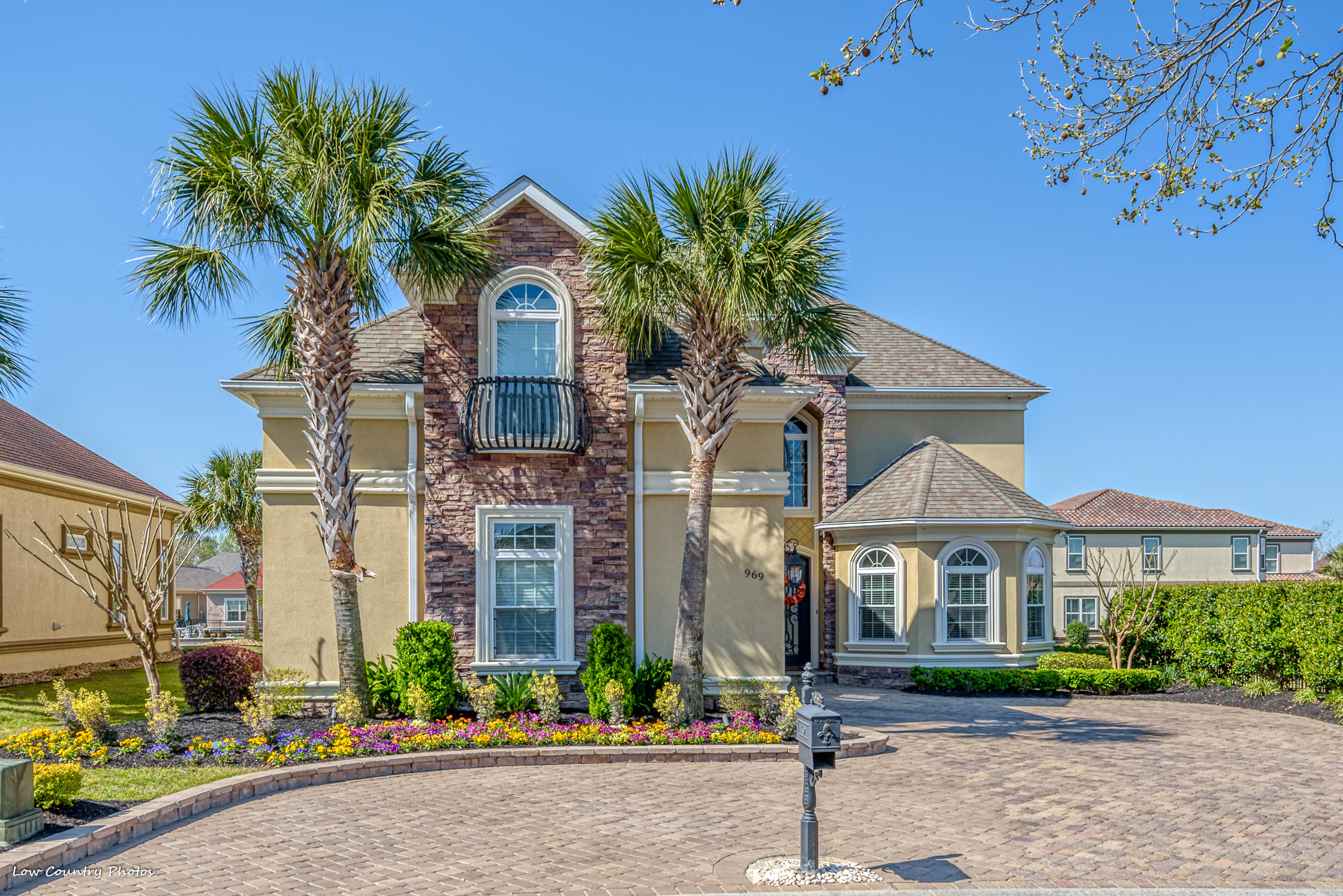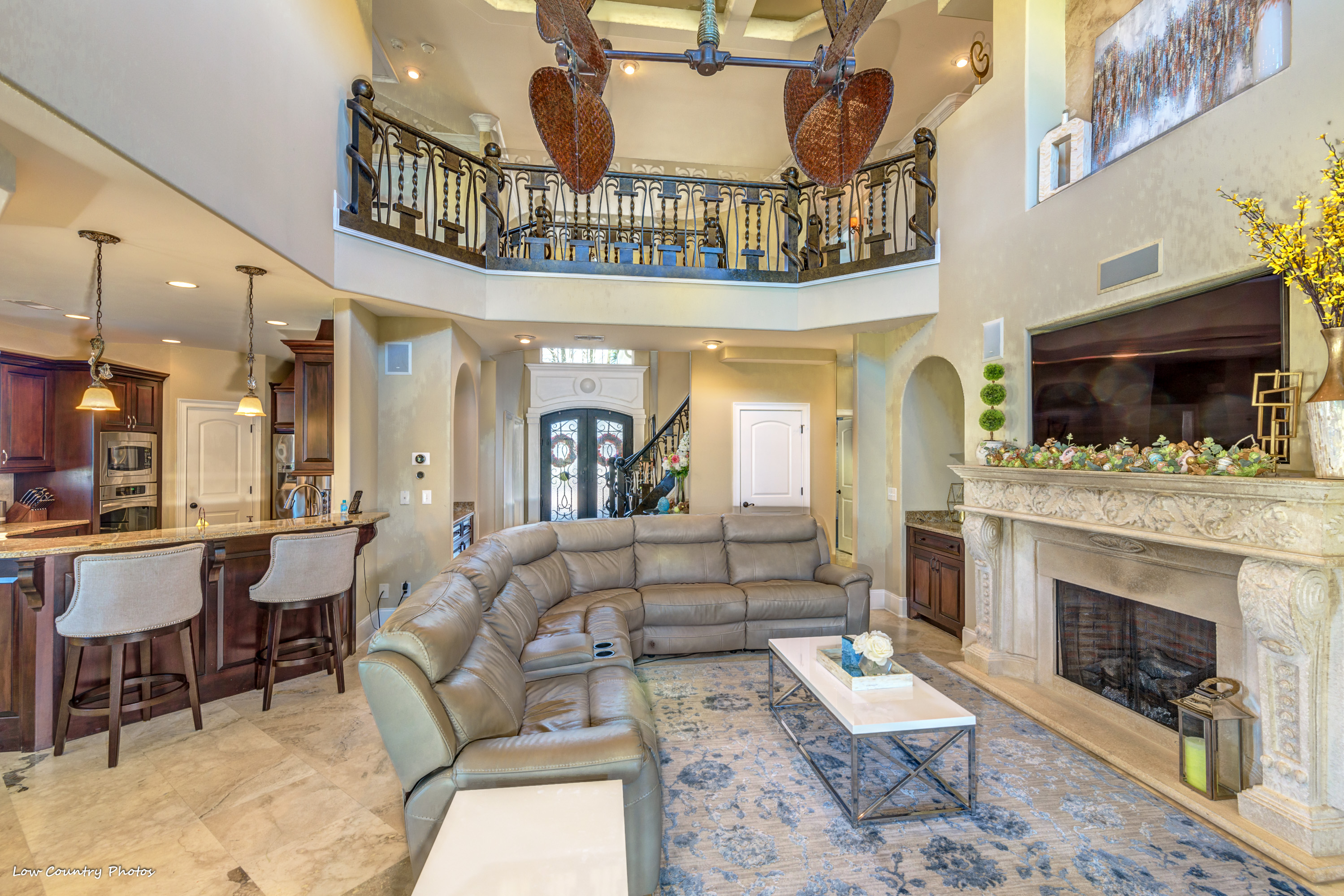 969 Bluffview Drive is a sprawling custom-built Mediterranean Masterpiece. Located in the sought after gated community of The Bluffs on the Waterway, this home has many upmarket features. Just through the cast iron front doors is a one of a kind handcrafted metal staircase handrail. Designed and built by the renowned metal artist Robert Sandlemire, this feature is a site to be seen. In addition to the handrail, accenting the two-story great room is a cast stone fireplace and decorative art niches.
