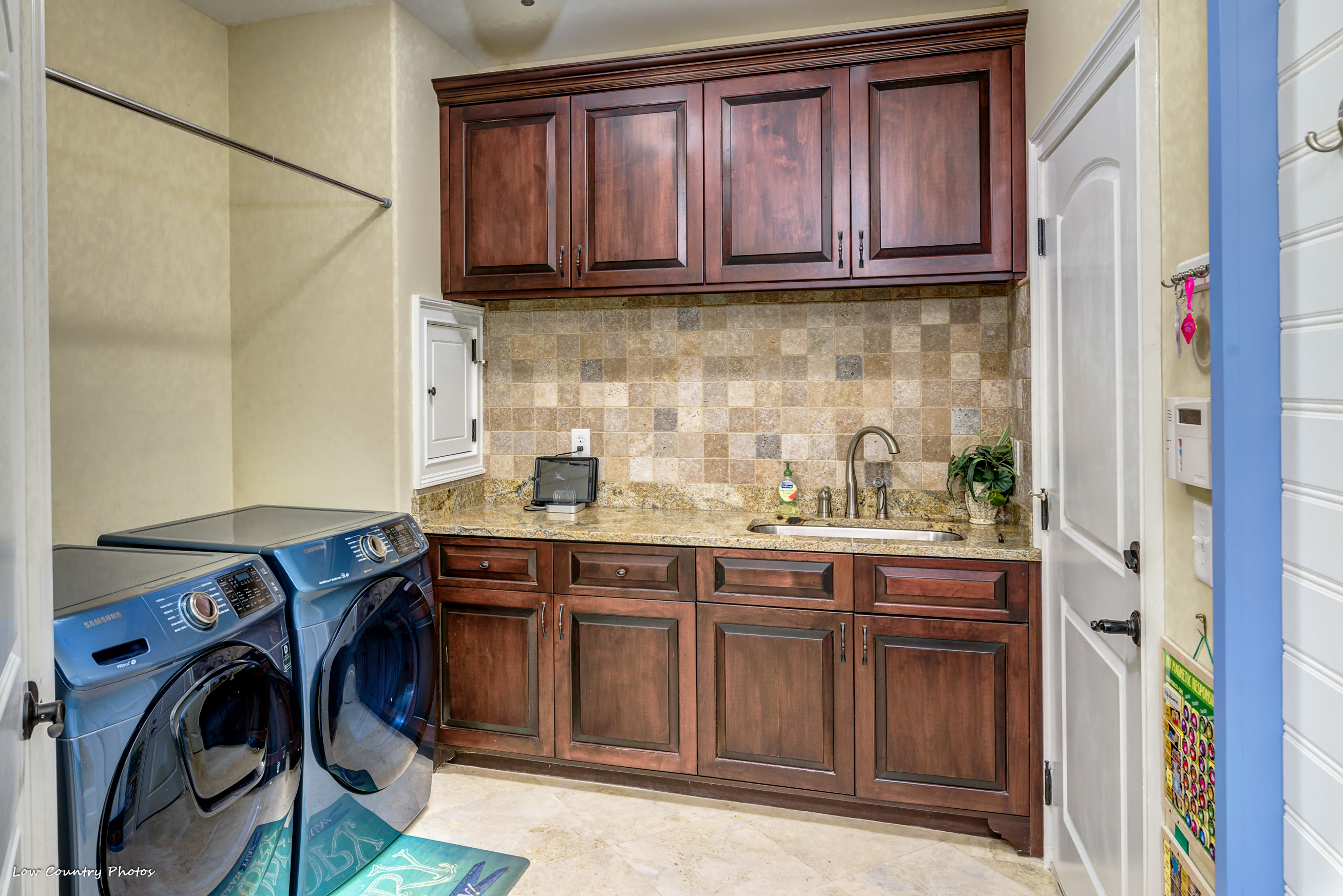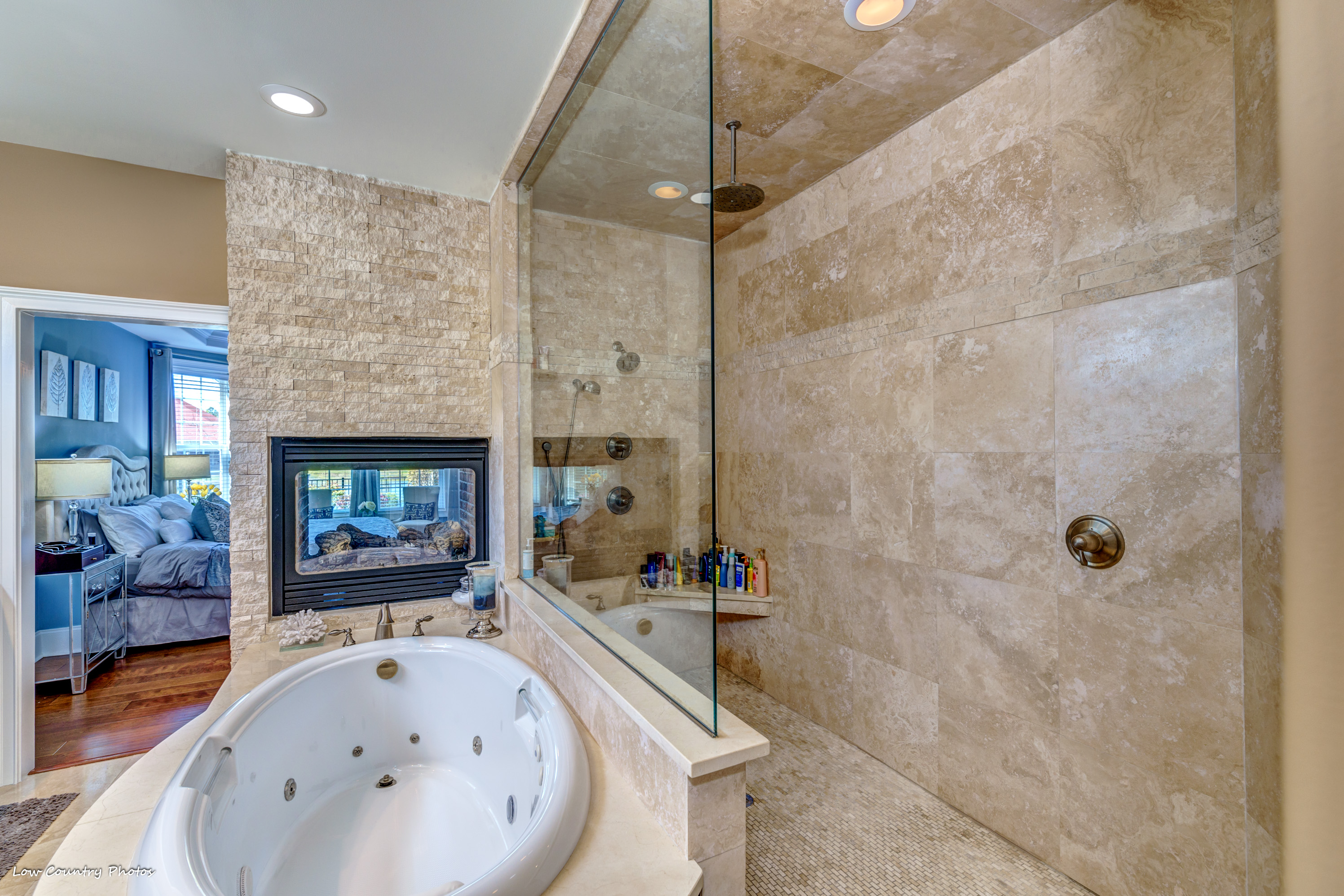 On the main level is a master retreat featuring a double-sided fireplace and en-suite bathroom. After a long day, nothing will relax you more than sitting in the oversized jacuzzi tub by a cozy fire. However, if you are in a rush the floor to ceiling travertine wrapped shower is a great option. In addition to vanity space, the master closet has custom shoe racks, built-ins, and drawer space. This master suite will prove to be your get-a-way from the rigors of the day. Rounding out the first floor are a formal dining room and laundry room with a built-in cubby drop off station.