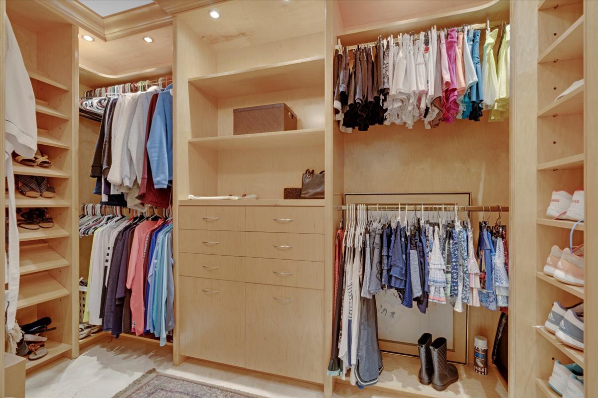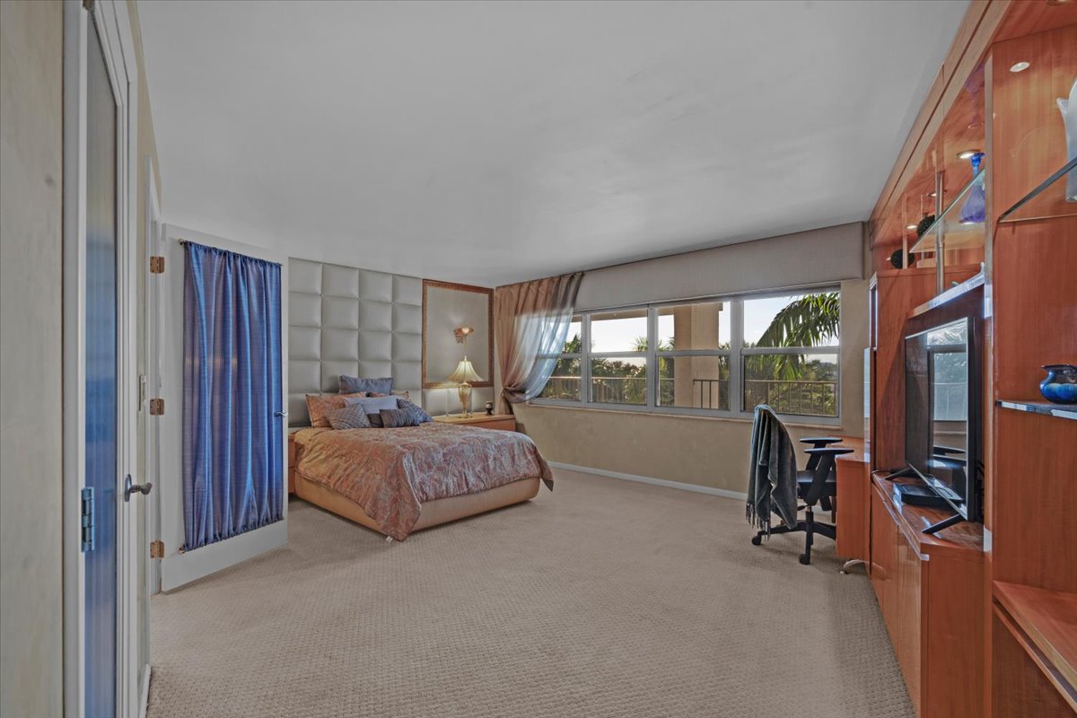 The allure of direct oceanfront living is epitomized in the expansive master suite, which features private balcony access, his and hers closets with custom wood built-ins, and an indulgent master bath, showcasing the grandeur of this exquisite home.
