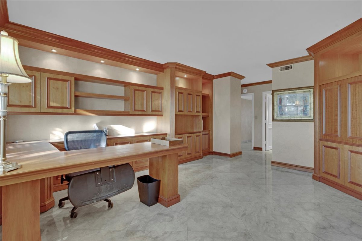 The living area is enhanced by a wet bar, custom built-ins, and a cozy fireplace, while the large second bedroom comes with an en suite bathroom equipped with a Jacuzzi tub and walk-in shower. The third bedroom, ingeniously converted into a dual-purpose office with retractable twin beds, illustrates the thoughtful design that allows for a seamless blend of work and leisure.