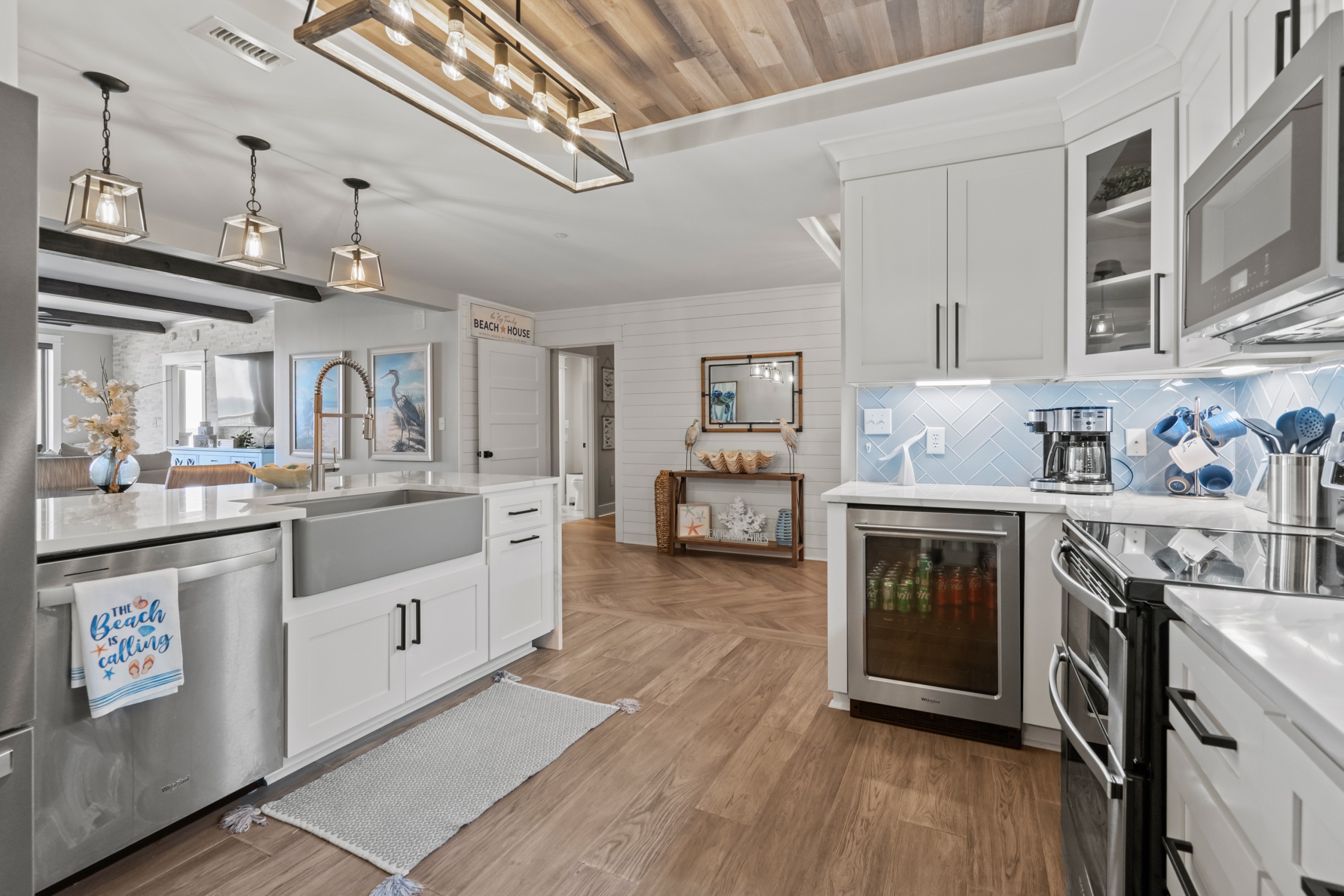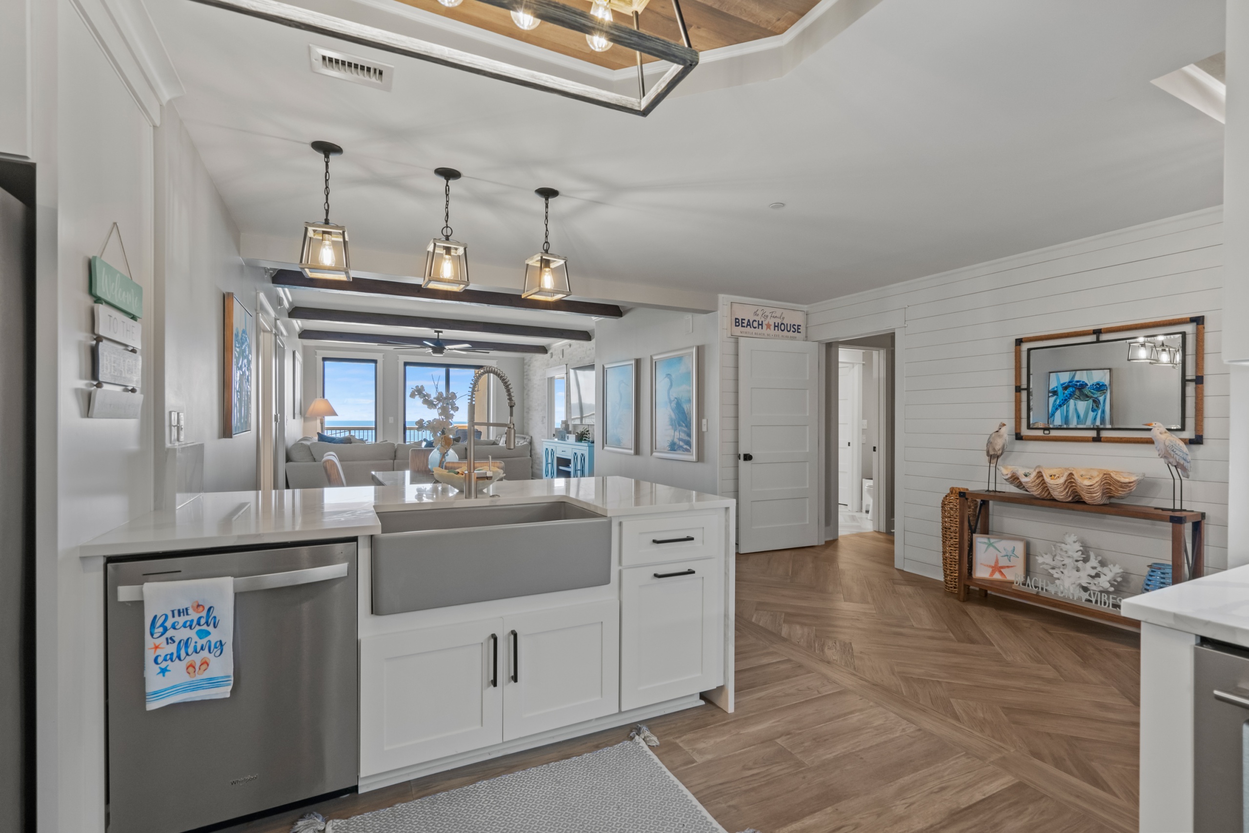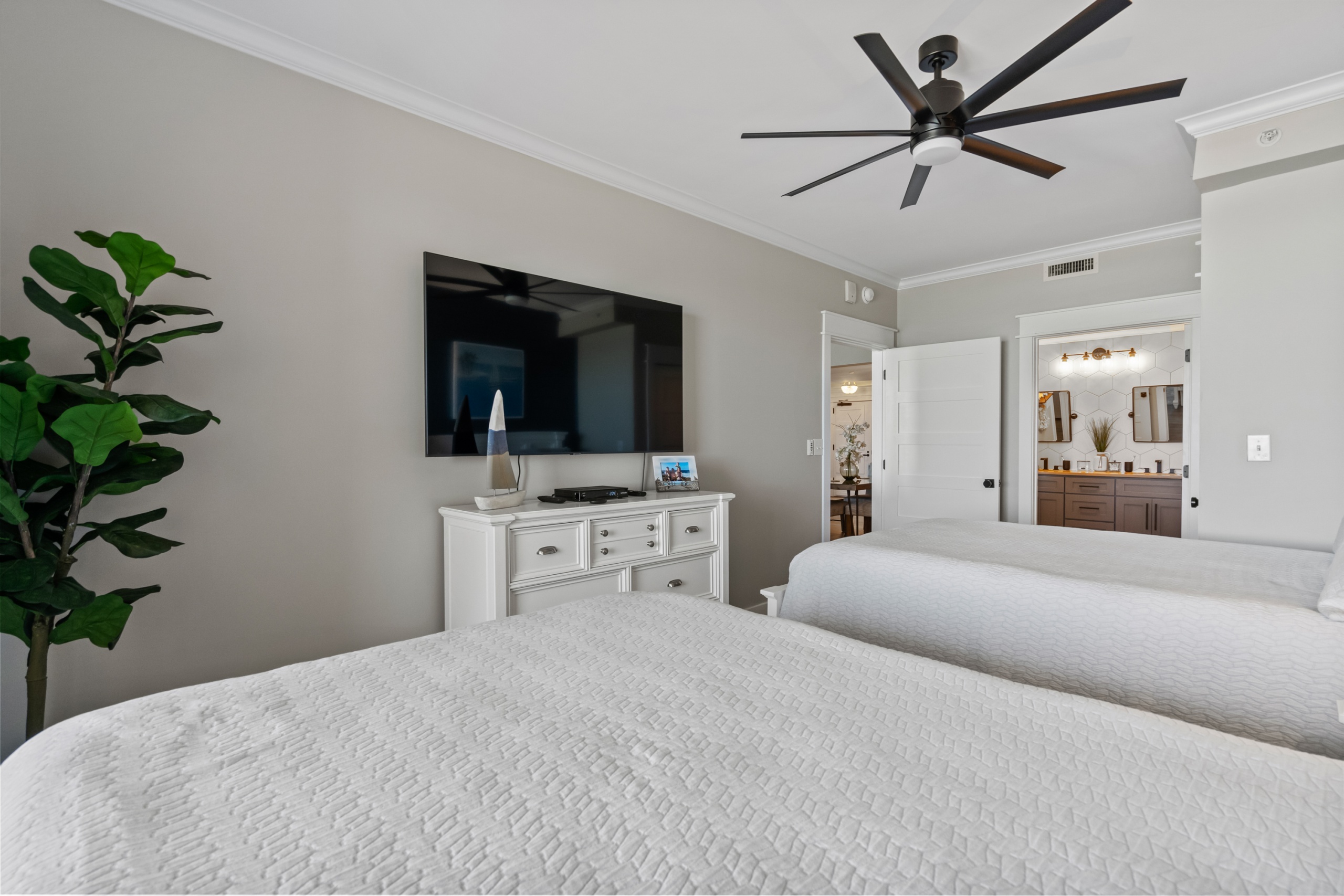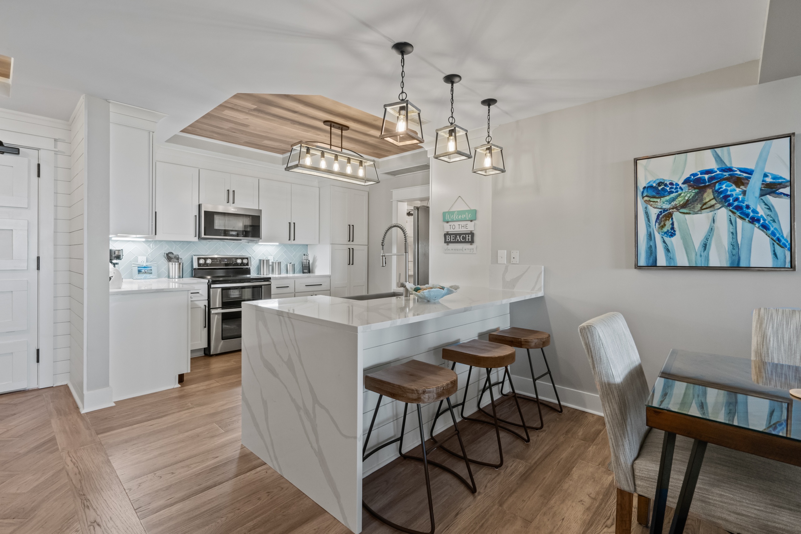 Every detail has been considered, from new electrical and plumbing features to Woodtrac shelving in the closets. The home also comes equipped with brand-new, top-tier appliances and wall-mounted TVs in each room. The condo is fully furnished with new furniture, including the patio set, and it's all tastefully accented by freshly painted walls, added shiplap, and faux beams in the living rooms.