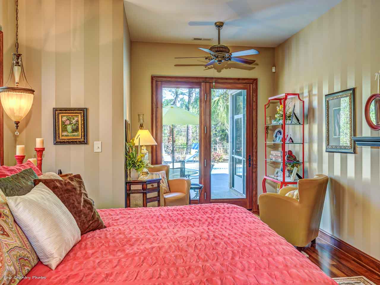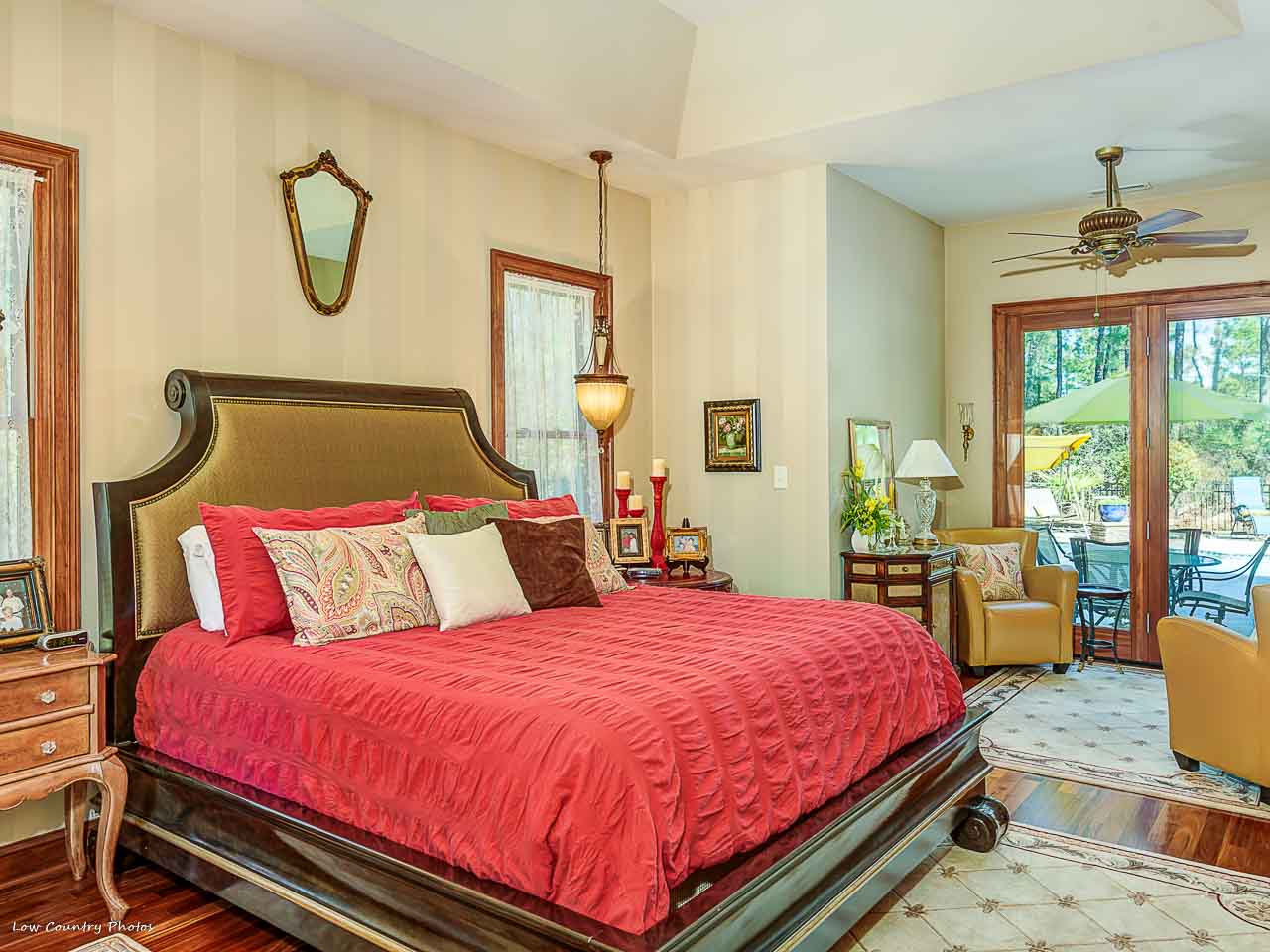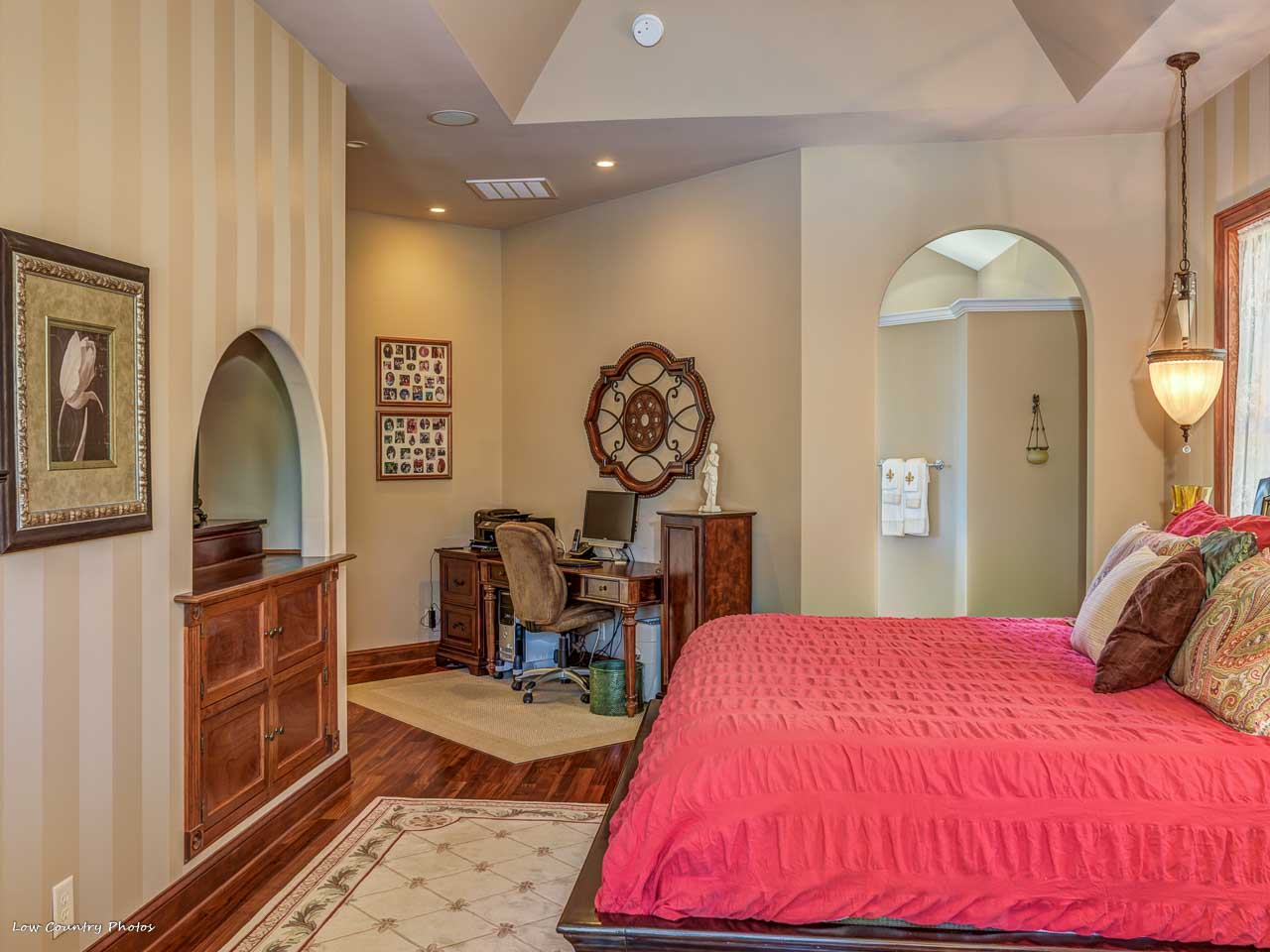The oversized first-floor master retreat has an ensuite bathroom an open-air shower, dual pedestal sinks, and large walk-in closet with built-ins. Additionally, the master suite has a sitting area and a nook with room for a desk. A French Door leads from this bedroom to the private backyard oasis.