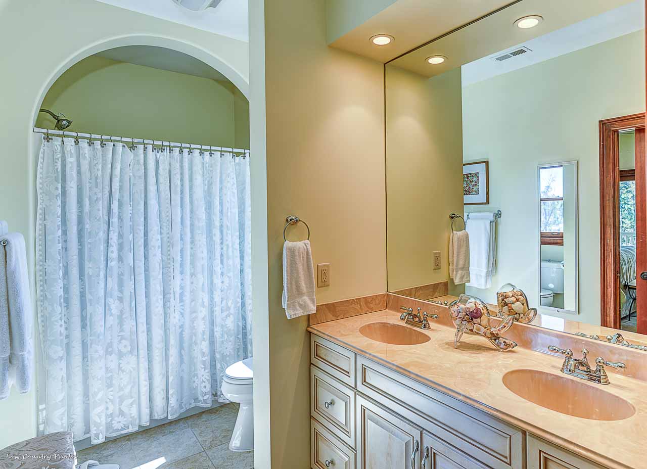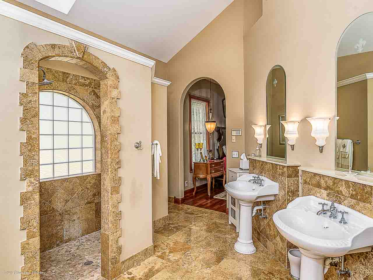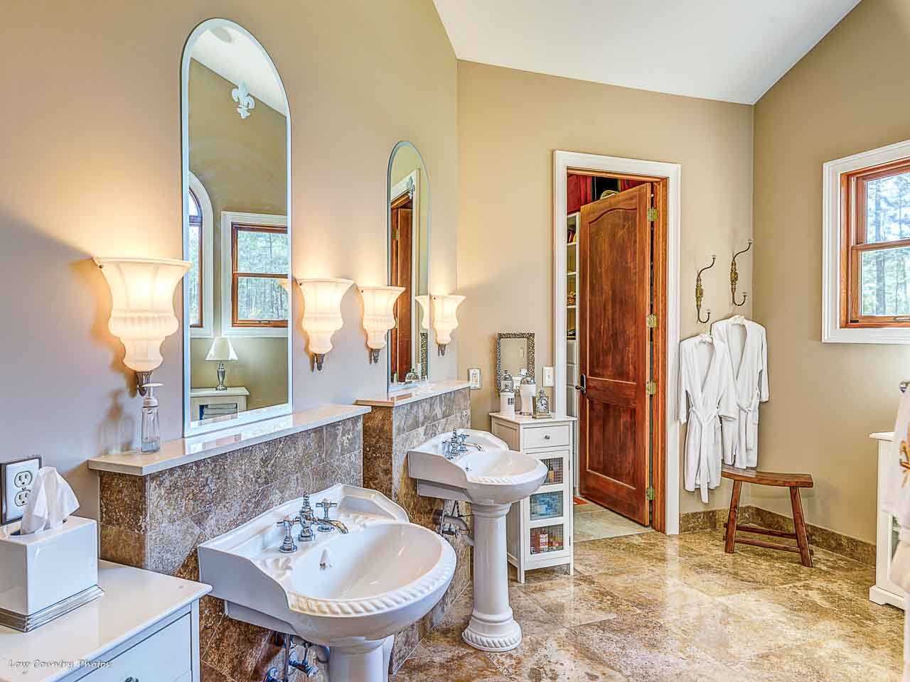The oversized first-floor master retreat has an ensuite bathroom an open-air shower, dual pedestal sinks, and large walk-in closet with built-ins. Additionally, the master suite has a sitting area and a nook with room for a desk. A French Door leads from this bedroom to the private backyard oasis.