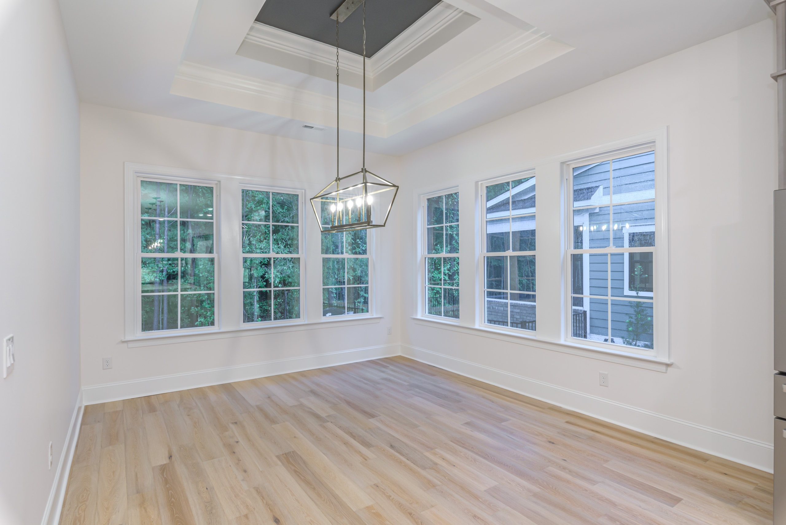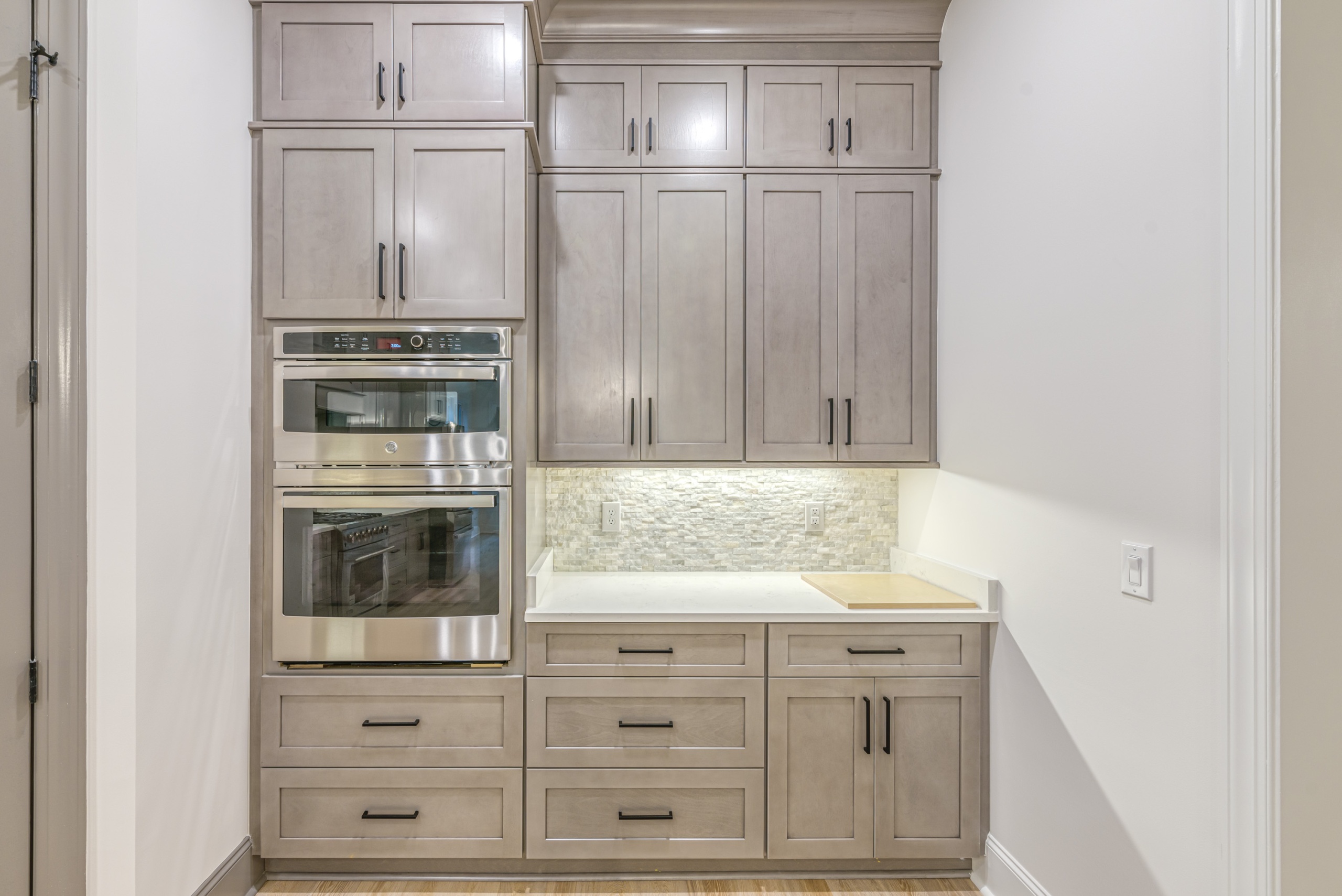Entertaining is effortless in the spacious living areas, which showcase beam or tray ceilings adorned with craftsman moldings. The living room adds a cozy ambiance with its accent fireplace and bar area, complete with a beverage center. The chef’s dream kitchen is equipped with a double oven, high-end appliances, abundant cabinet space, a large work island, and a walk-in pantry.