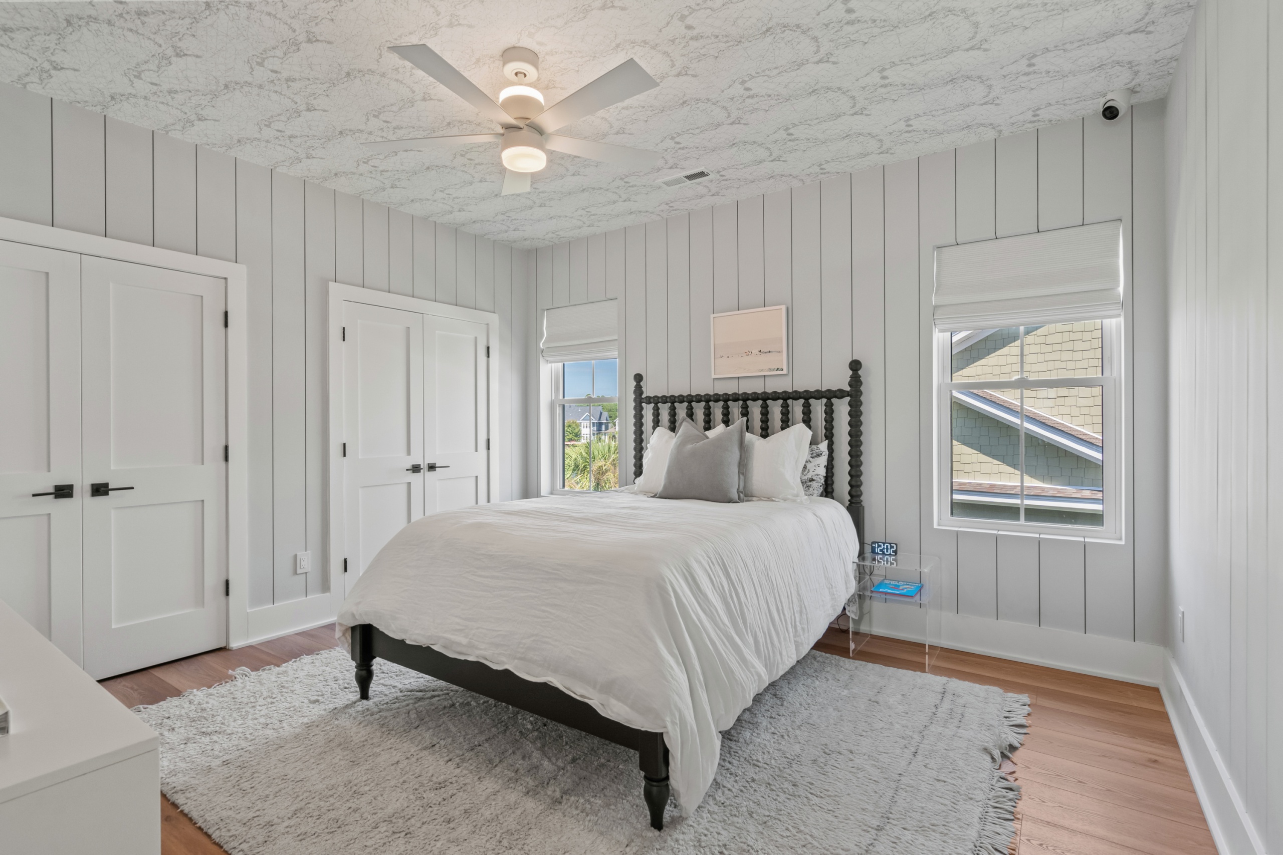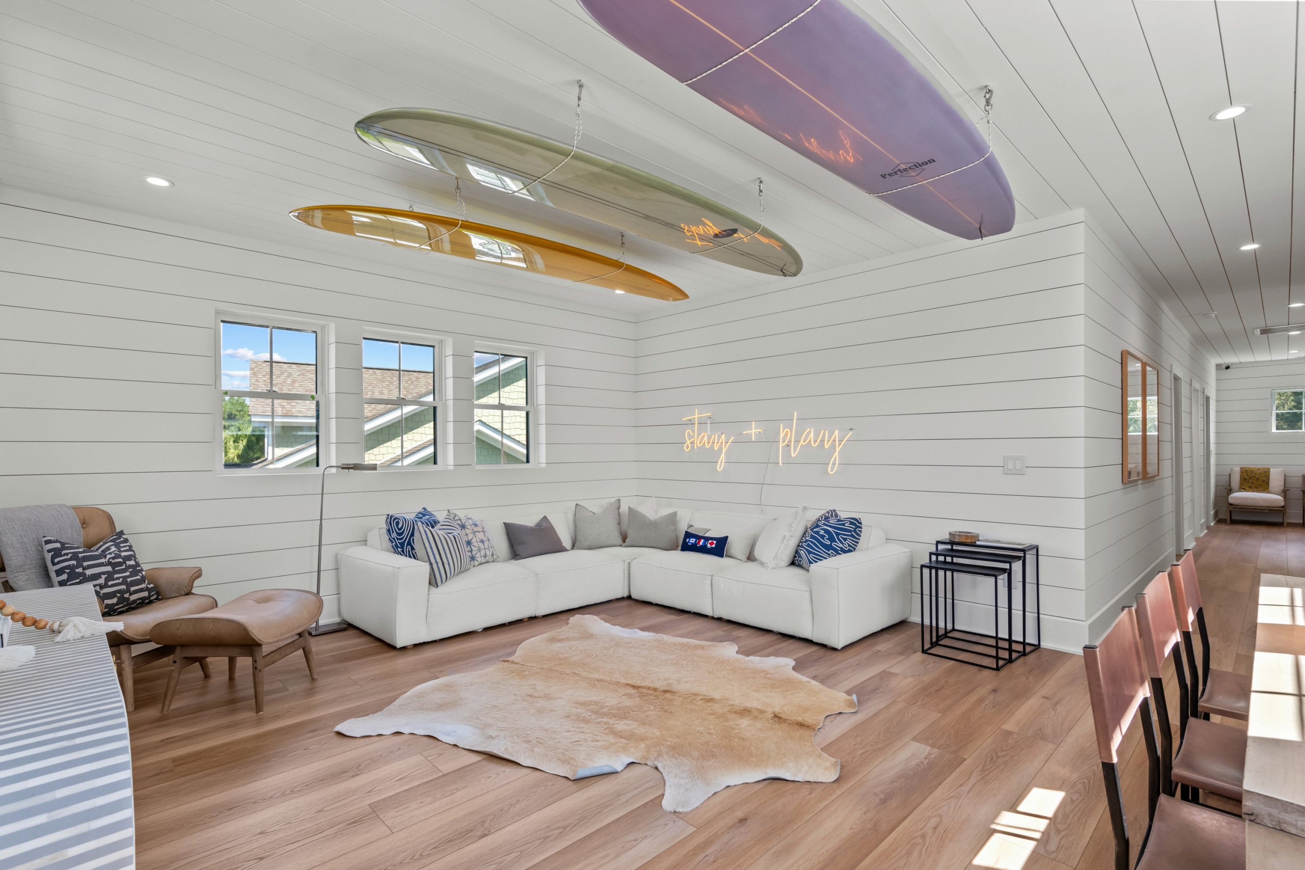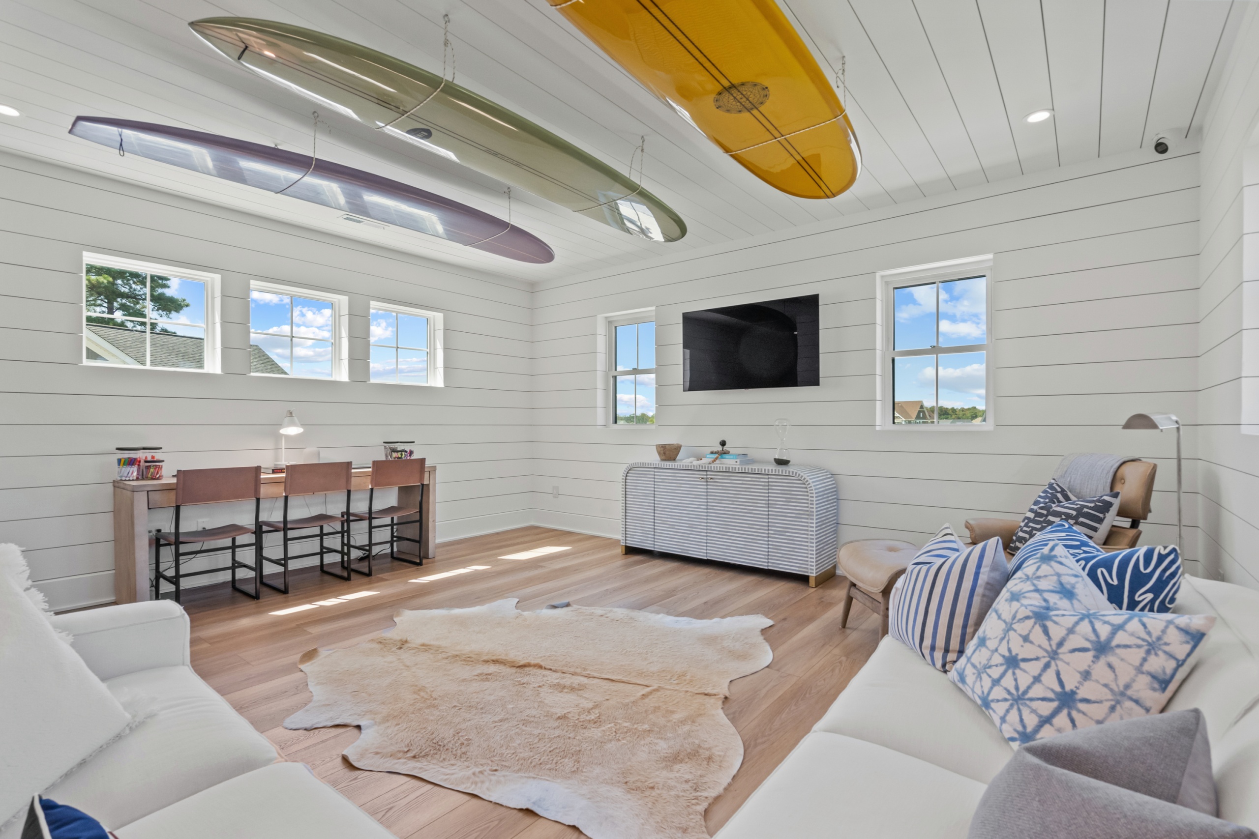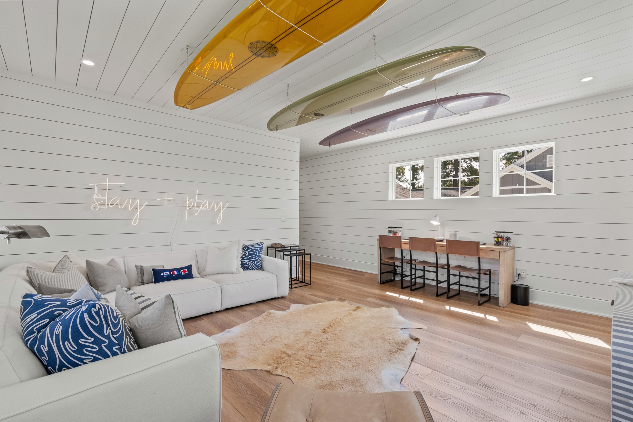 As you ascend to the upper level, you'll discover two bedrooms, a bonus room, and a loft area. The shared wet room offers a spa-like experience with a soaking tub and impeccable marble and Italian tile finishes. Throughout the master bath and laundry room, these luxurious materials further emphasize the home's opulence. Custom hardwood beams sourced from the Cape Fear River impart character and charm throughout the property.