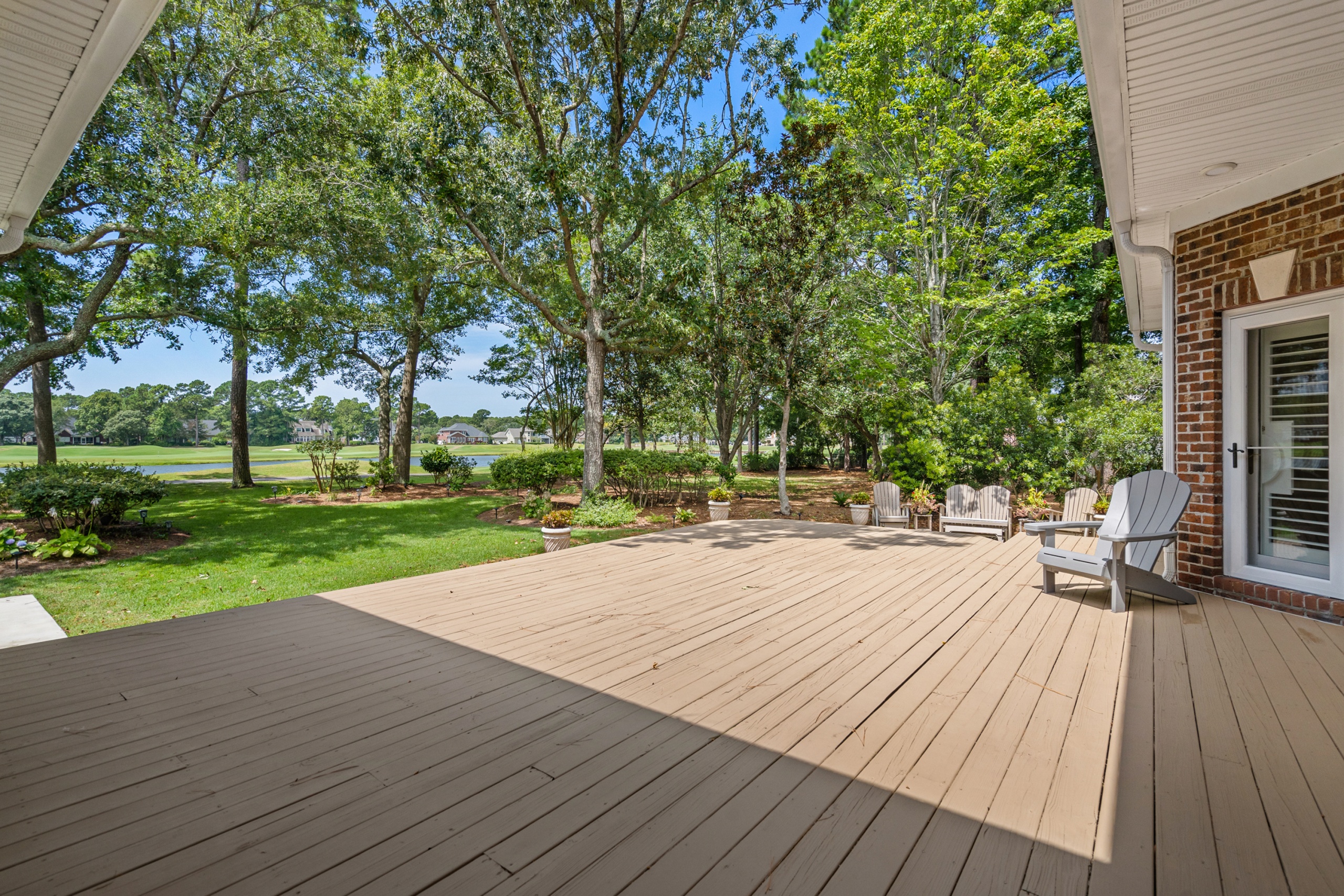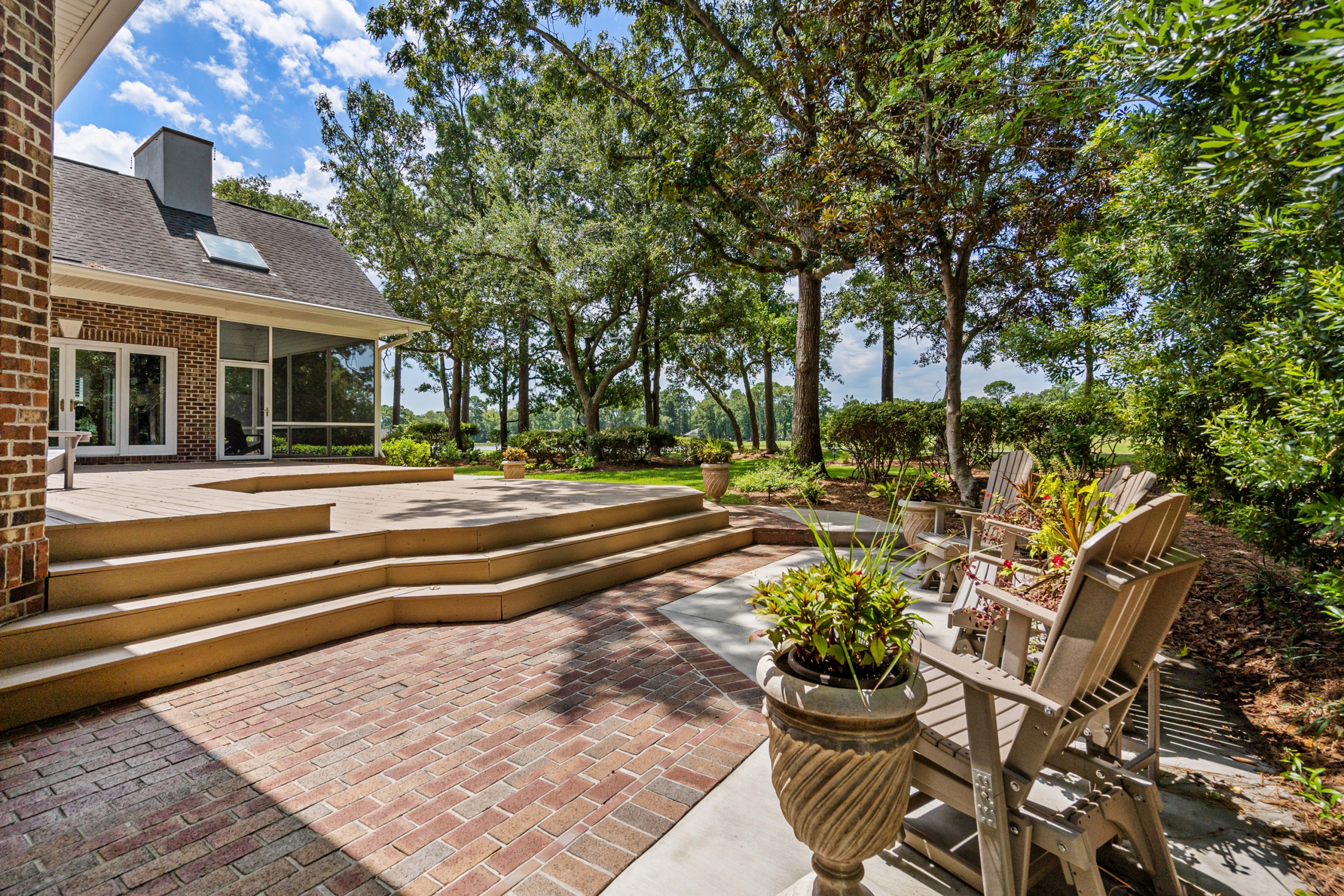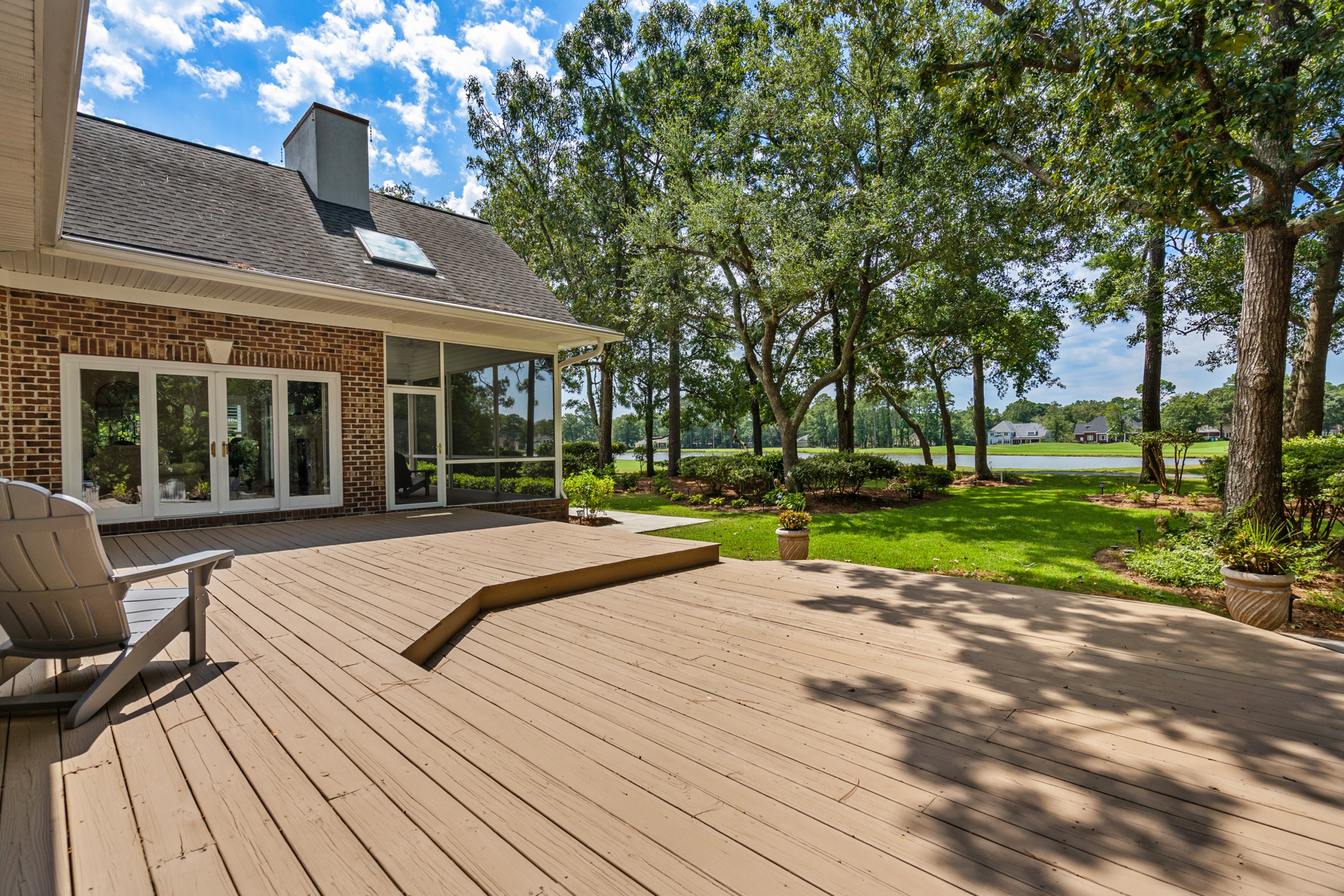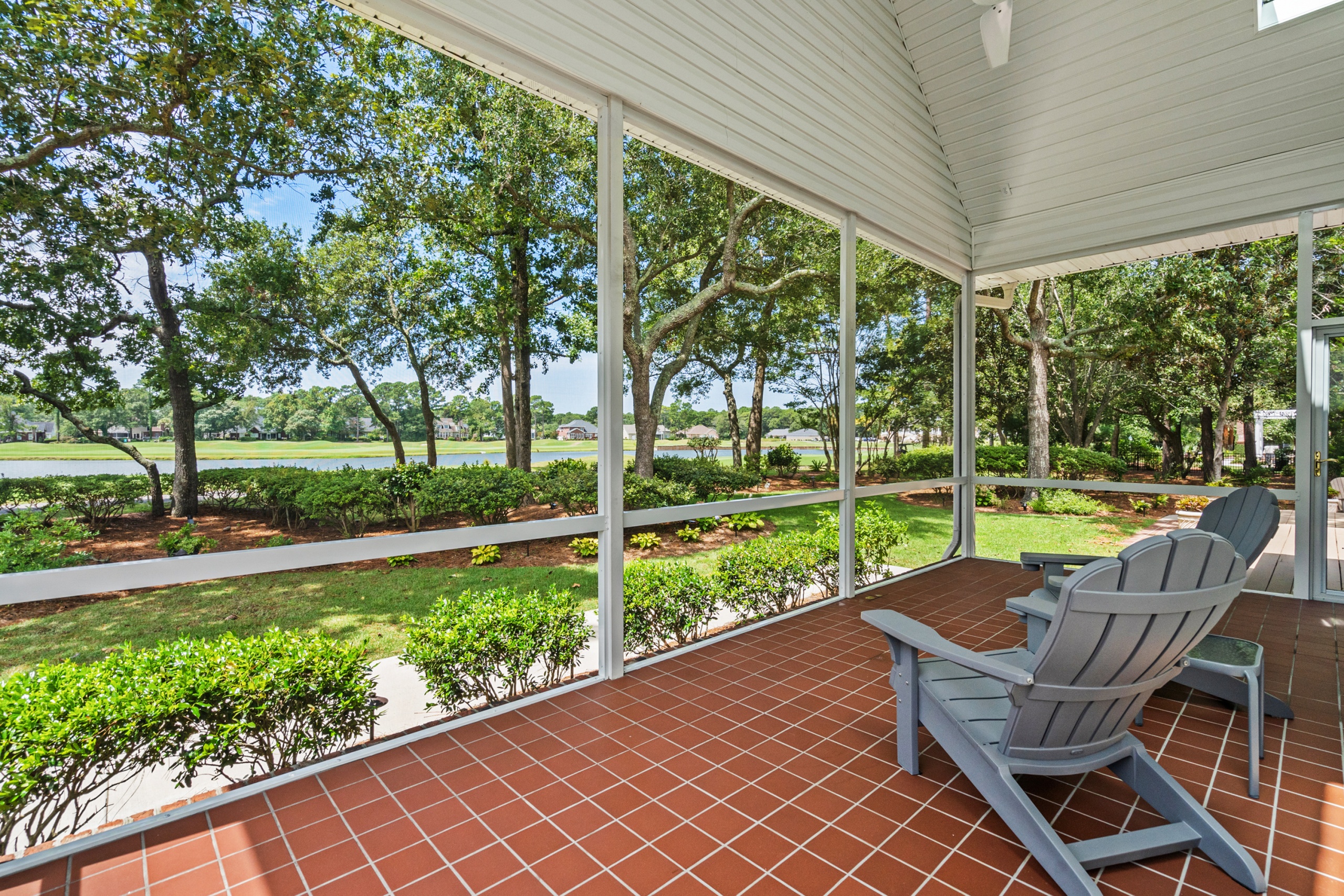 The home’s outdoor spaces promise endless moments of peace and joy. With the golf course fairways in sight, the large deck, patio, and screen porch offer ample space for relaxation. The community facilities, including the pool, cabana, and tennis courts, make every day feel like a vacation.