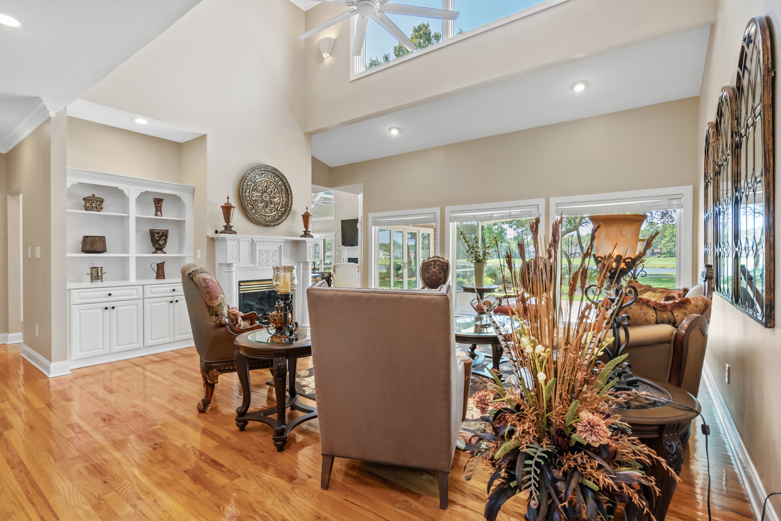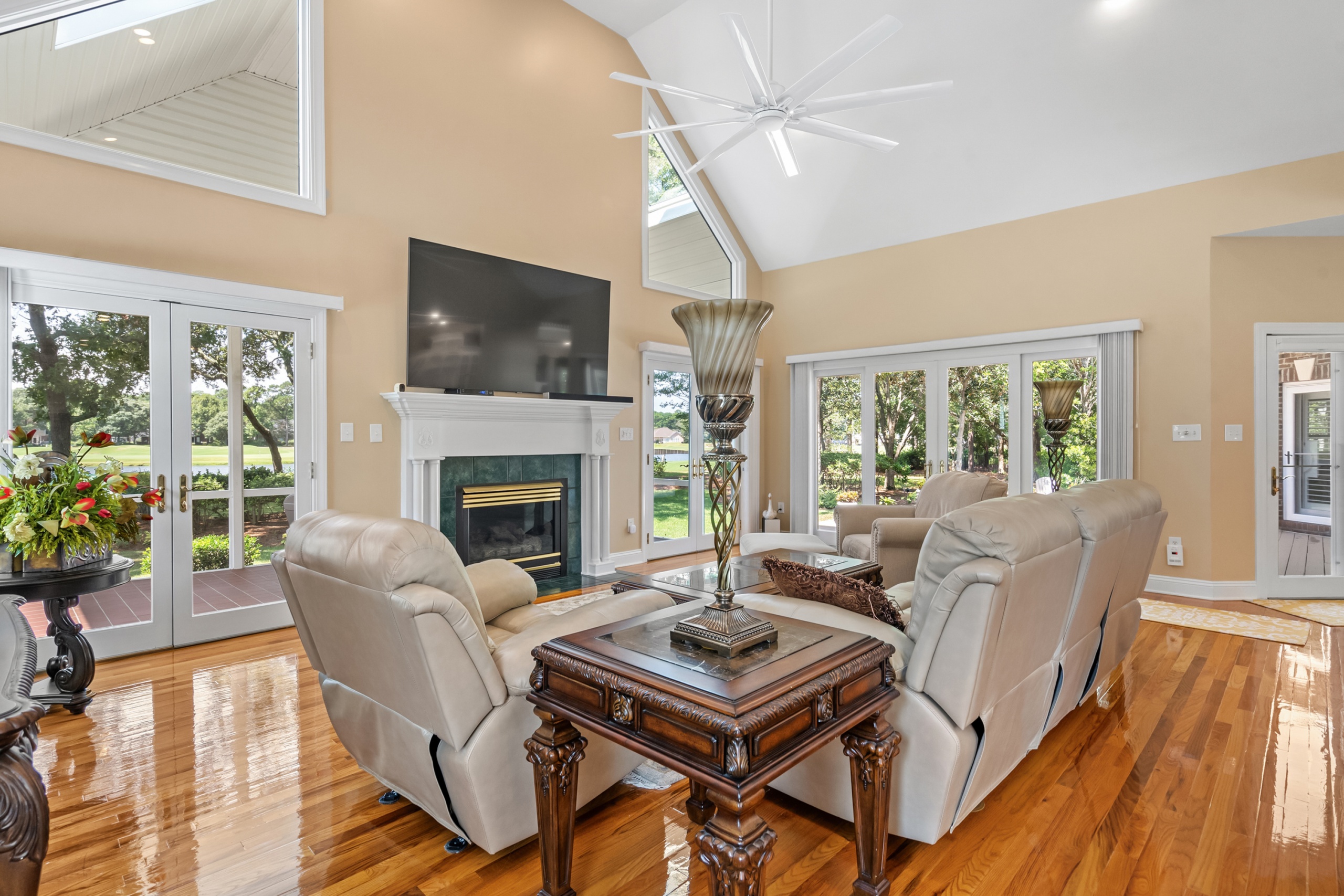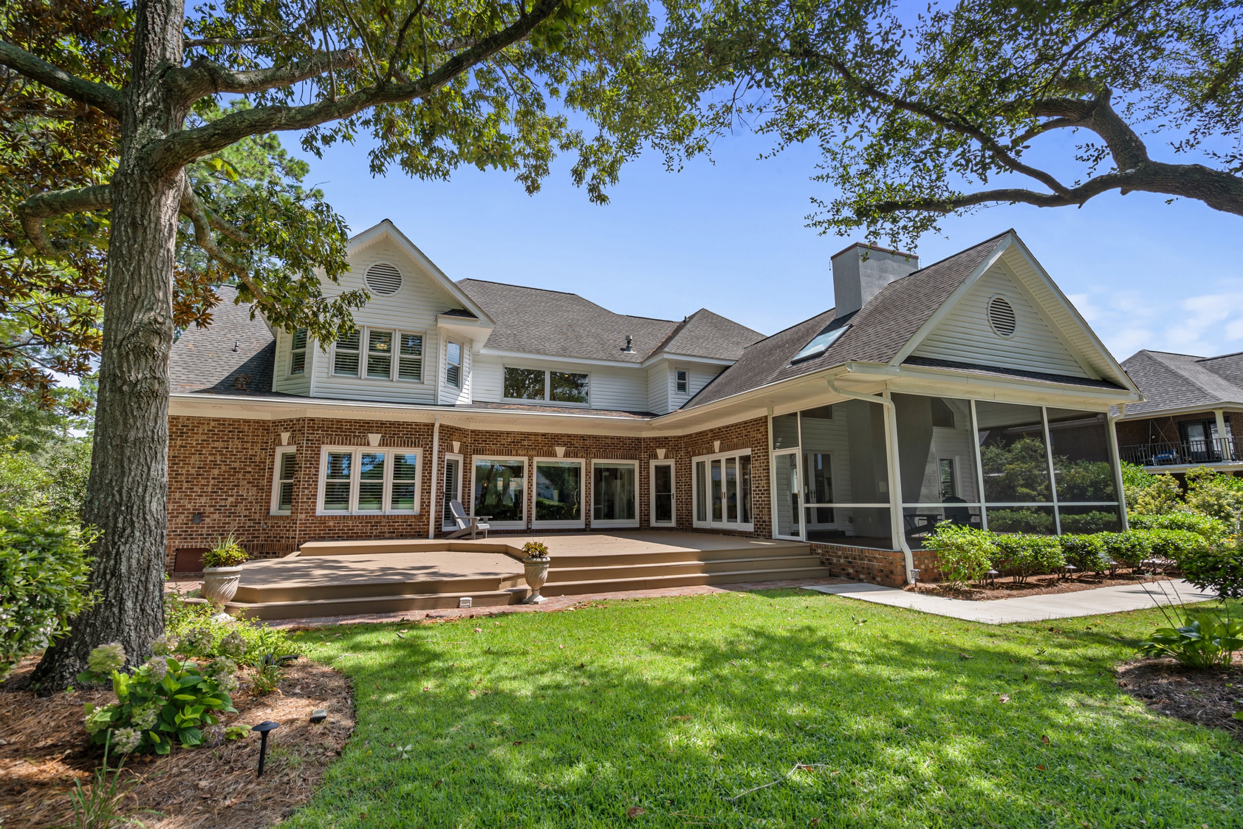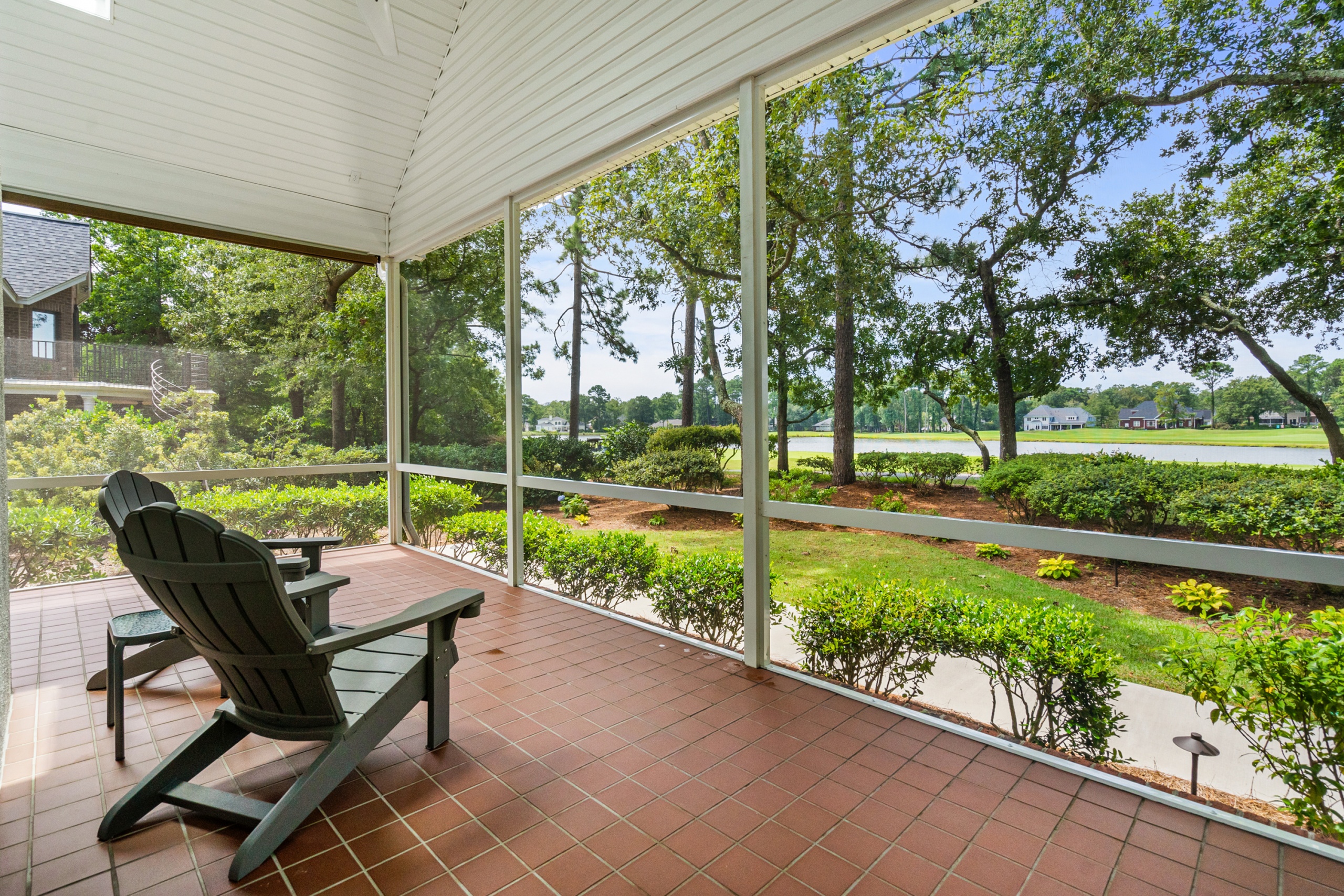 The home’s outdoor spaces promise endless moments of peace and joy. With the golf course fairways in sight, the large deck, patio, and screen porch offer ample space for relaxation. The community facilities, including the pool, cabana, and tennis courts, make every day feel like a vacation.