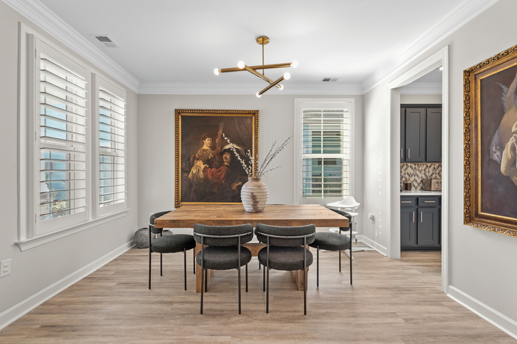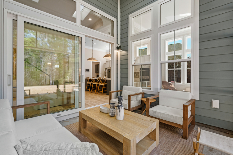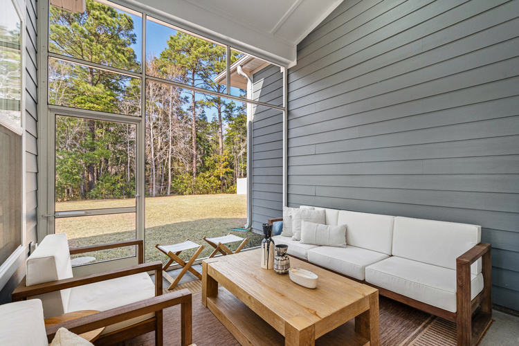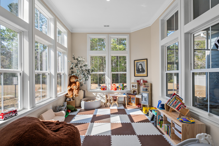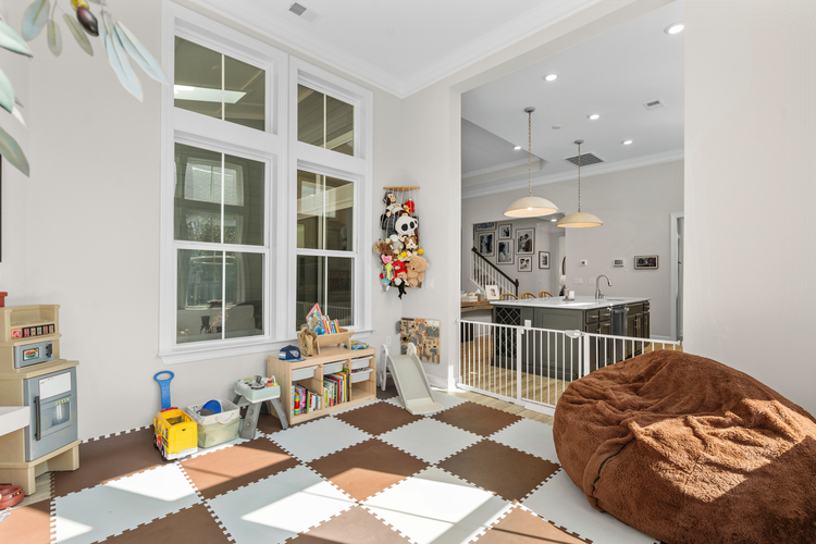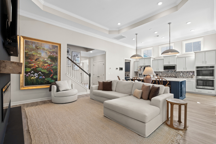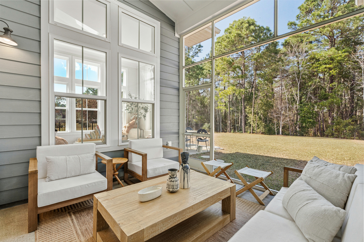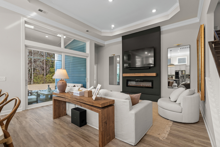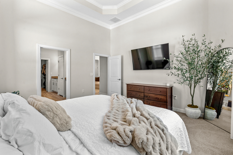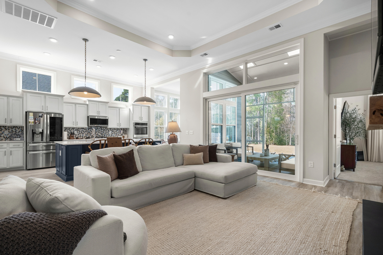 Designed with an open floor plan, this home features soaring 12-foot ceilings in the living area and master bedroom, creating a bright, airy atmosphere. The heart of the home is the expansive great room, where natural light pours in through oversized sliding glass doors. The adjacent gourmet kitchen is a dream for entertainers, offering a large island with ample counter space and seating. A private dining room seamlessly connects to the great room, sunroom, and covered porch, making it easy to host gatherings or enjoy a quiet evening at home.