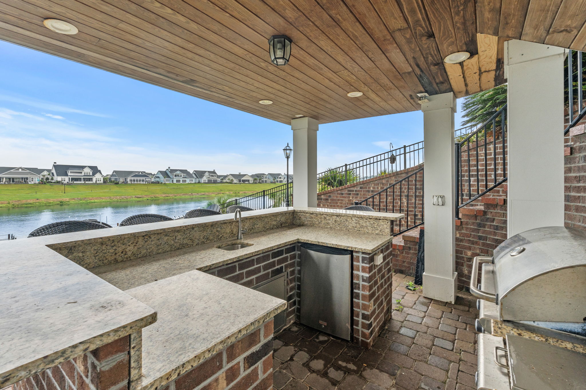 Full outdoor kitchen with built-in grill, fridge, sink, and granite counters