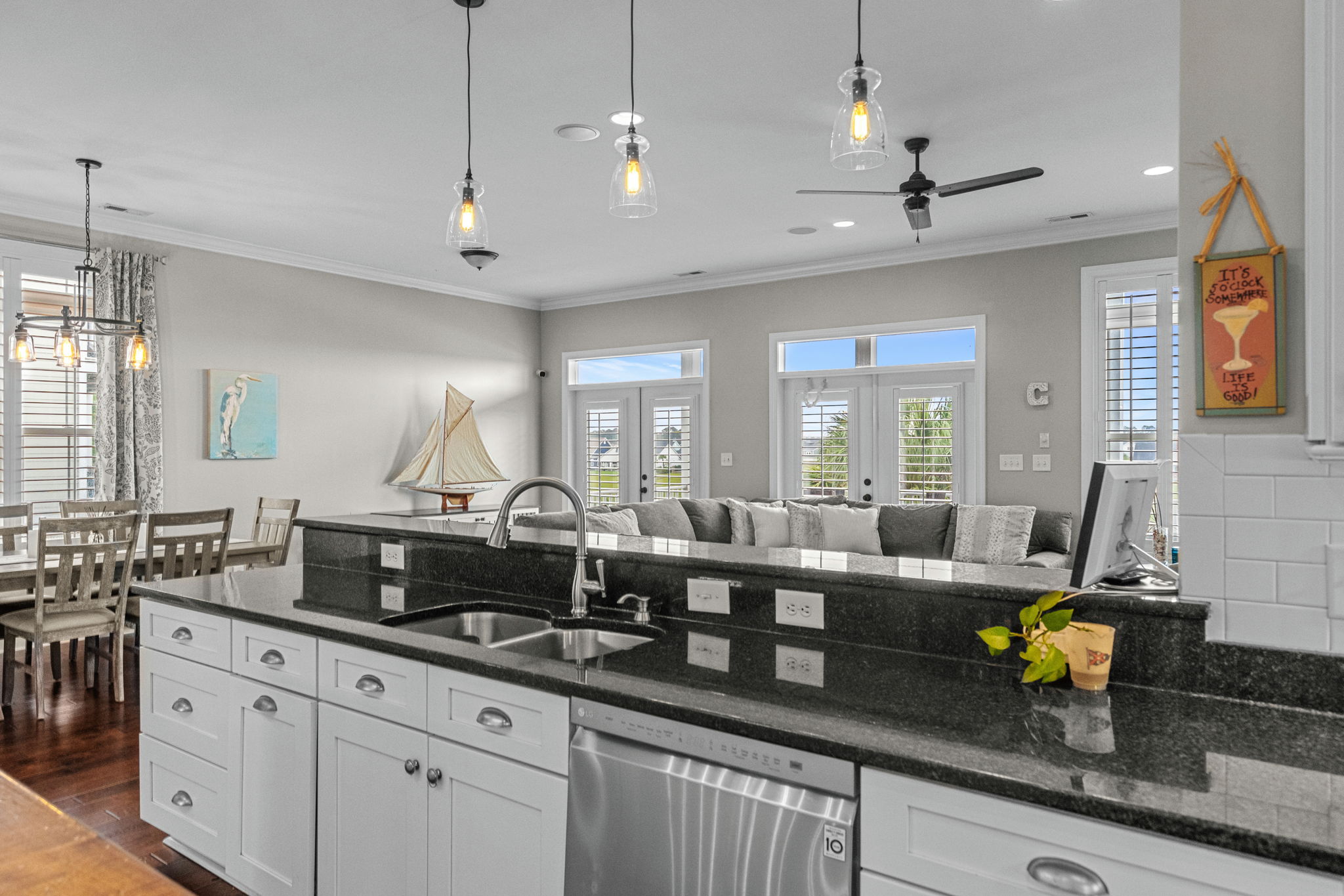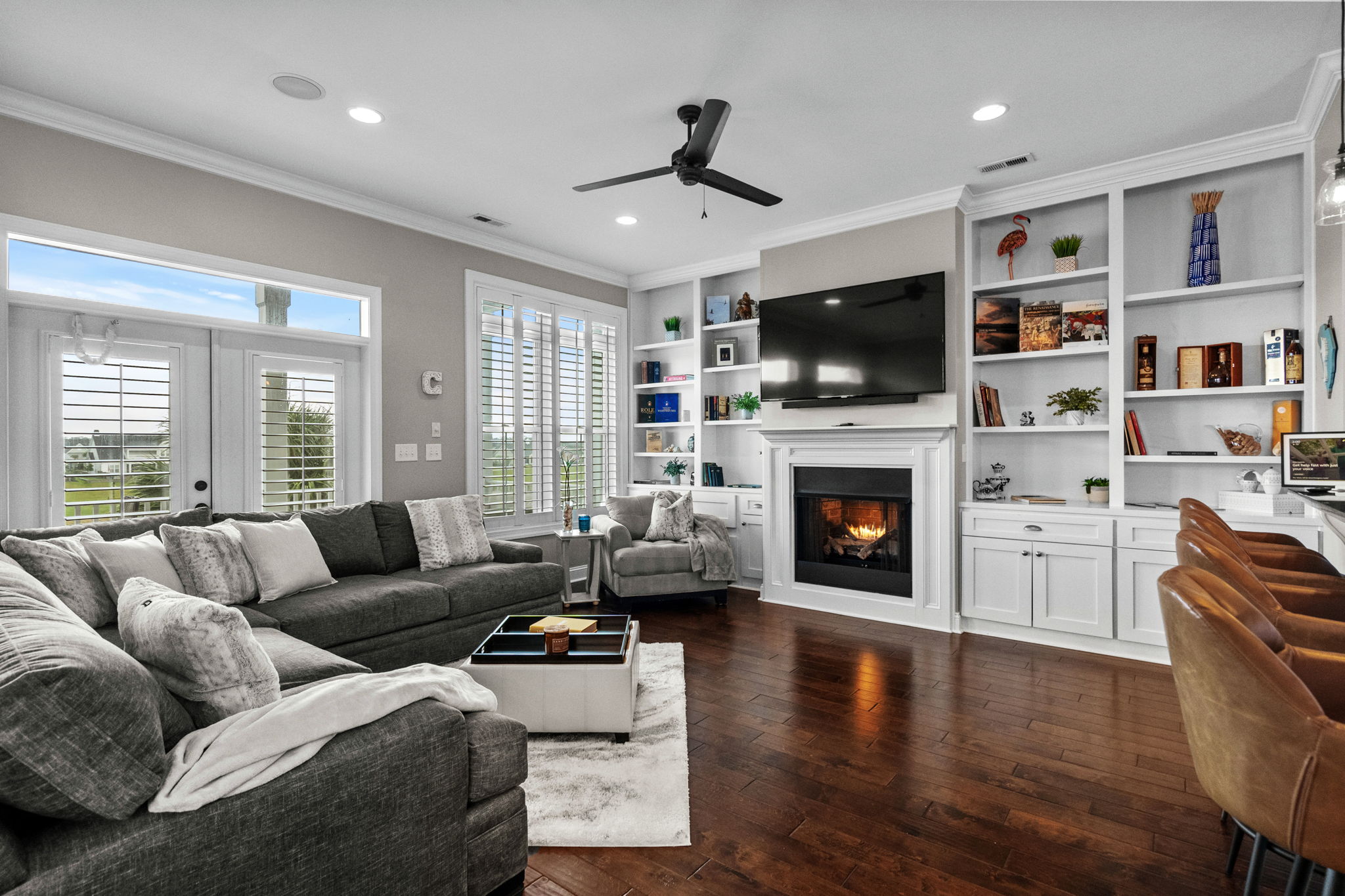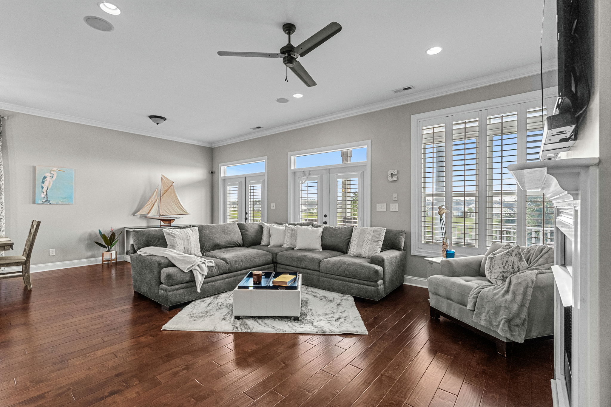 Two sets of French doors open from the living room onto the large rear covered porch. This is where you’ll sip morning coffee while watching the world wake up on the Waterway or unwind in the evening as the sky changes color.