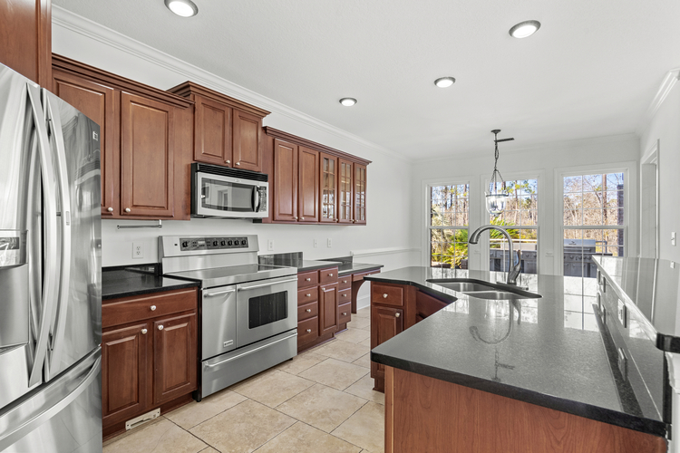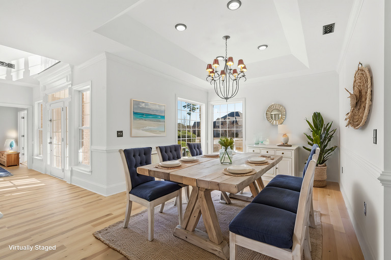 Step inside to an inviting two-story foyer leading to a light-filled great room with soaring ceilings. The open floor plan highlights a chef's kitchen featuring granite countertops, stainless steel appliances, a breakfast bar, and a nook for casual dining. For formal occasions, the elegant dining room sets the stage for intimate gatherings.
