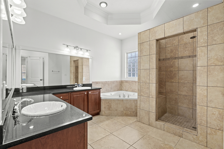 The spacious primary suite, a true retreat, boasts a double tray ceiling, jetted tub, walk-in shower, dual vanity, and an expansive walk-in closet. The first-floor split bedroom design includes two guest rooms and a full bath, while the second floor offers a large bedroom, full bath, and a versatile bonus room.