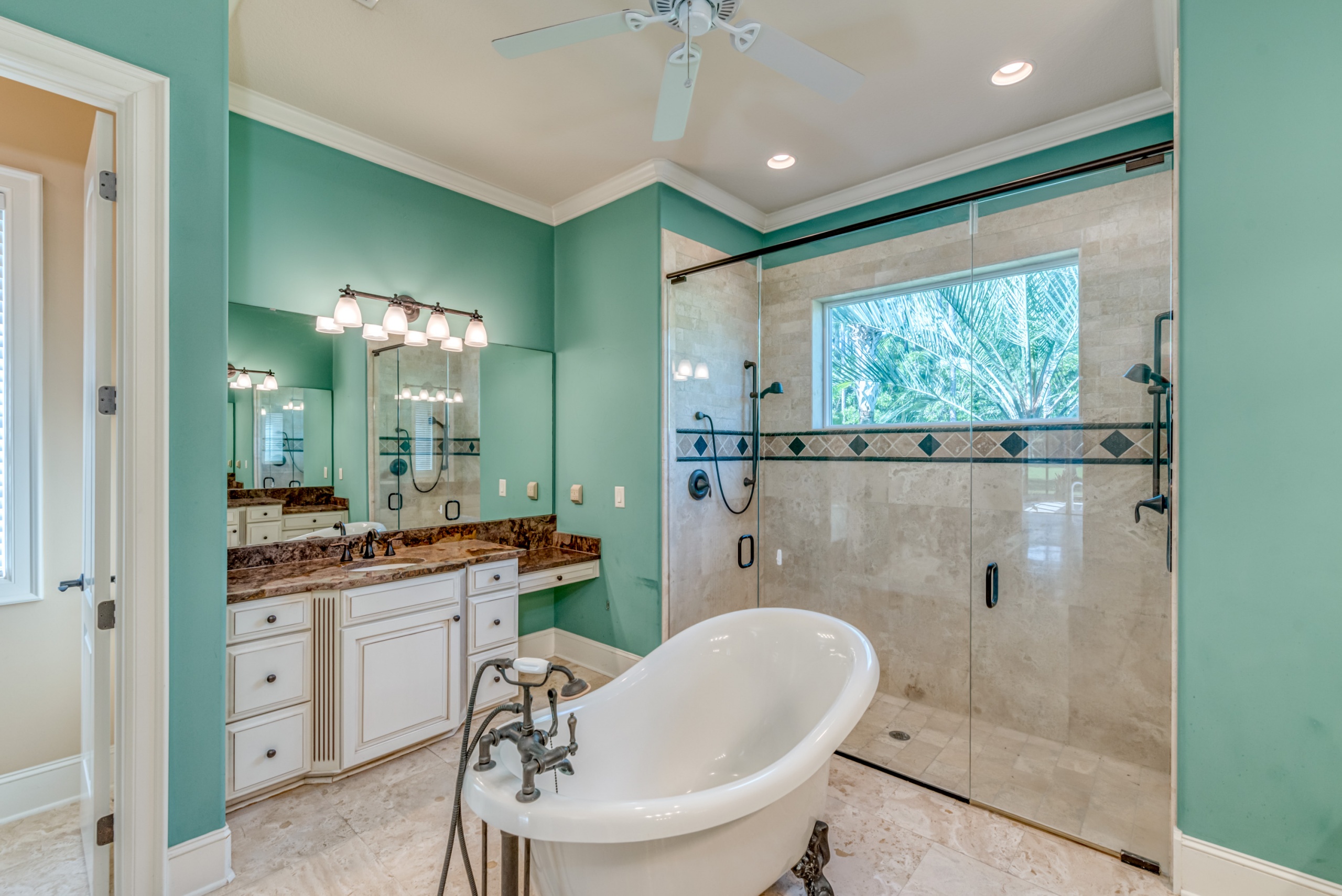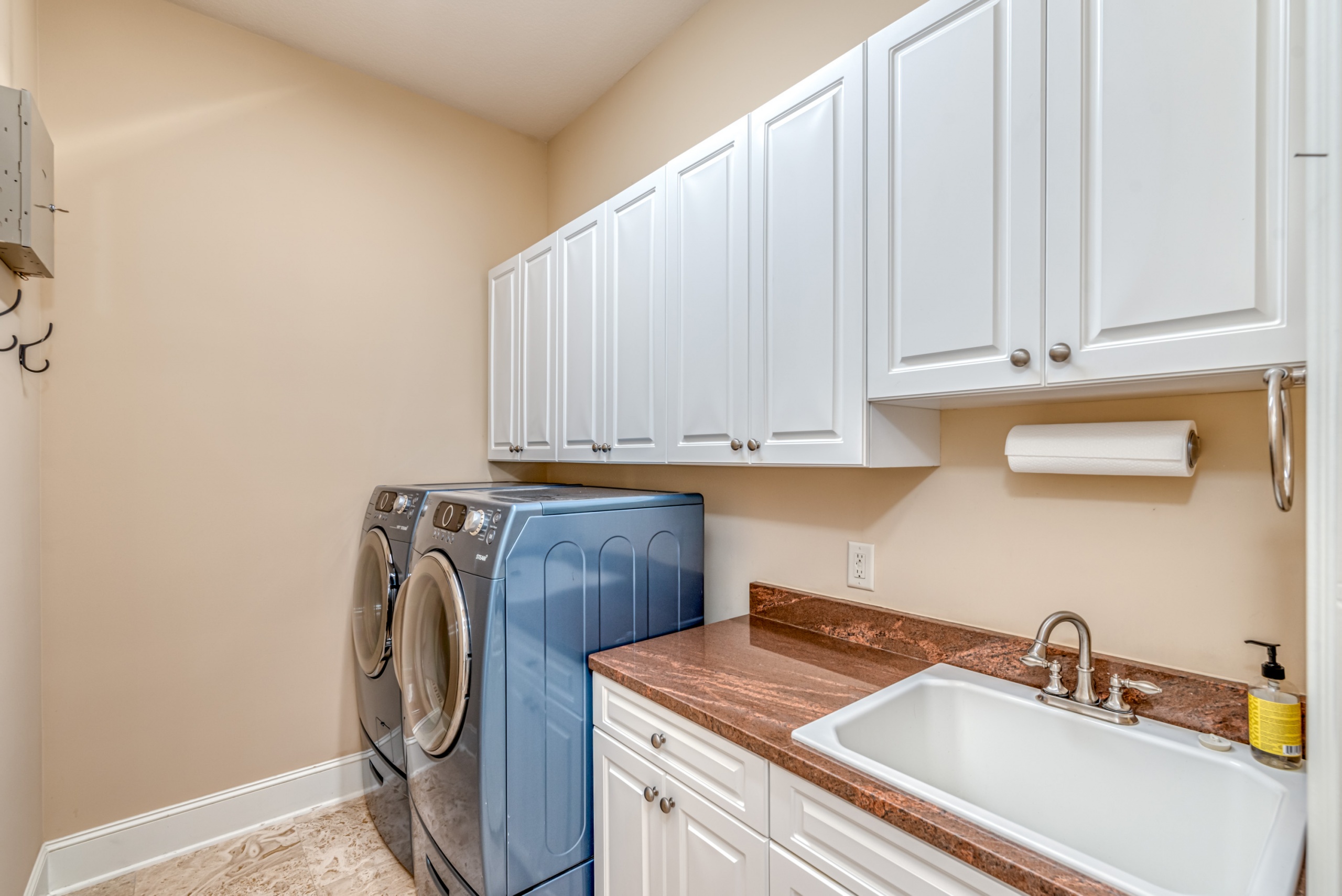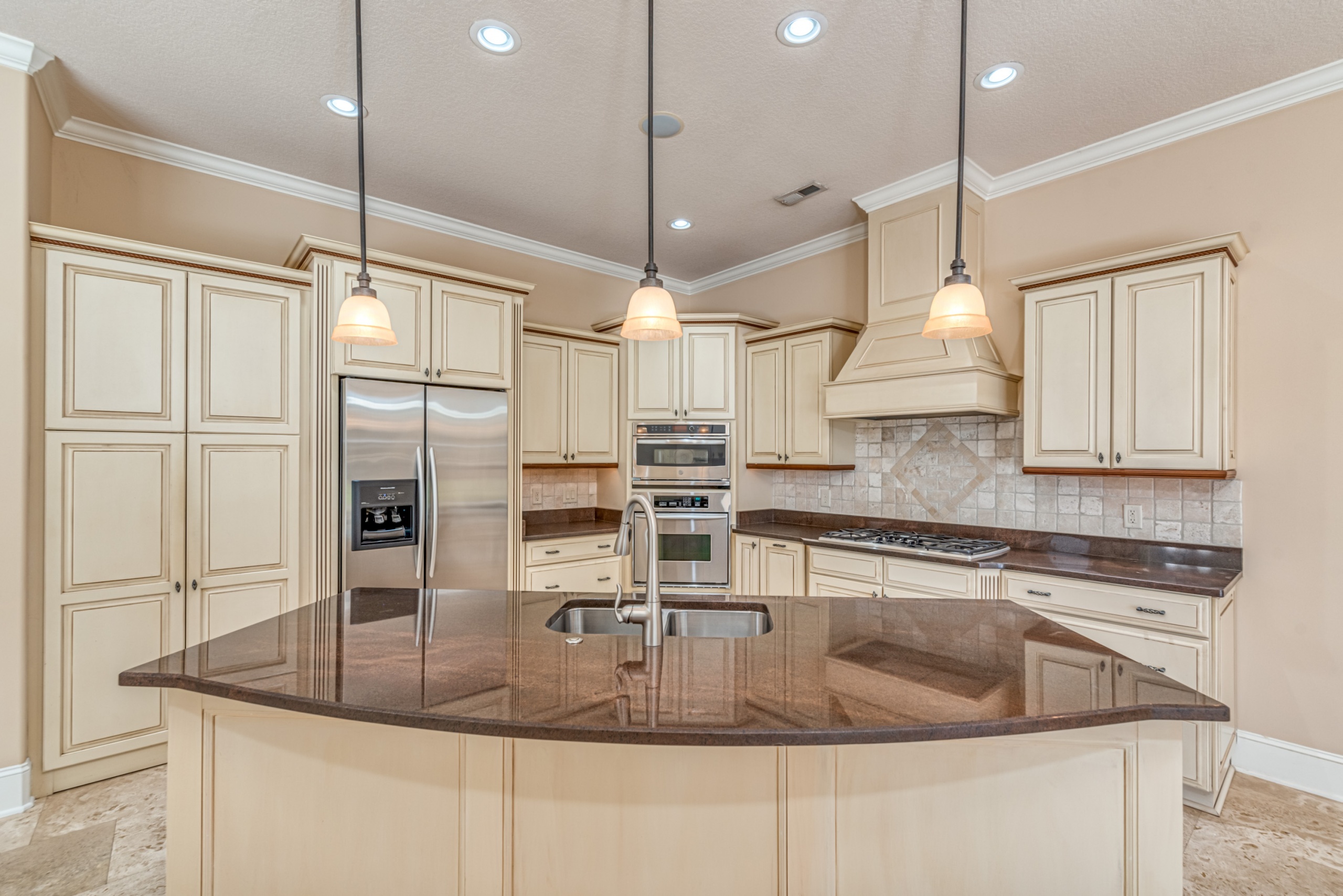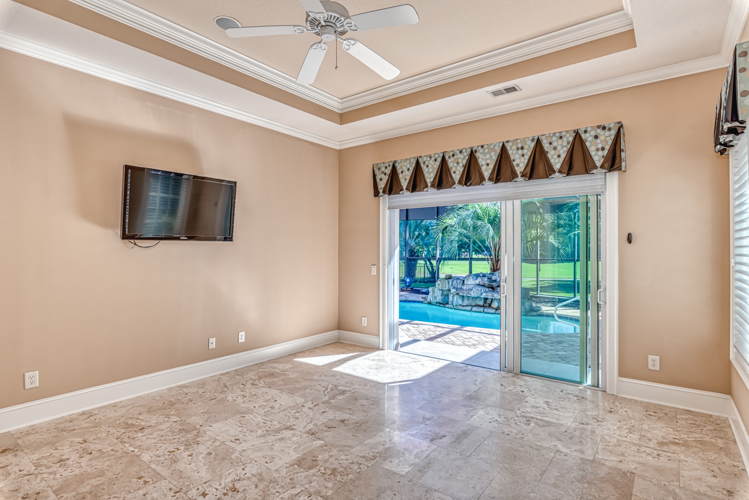 A first-floor owner's suite has large sliding doors opening into the lanai and pool area. The owner's suite bathroom gives each person their own space with "his and her" water closets, vanities, and closets. Rounding out the main level is a butler pantry, half bathroom, and large laundry room. Upstairs features two guest bedrooms with en-suite bathrooms and two flex rooms. The backside bedroom has a private balcony with a dynamic golf course view. These flex rooms have endless possibilities. They could be used as bedrooms, offices, media rooms, or workout rooms. Additional highlights in this magnificent home are Rinnai tankless water heater, central vacuum, travertine flooring, gutter helmets, and much more.