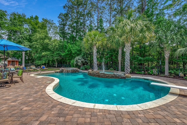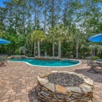 The outdoor setting is incredible. The custom saltwater pool is heated and features natural rock accents, a sun shelf, and a built-in hot tub. Surrounding it is an extensive paver patio designed for entertaining, relaxing, or enjoying quiet evenings by the water. Mature landscaping and accent lighting add to the peaceful atmosphere, while sections of the yard are already fenced for added convenience.