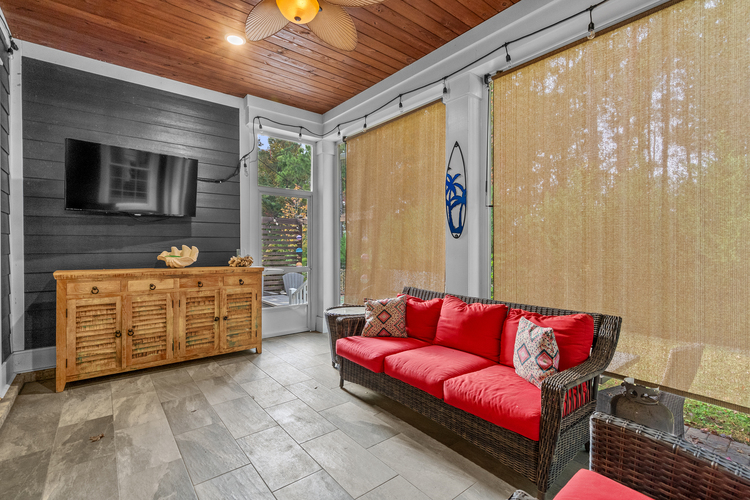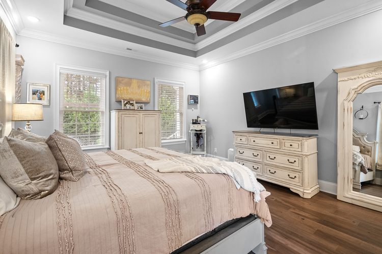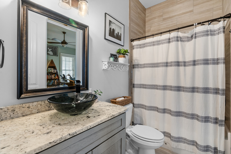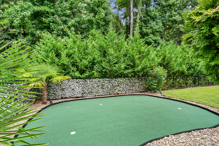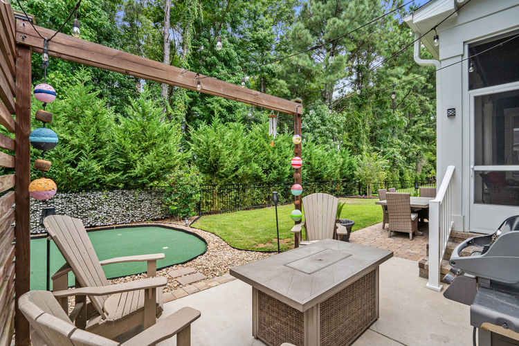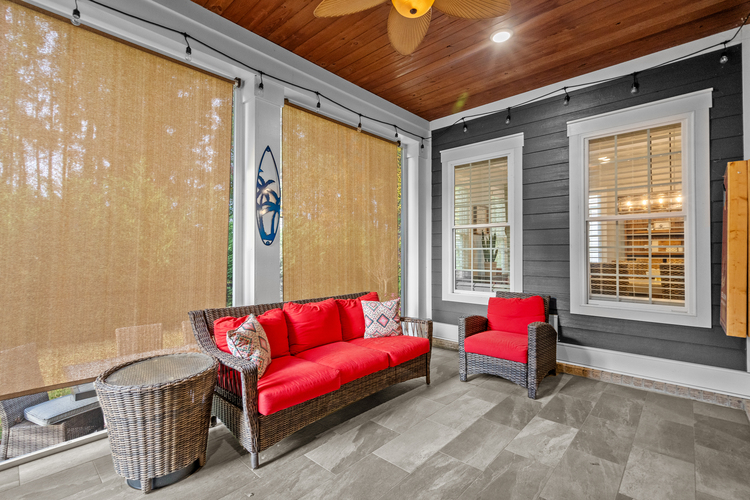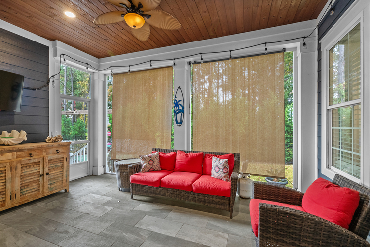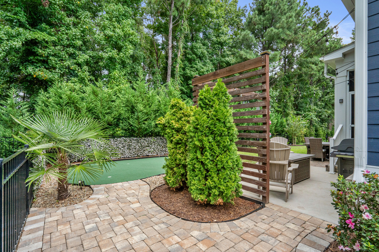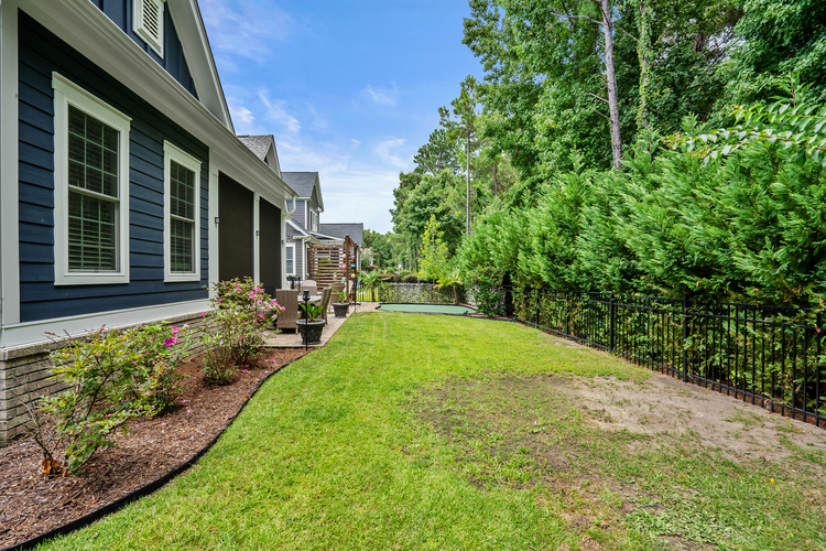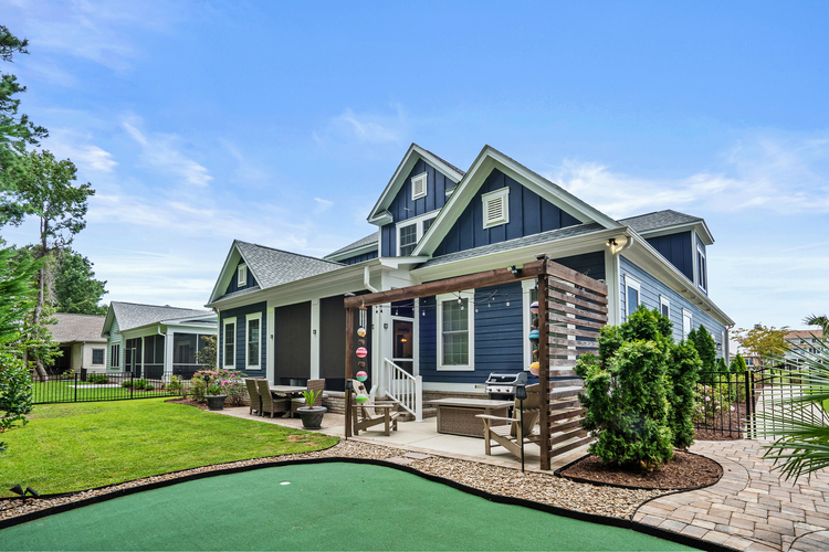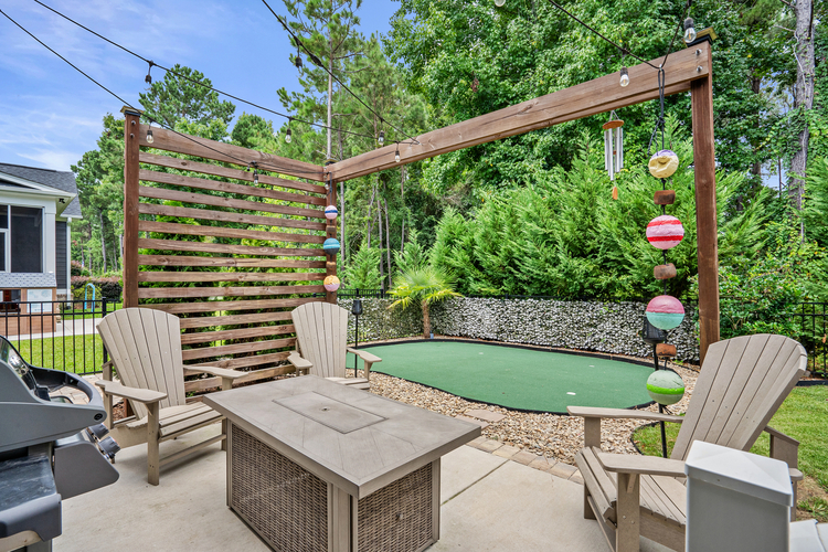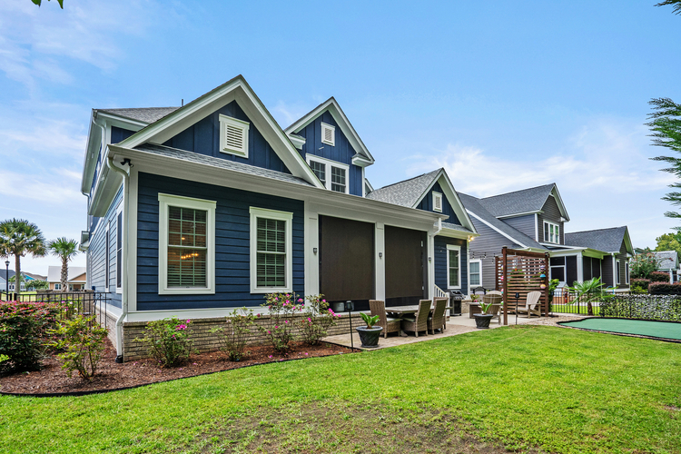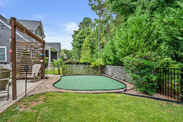 The master bedroom and an additional bedroom are conveniently located on the main level, offering ease and accessibility. High-end features include a putting green, a private fence, backyard privacy trees, and a pergola. The screened-in back porch with tile flooring and 2” blinds throughout the house ensure a seamless indoor-outdoor living experience. Relax or entertain in the heavy-duty swing on the front porch or utilize the practical garage racks/track system. Designed with a Southern Lifestyle in mind, the floor plan exudes comfort and luxury, complemented by back porch privacy screens.