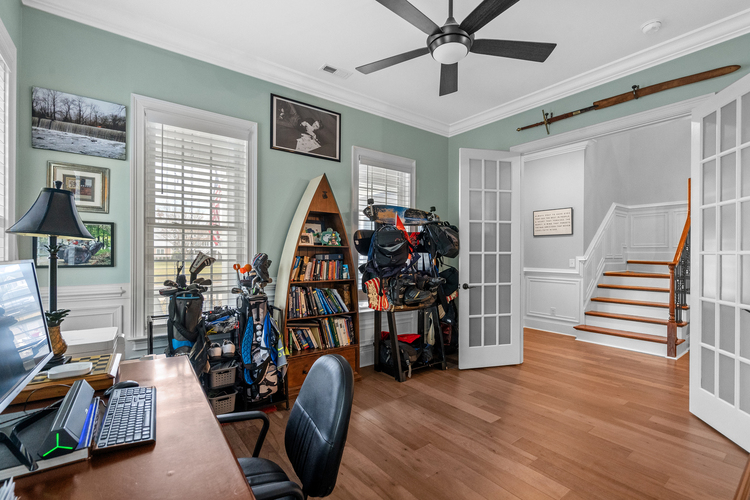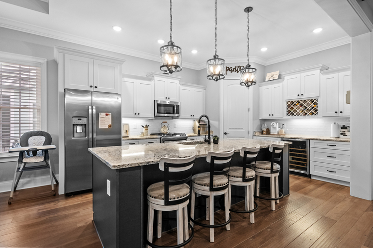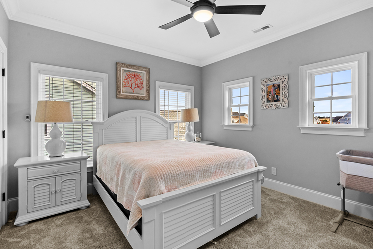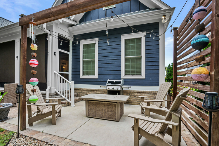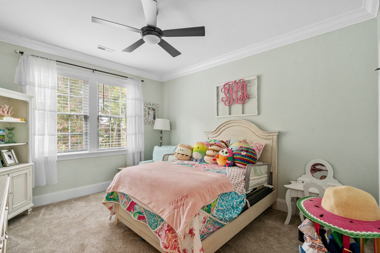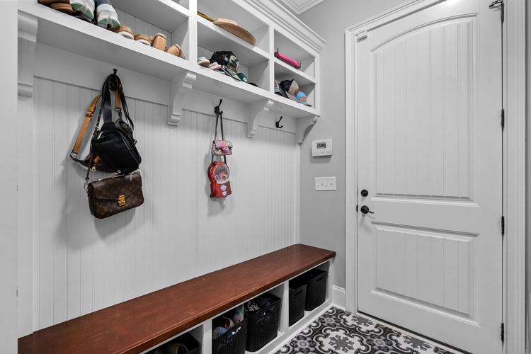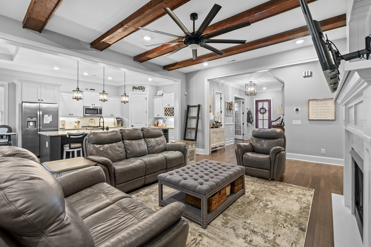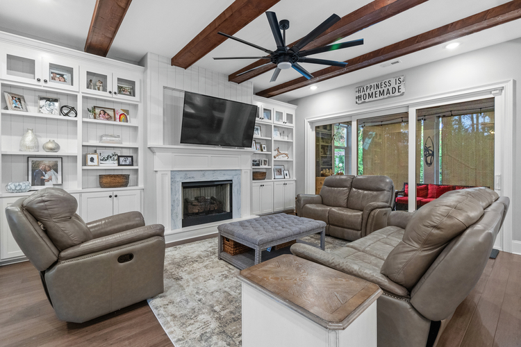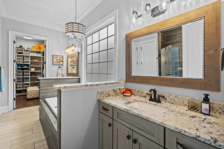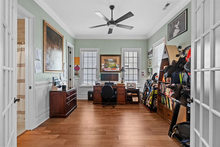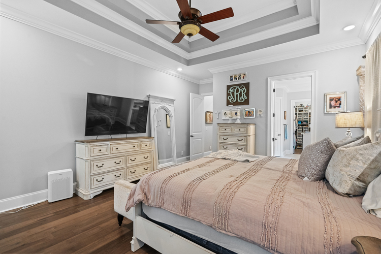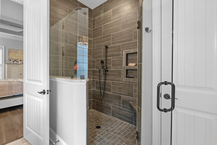 The master bedroom and an additional bedroom are conveniently located on the main level, offering ease and accessibility. High-end features include a putting green, a private fence, backyard privacy trees, and a pergola. The screened-in back porch with tile flooring and 2” blinds throughout the house ensure a seamless indoor-outdoor living experience. Relax or entertain in the heavy-duty swing on the front porch or utilize the practical garage racks/track system. Designed with a Southern Lifestyle in mind, the floor plan exudes comfort and luxury, complemented by back porch privacy screens.