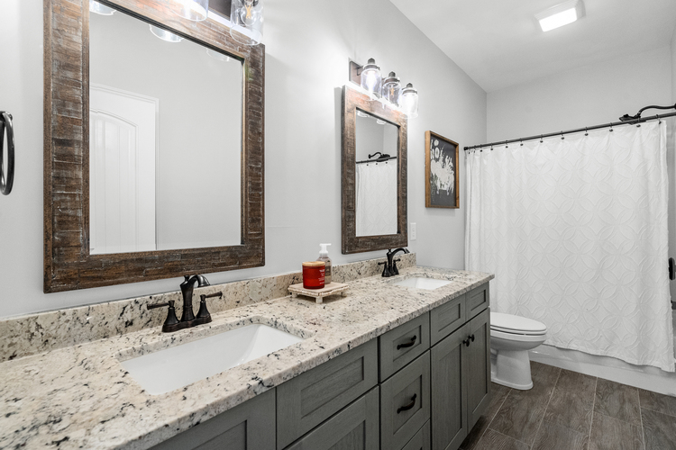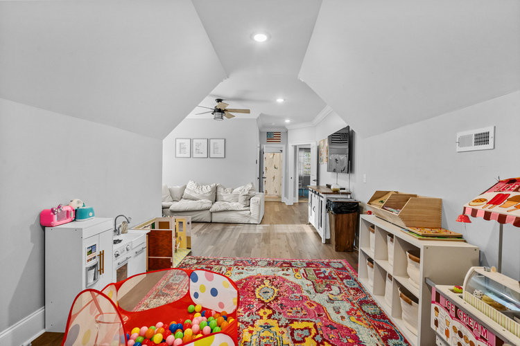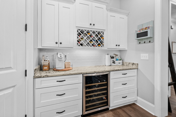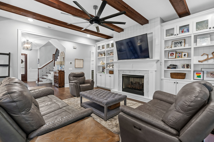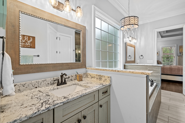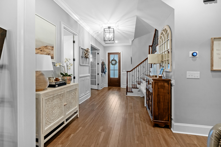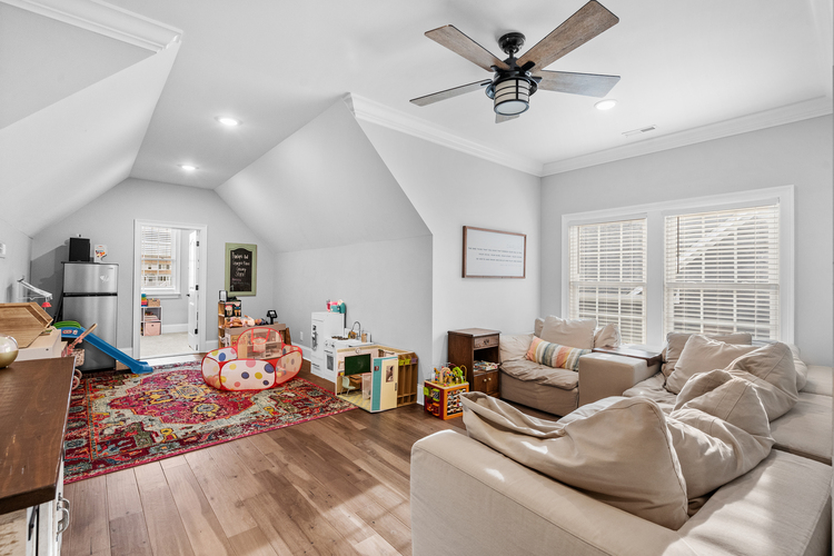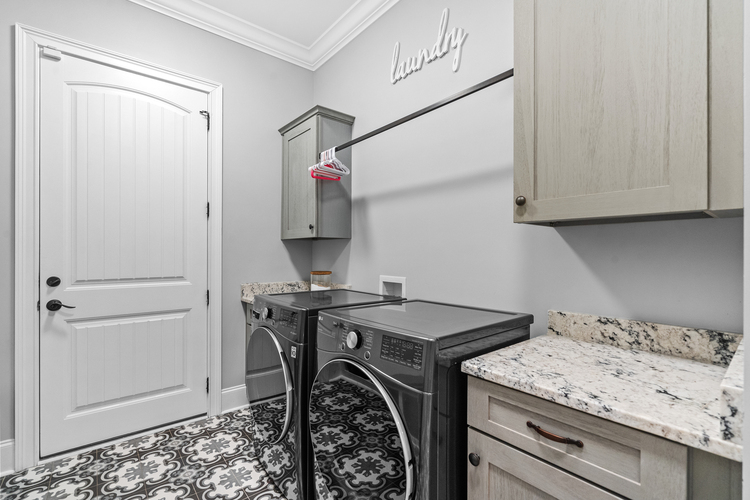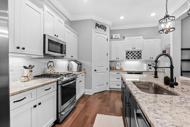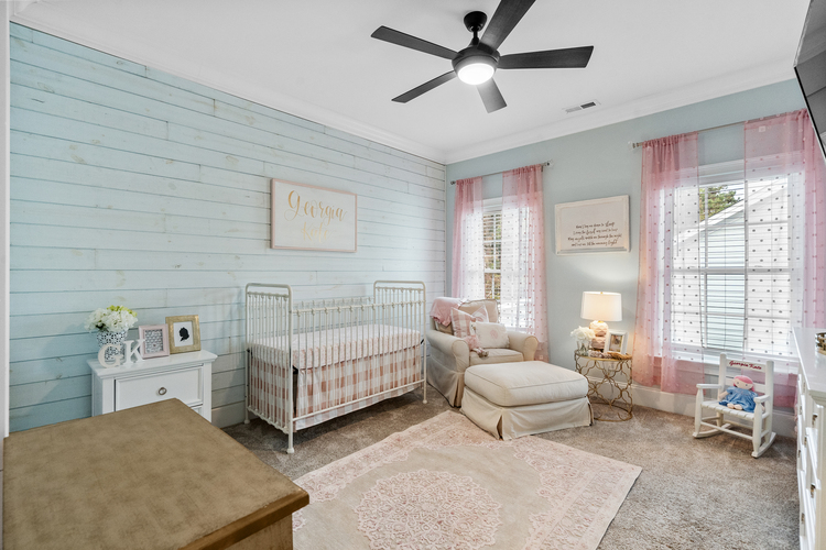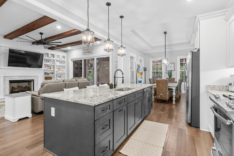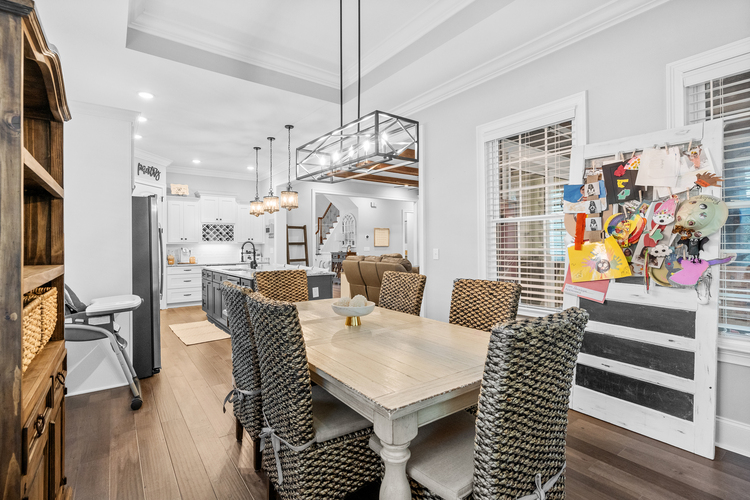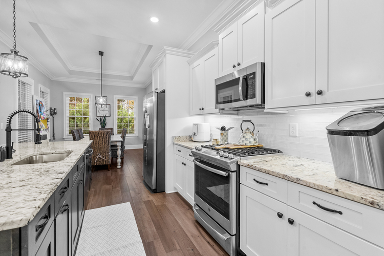 The master bedroom and an additional bedroom are conveniently located on the main level, offering ease and accessibility. High-end features include a putting green, a private fence, backyard privacy trees, and a pergola. The screened-in back porch with tile flooring and 2” blinds throughout the house ensure a seamless indoor-outdoor living experience. Relax or entertain in the heavy-duty swing on the front porch or utilize the practical garage racks/track system. Designed with a Southern Lifestyle in mind, the floor plan exudes comfort and luxury, complemented by back porch privacy screens.