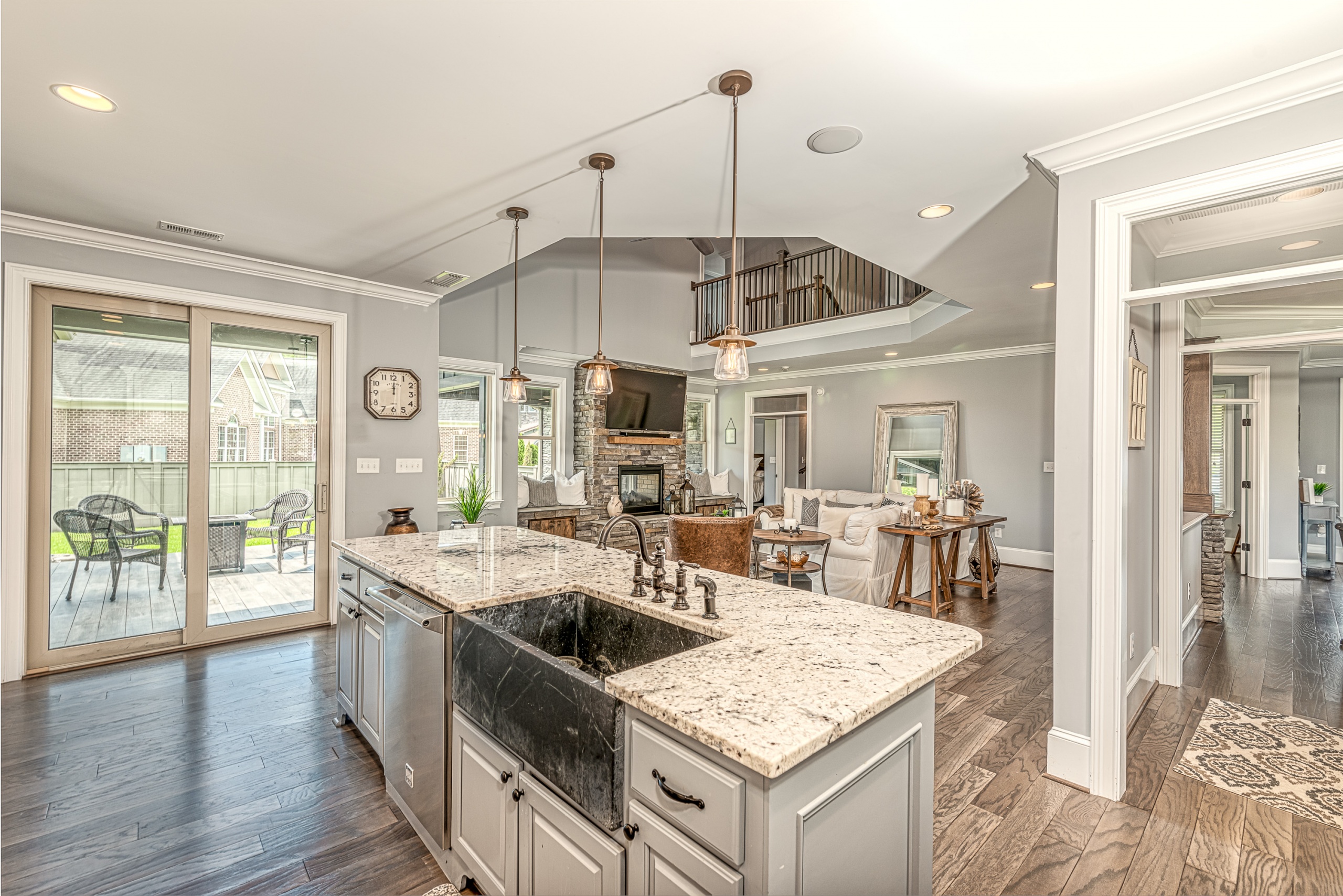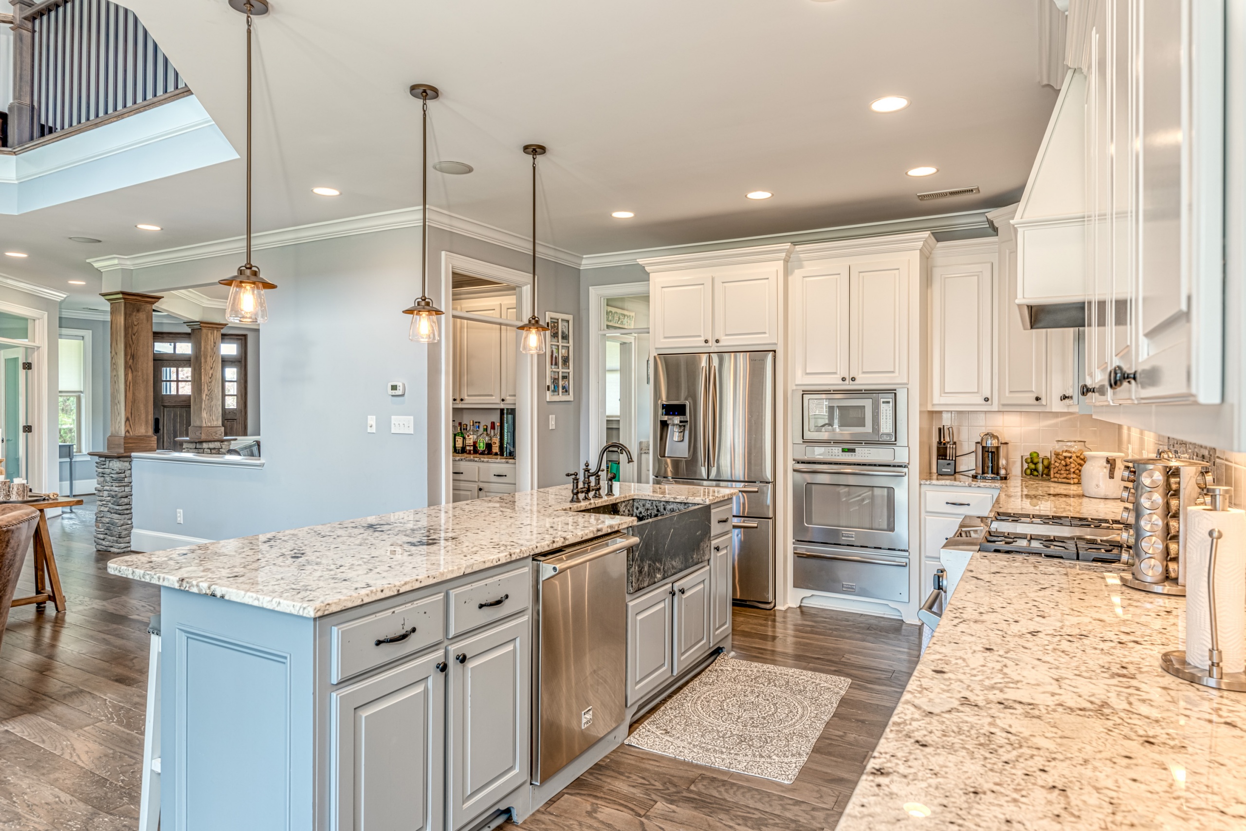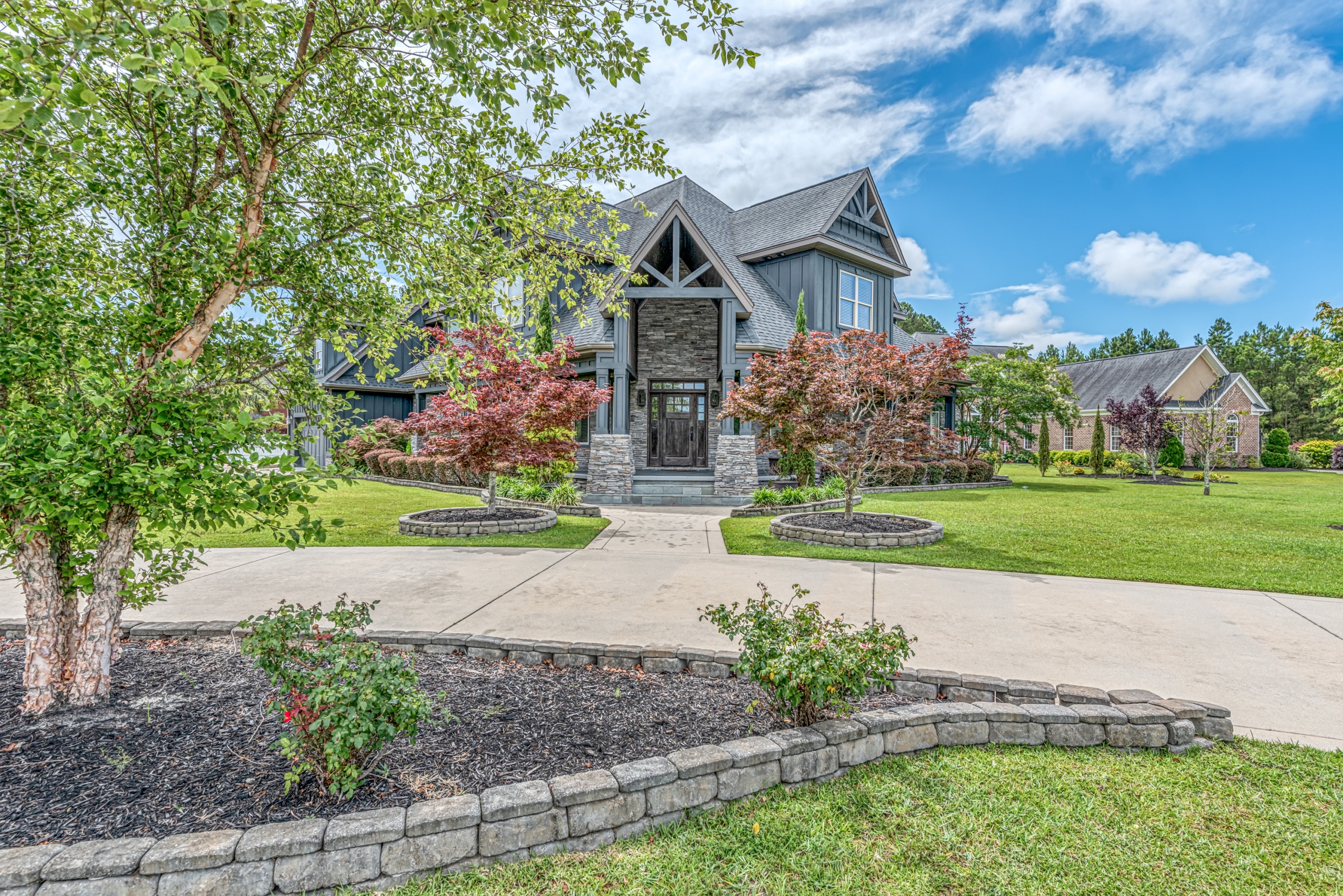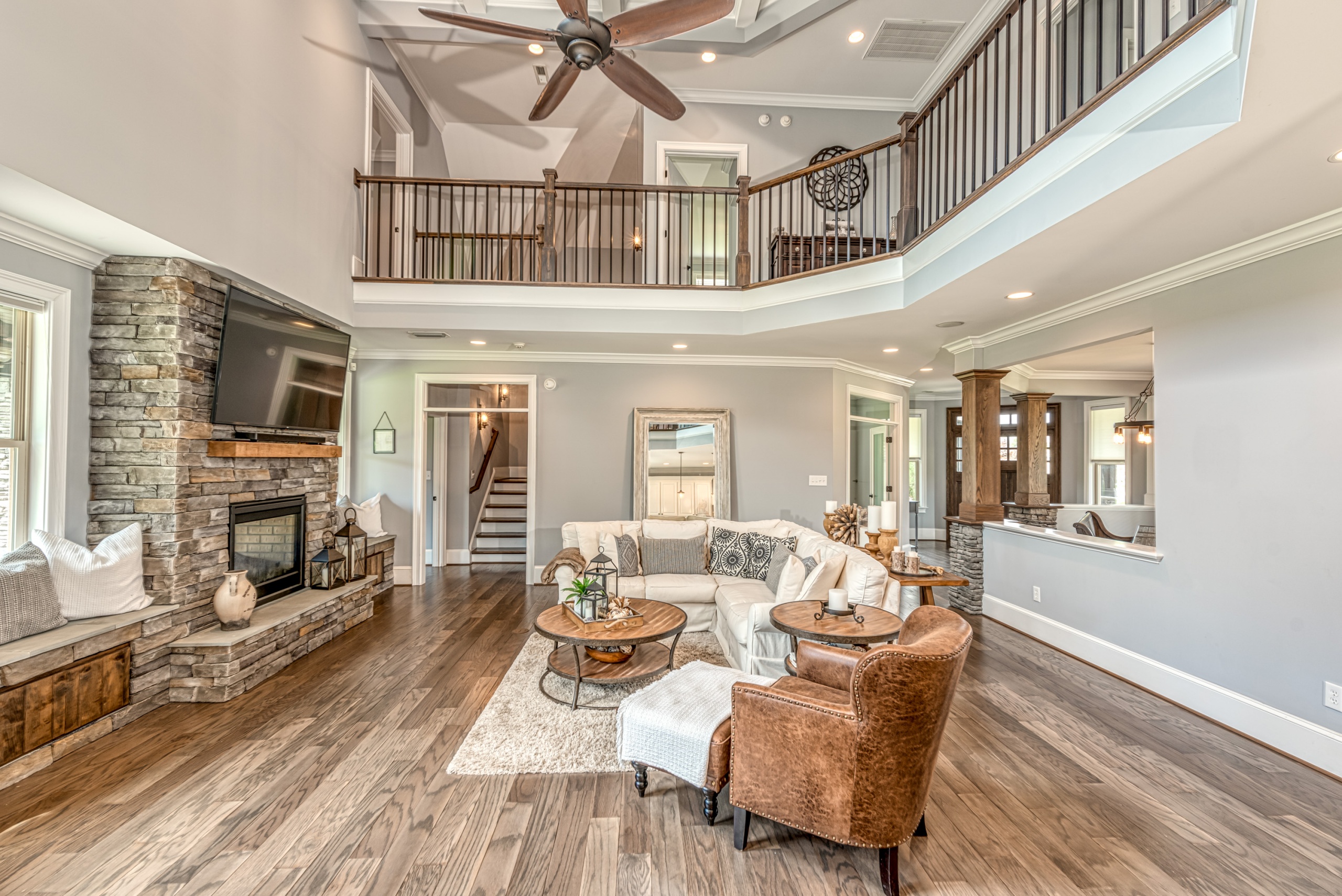 Once through the front door, you are drawn into the home by rich hardwood flooring, detailed moldings, a double-sided stacked stone fireplace, and a two-story living area. Now that you are inside, the quality craftsmanship and attention to detail are evident at every turn. The open kitchen and great room combination have become the staple of southern living. The large kitchen has a stainless gas range with a custom hood matching the cabinets. A secondary wall oven is a necessity for those who enjoy cooking. The large breakfast bar, oversized pantry, and butler pantry leading into the dining room make this an ideal home for entertaining. Rounding out the first level is a private guest suite ideal for in-laws or weekend guests, a study, playroom/den, and a 1st-floor laundry room.
