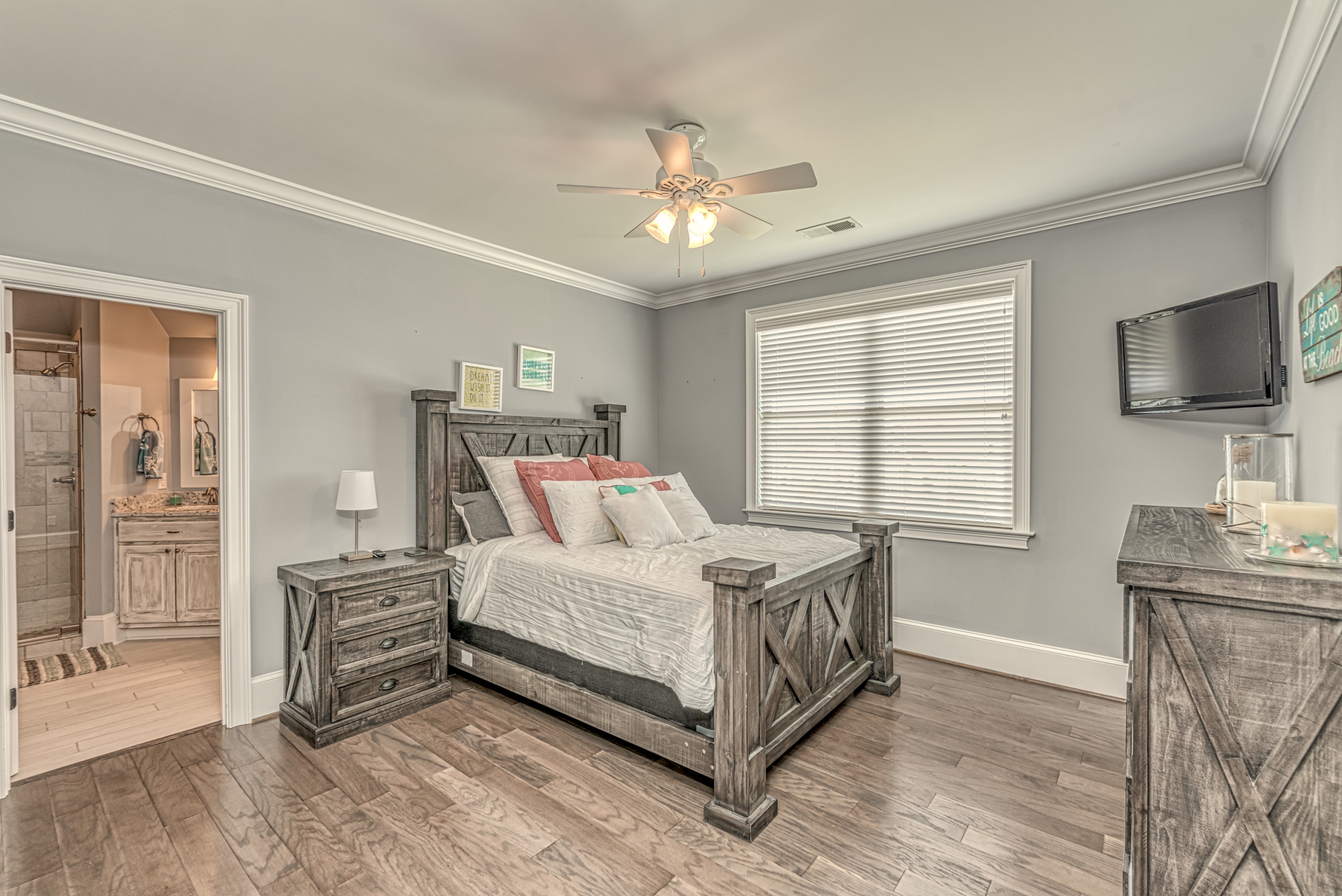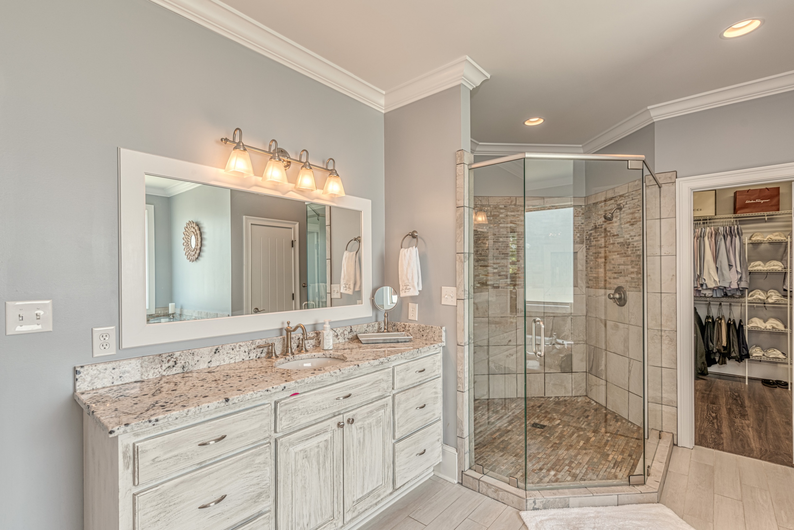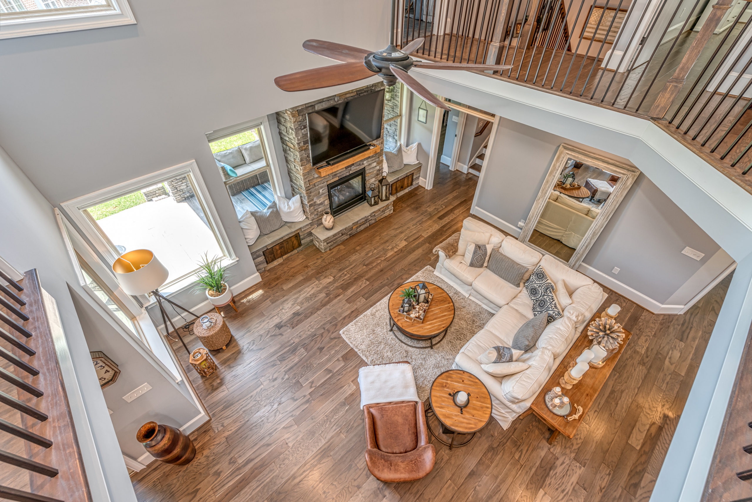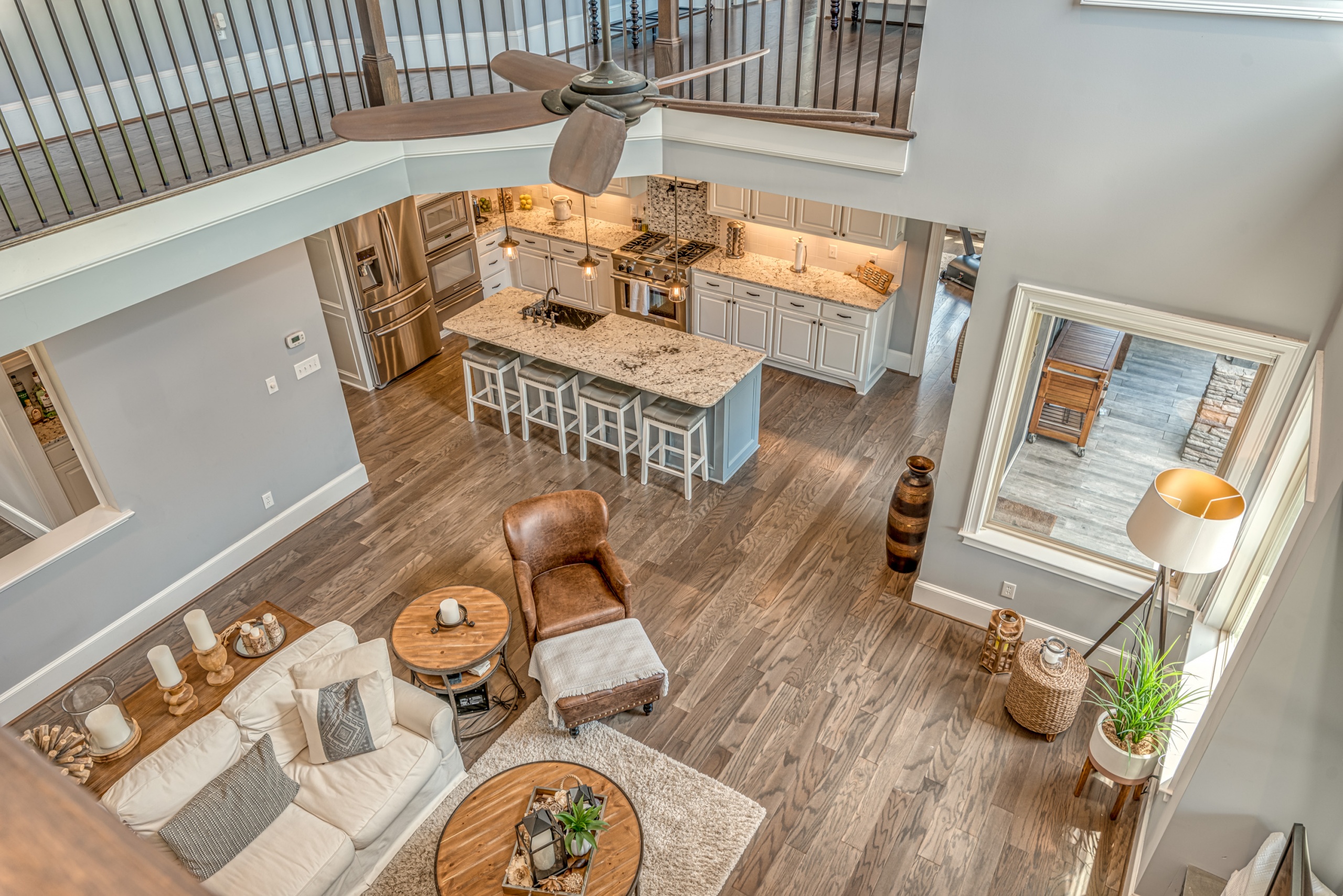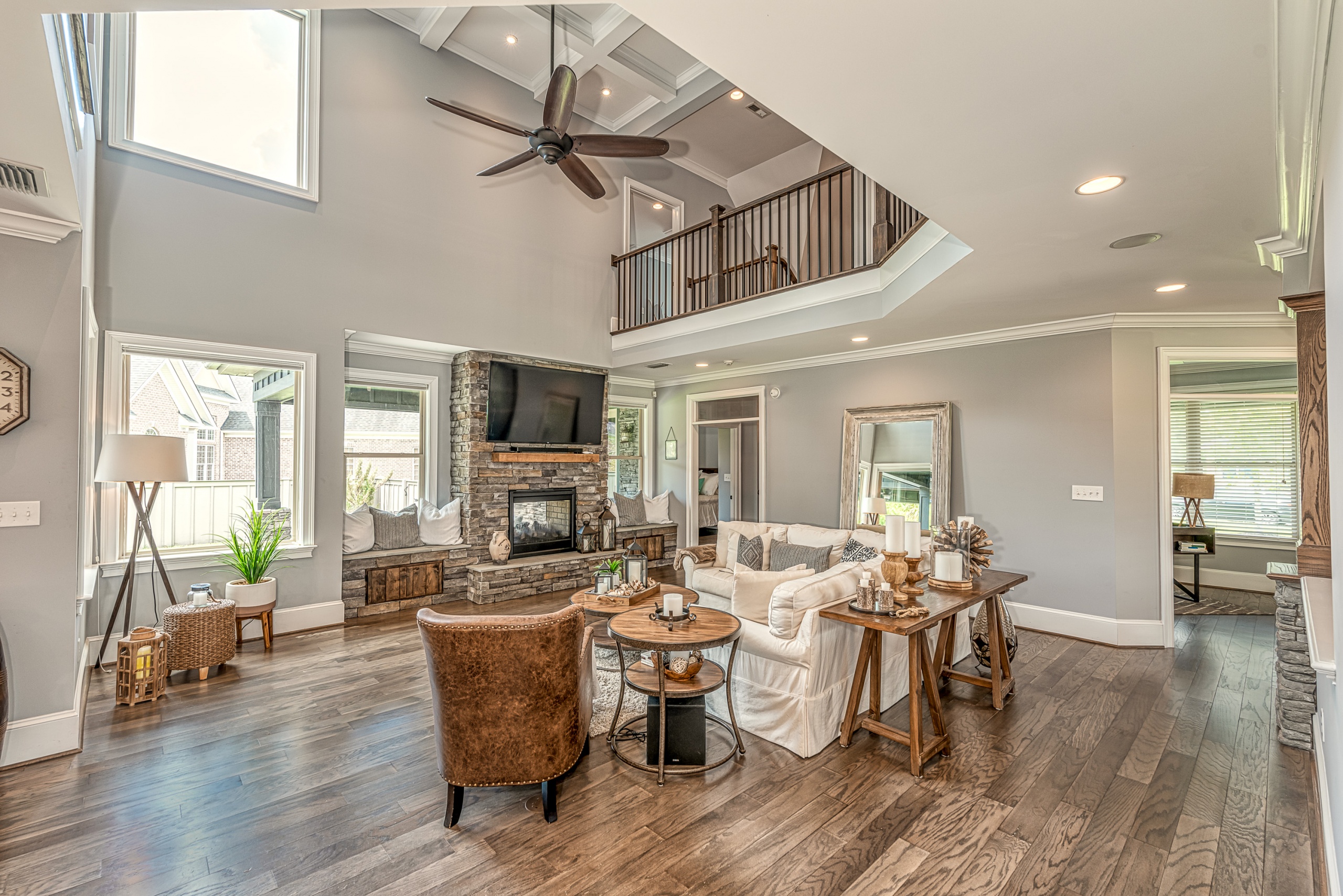 Once through the front door, you are drawn into the home by rich hardwood flooring, detailed moldings, a double-sided stacked stone fireplace, and a two-story living area. Now that you are inside, the quality craftsmanship and attention to detail are evident at every turn. The open kitchen and great room combination have become the staple of southern living. The large kitchen has a stainless gas range with a custom hood matching the cabinets. A secondary wall oven is a necessity for those who enjoy cooking. The large breakfast bar, oversized pantry, and butler pantry leading into the dining room make this an ideal home for entertaining. Rounding out the first level is a private guest suite ideal for in-laws or weekend guests, a study, playroom/den, and a 1st-floor laundry room.