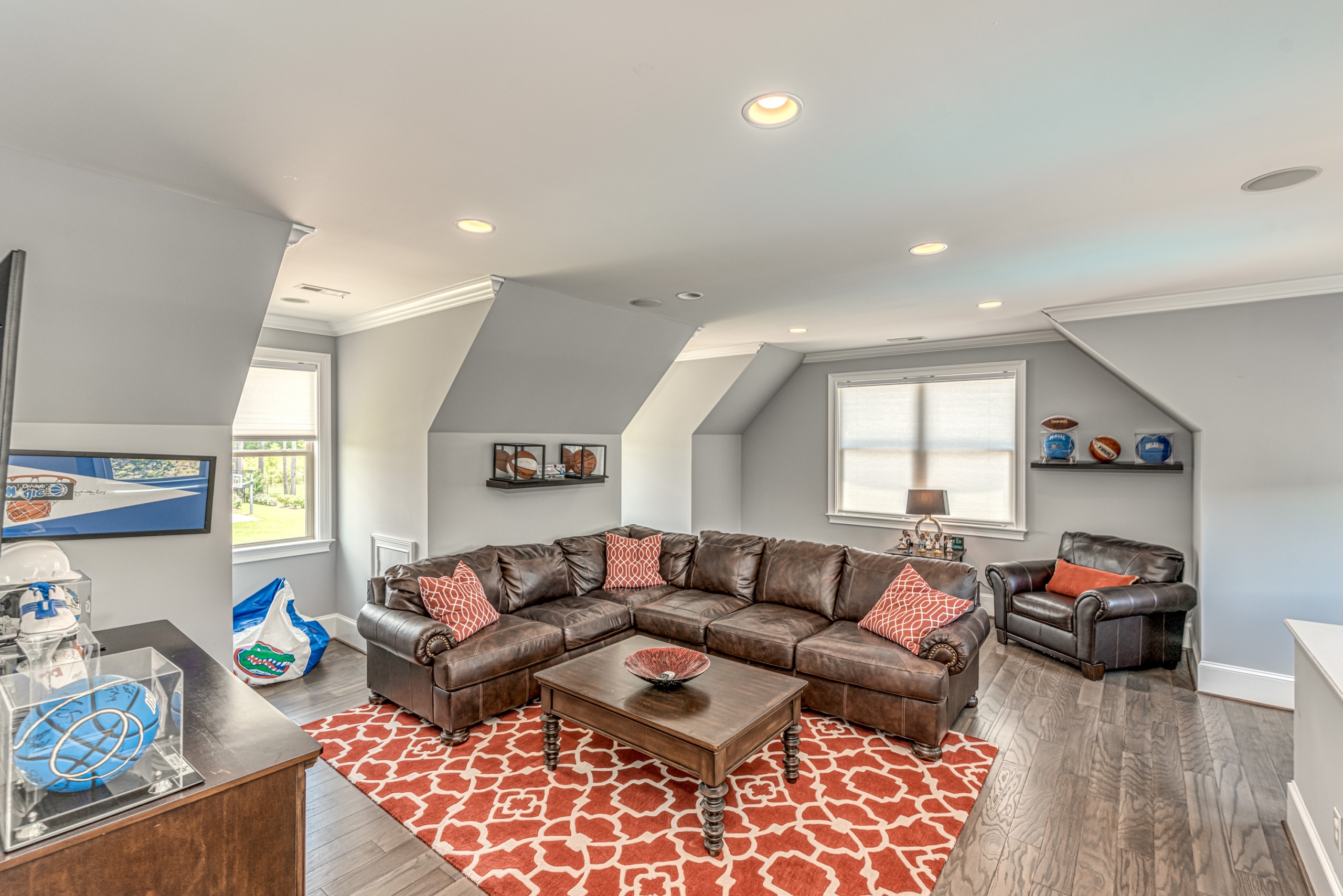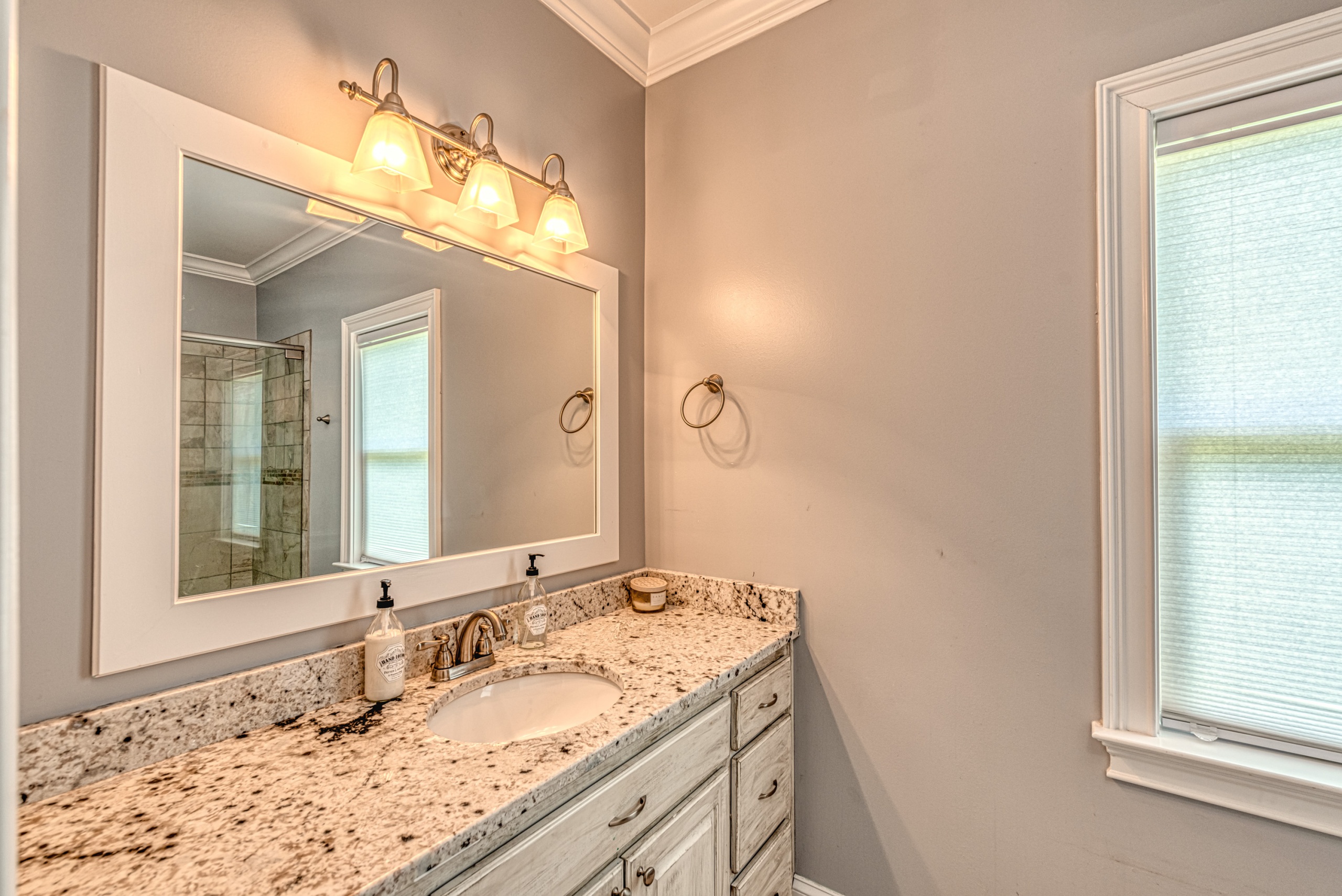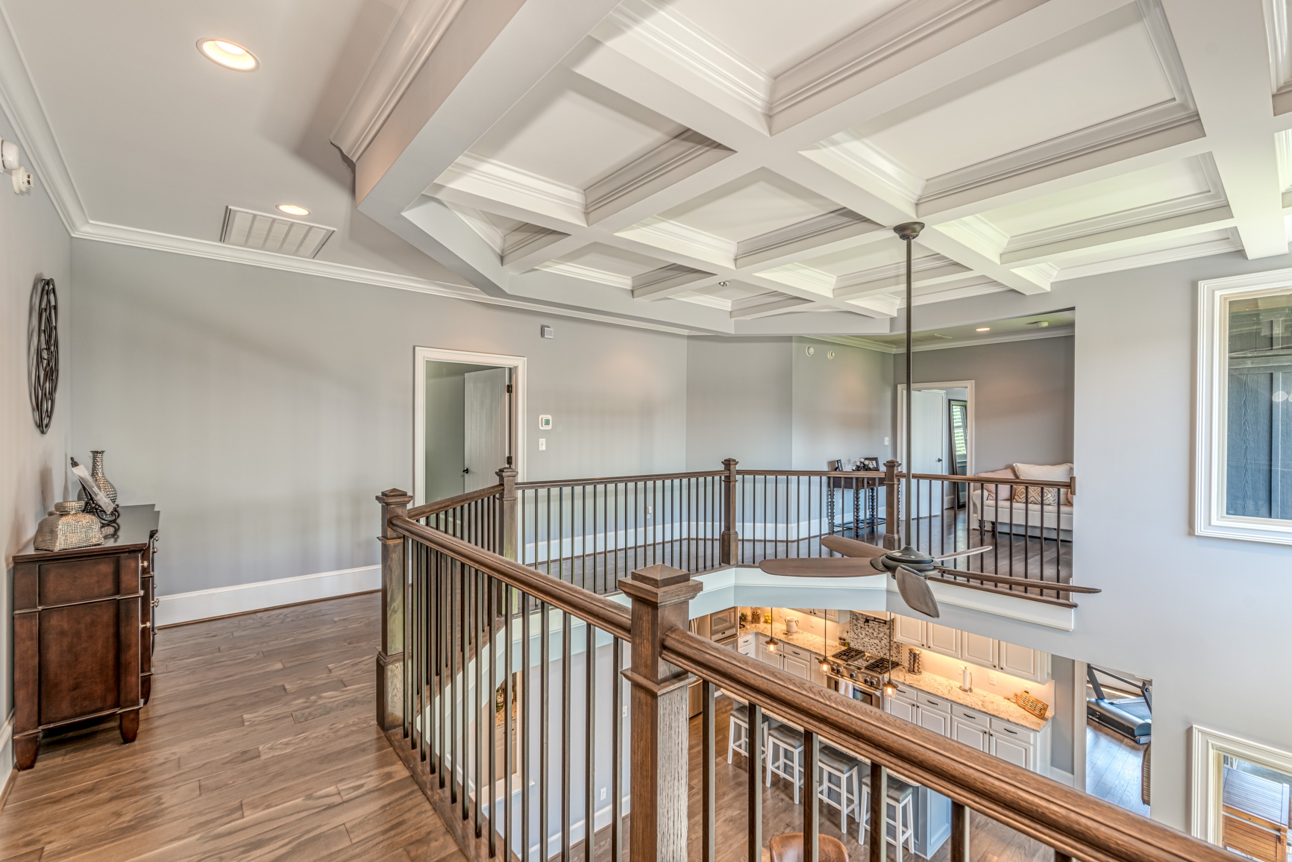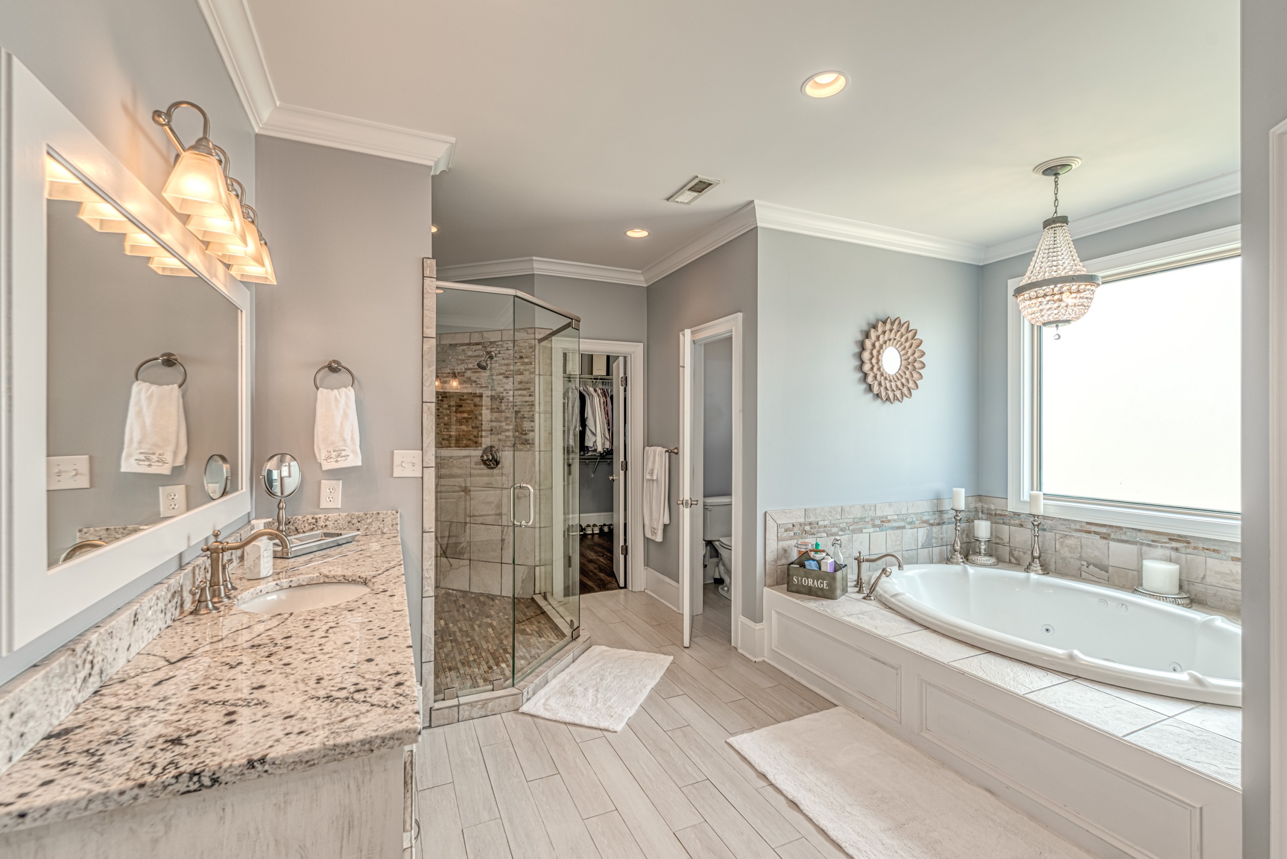 Once through the front door, you are drawn into the home by rich hardwood flooring, detailed moldings, a double-sided stacked stone fireplace, and a two-story living area. Now that you are inside, the quality craftsmanship and attention to detail are evident at every turn. The open kitchen and great room combination have become the staple of southern living. The large kitchen has a stainless gas range with a custom hood matching the cabinets. A secondary wall oven is a necessity for those who enjoy cooking. The large breakfast bar, oversized pantry, and butler pantry leading into the dining room make this an ideal home for entertaining. Rounding out the first level is a private guest suite ideal for in-laws or weekend guests, a study, playroom/den, and a 1st-floor laundry room.