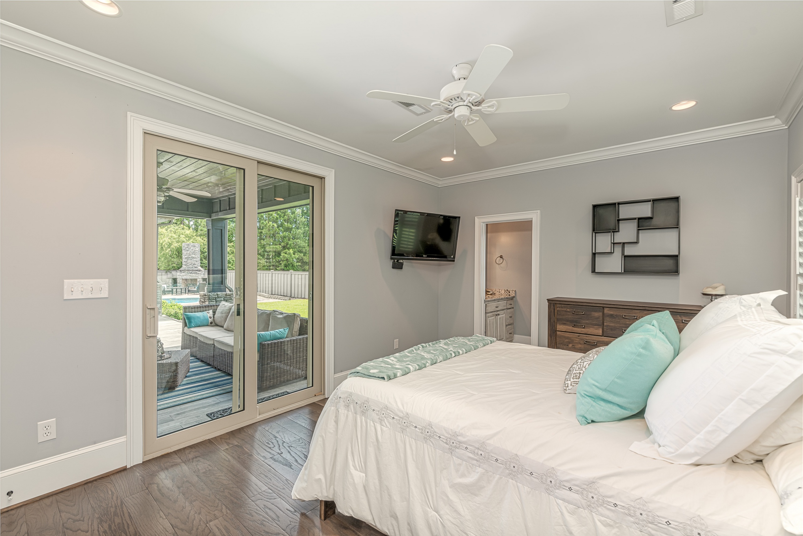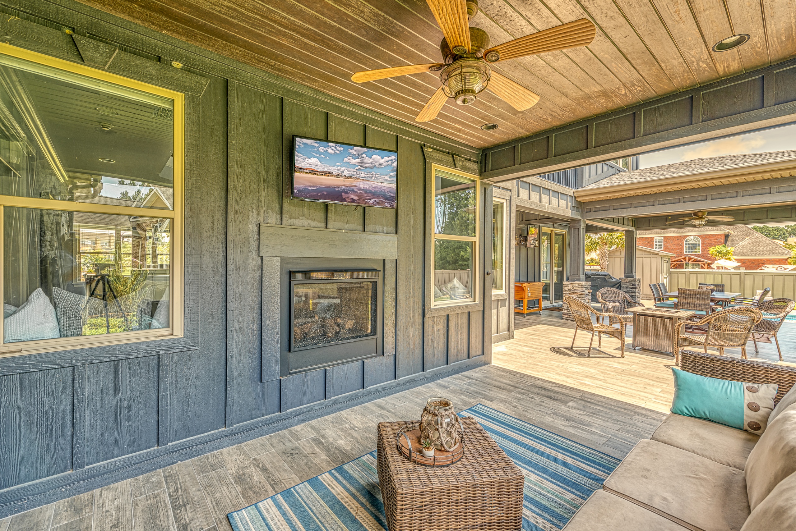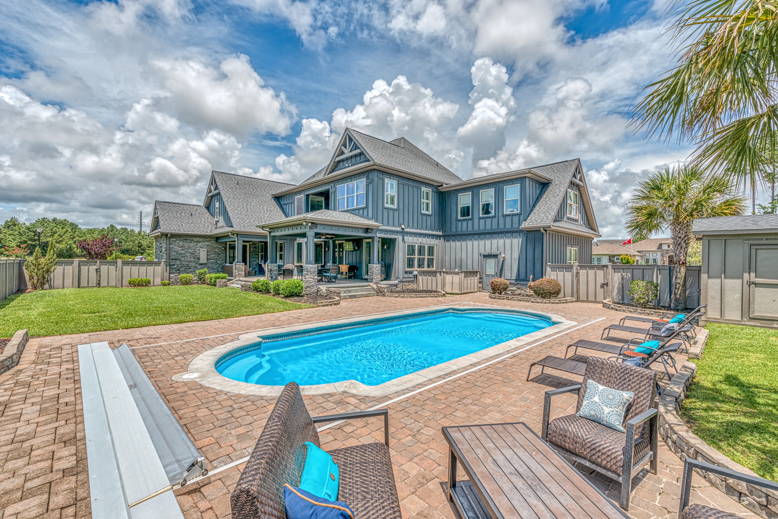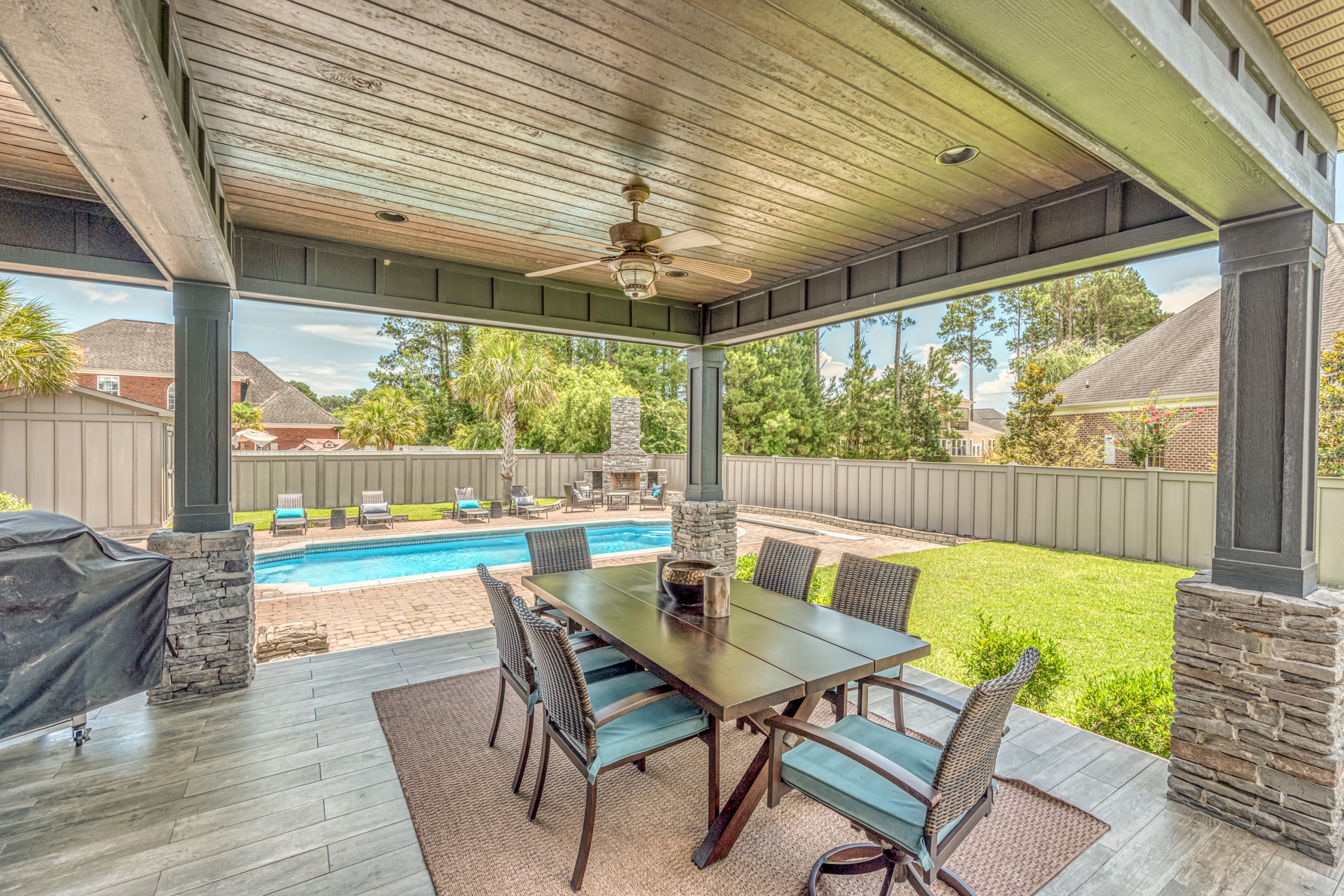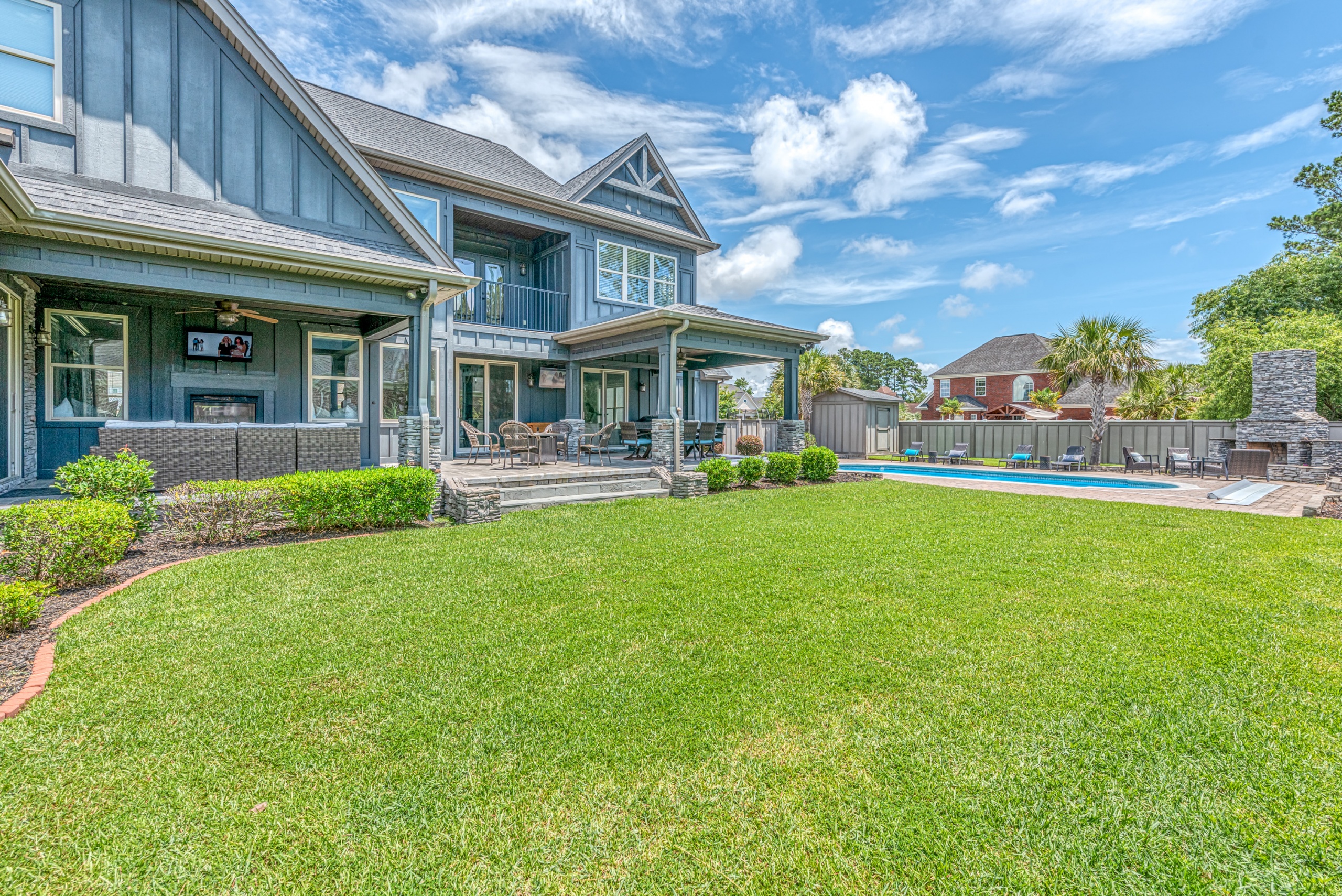 Upstairs, the master bedroom offers solitude from the rest of the home. The master bathroom has a whirlpool tub, a walk-in tile shower, and dual walk-in closets. Additionally, the bonus room has private access from the master bedroom and could function as a master bedroom retreat, parlor, media room, or separate living area. The spacious guest bedrooms also have walk-in closets and are situated in a traditional “Jack & Jill” bathroom setup. The enormous upstairs laundry room is perfectly positioned and has tons of counter & cabinet space, making the “laundry” task almost enjoyable. The backyard, covered patio, saltwater pool, and outdoor fireplace are a world unto their own. The privacy fence makes this feel like your own tropical oasis. If you have ever dreamed of living the #VacationLife, you can find it at 5101 High Society Court, Myrtle Beach SC 29577.