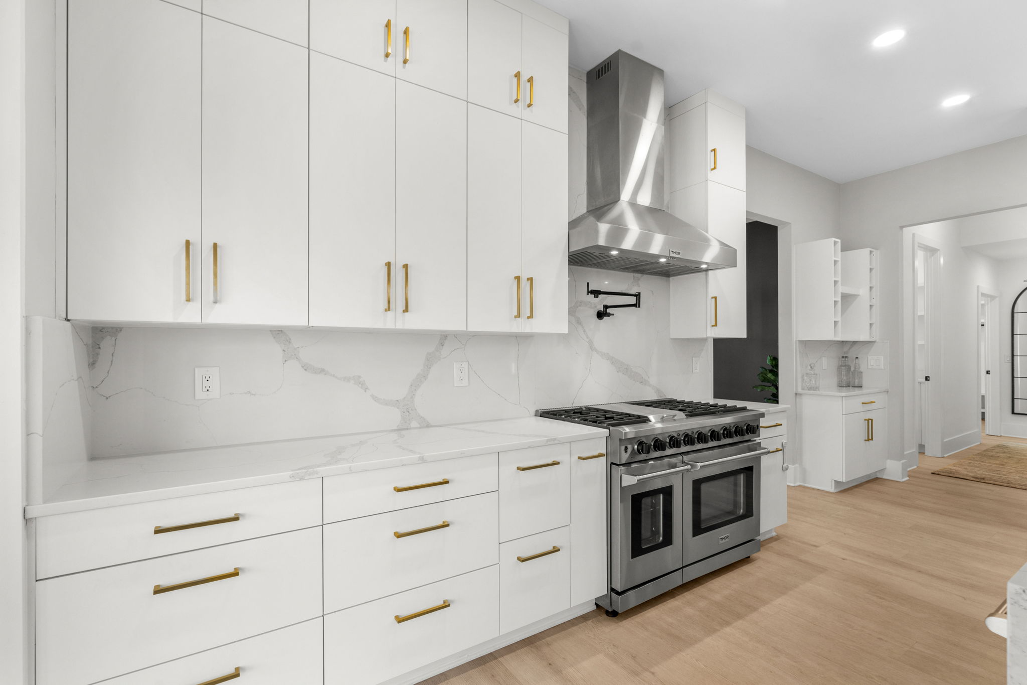 The designer kitchen is both striking and functional, featuring sleek white cabinetry, quartz countertops, and a bold navy island accented with gold hardware. Professional-grade stainless appliances, double ovens, a pot filler, and a walk-in pantry create the perfect balance between elegance and practicality.