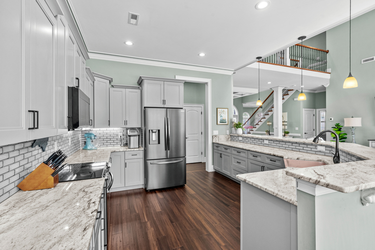 The kitchen is both stylish and functional, featuring a copper-etched sink, Samsung appliances, and two walk-in pantries for ample storage. Rich wood flooring runs throughout the main level, complementing the home’s elegant design. Upstairs, additional bedrooms provide plenty of space, along with a generous storage area. Another oversized storage space is available in the attic, offering even more convenience.