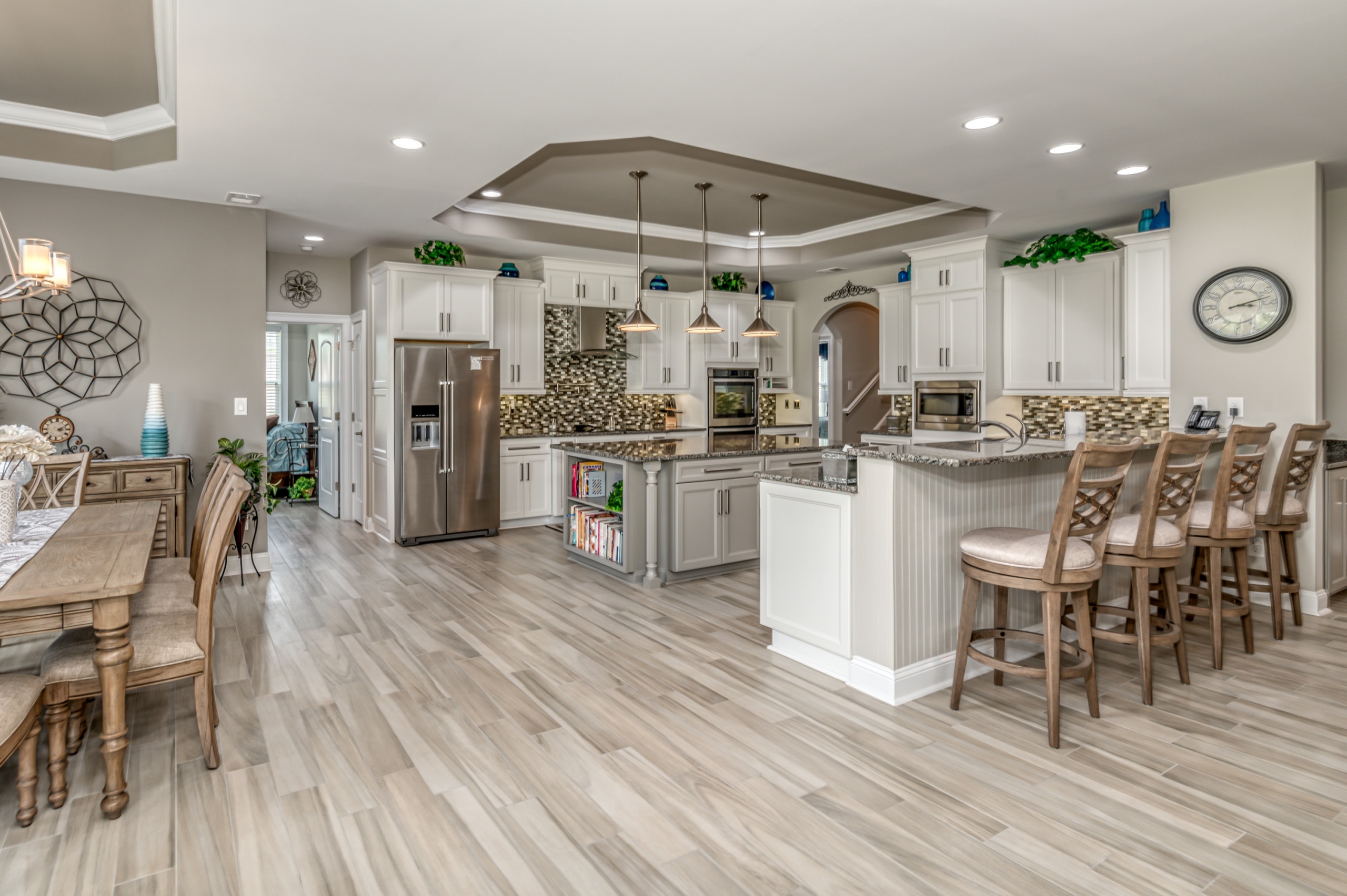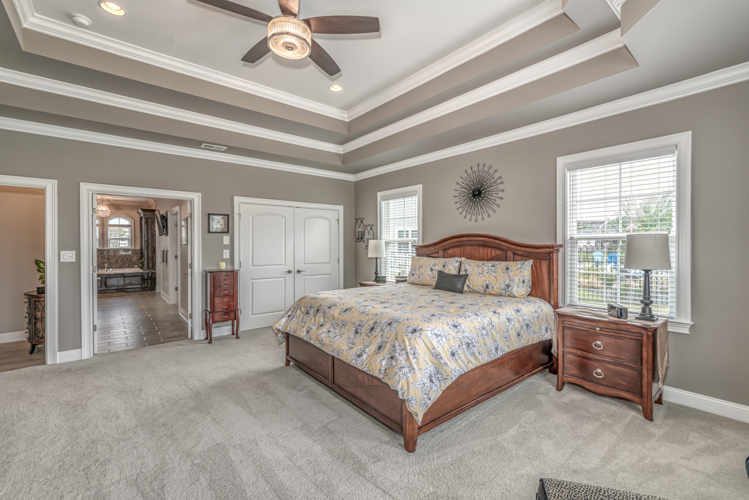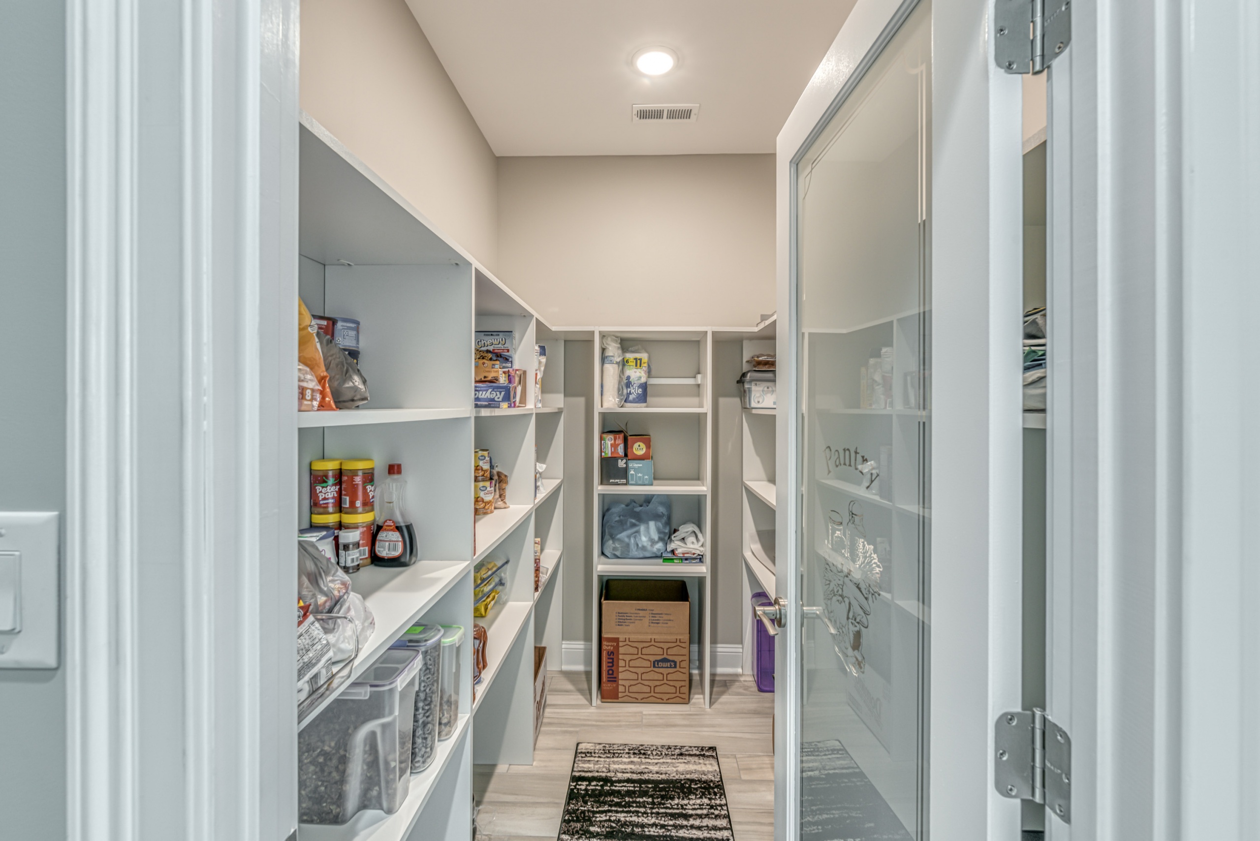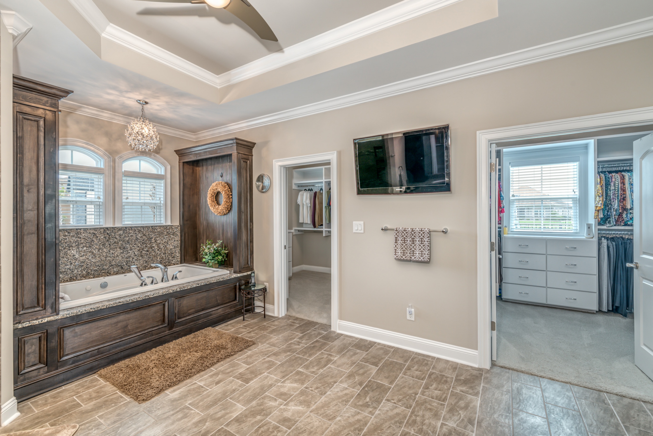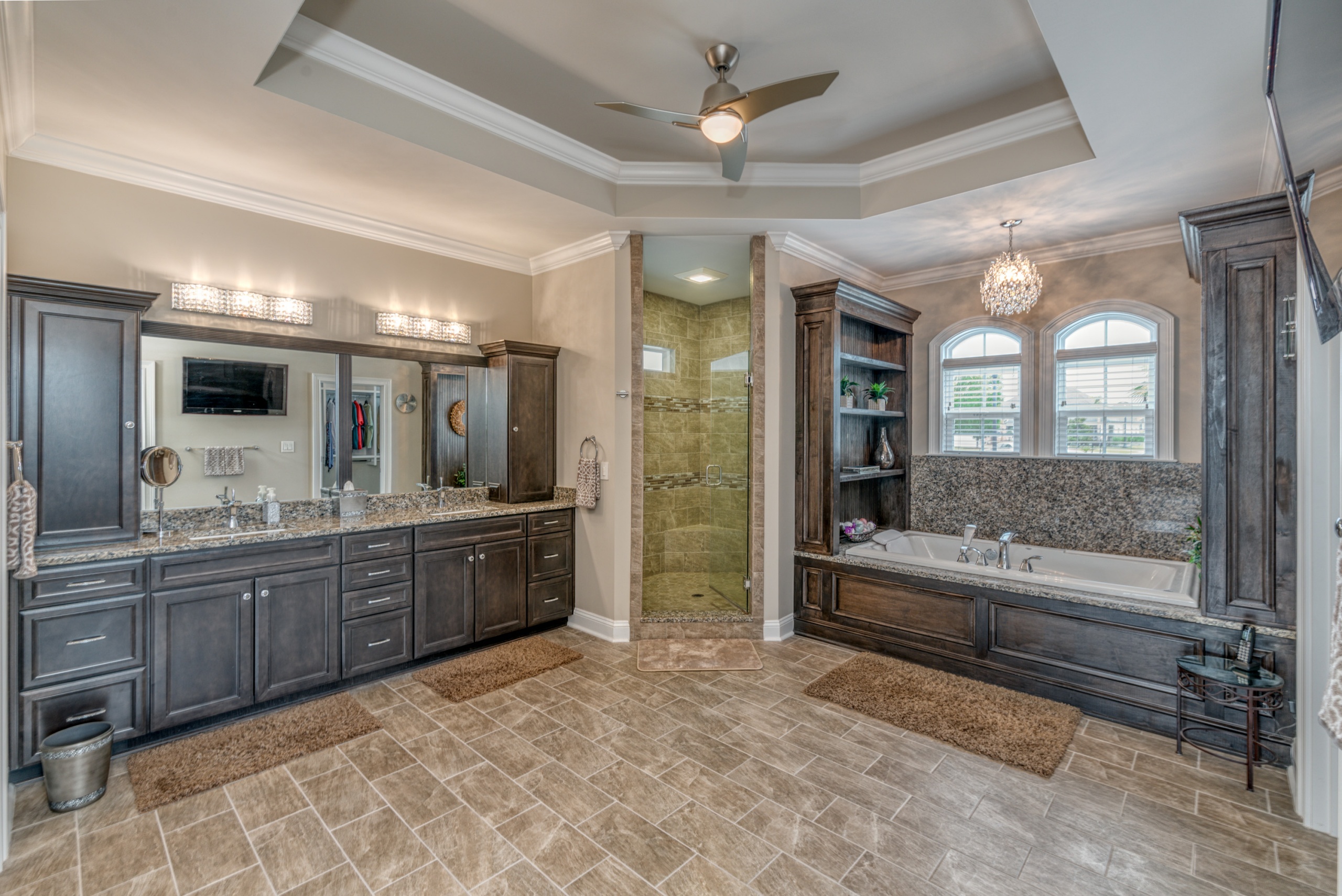 The Owner’s Suite and the kitchen will be a hotly debated issue regarding which will be your favorite room. The owner's suite encompasses the entire left-hand side of the home. The sleeping area is large enough to accommodate a sitting space, a king-sized bed, and traditional bedroom furniture. In the master bathroom, you are afforded two oversized walk-in closets, a double bowl vanity, a Whirlpool tub, and a dual-headed, corner walk-in shower. Additionally, as a bonus, you have a separate shoe closet with custom built-ins to keep all your footwear organized.