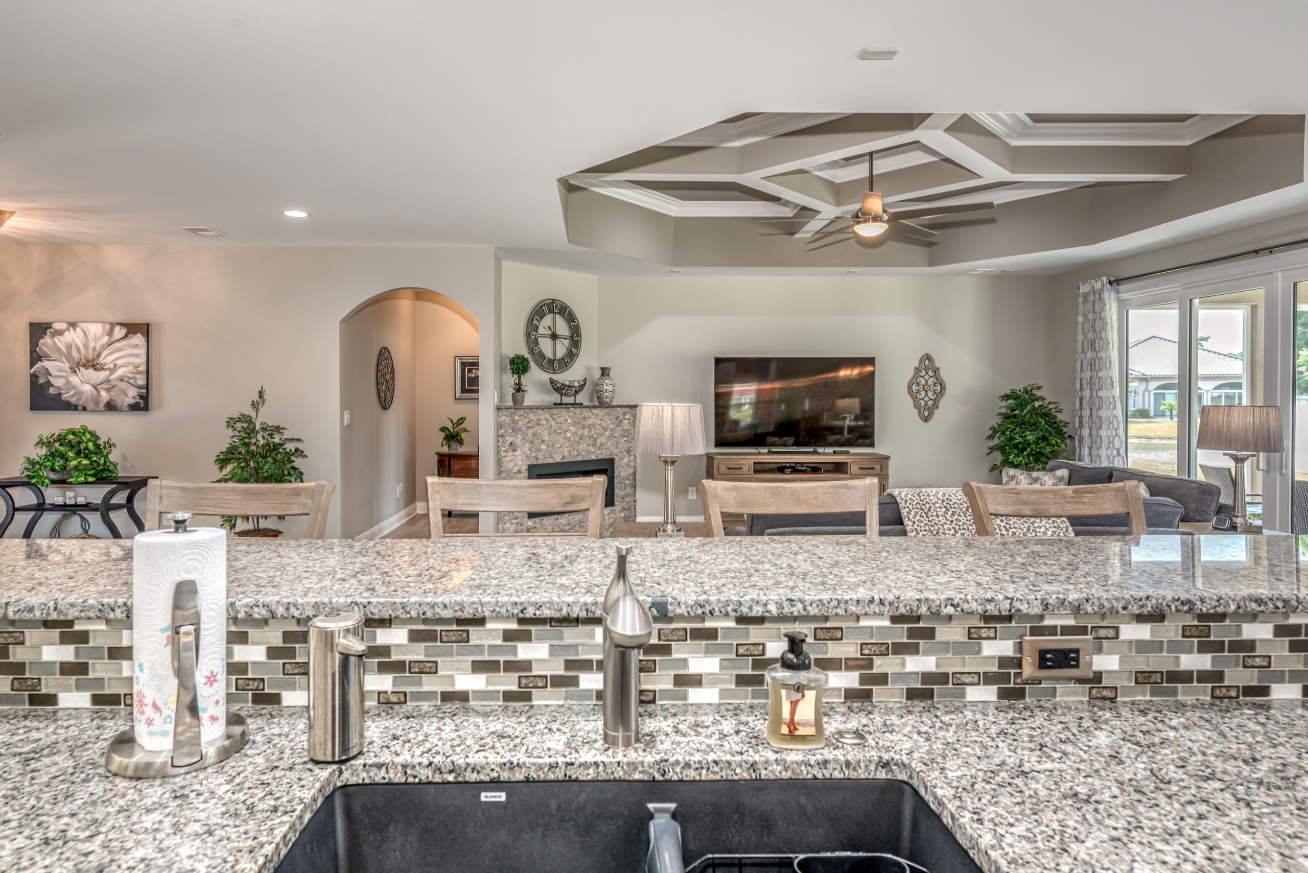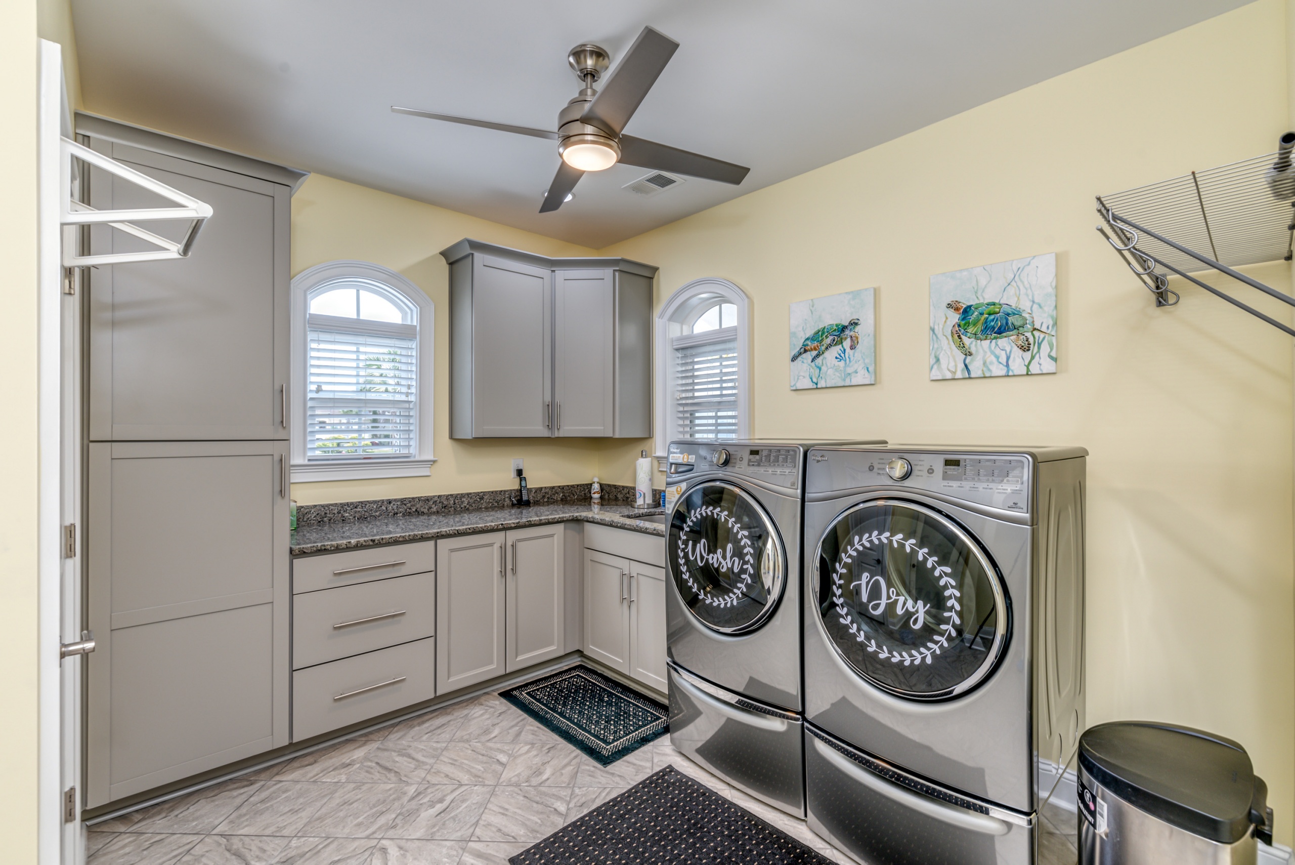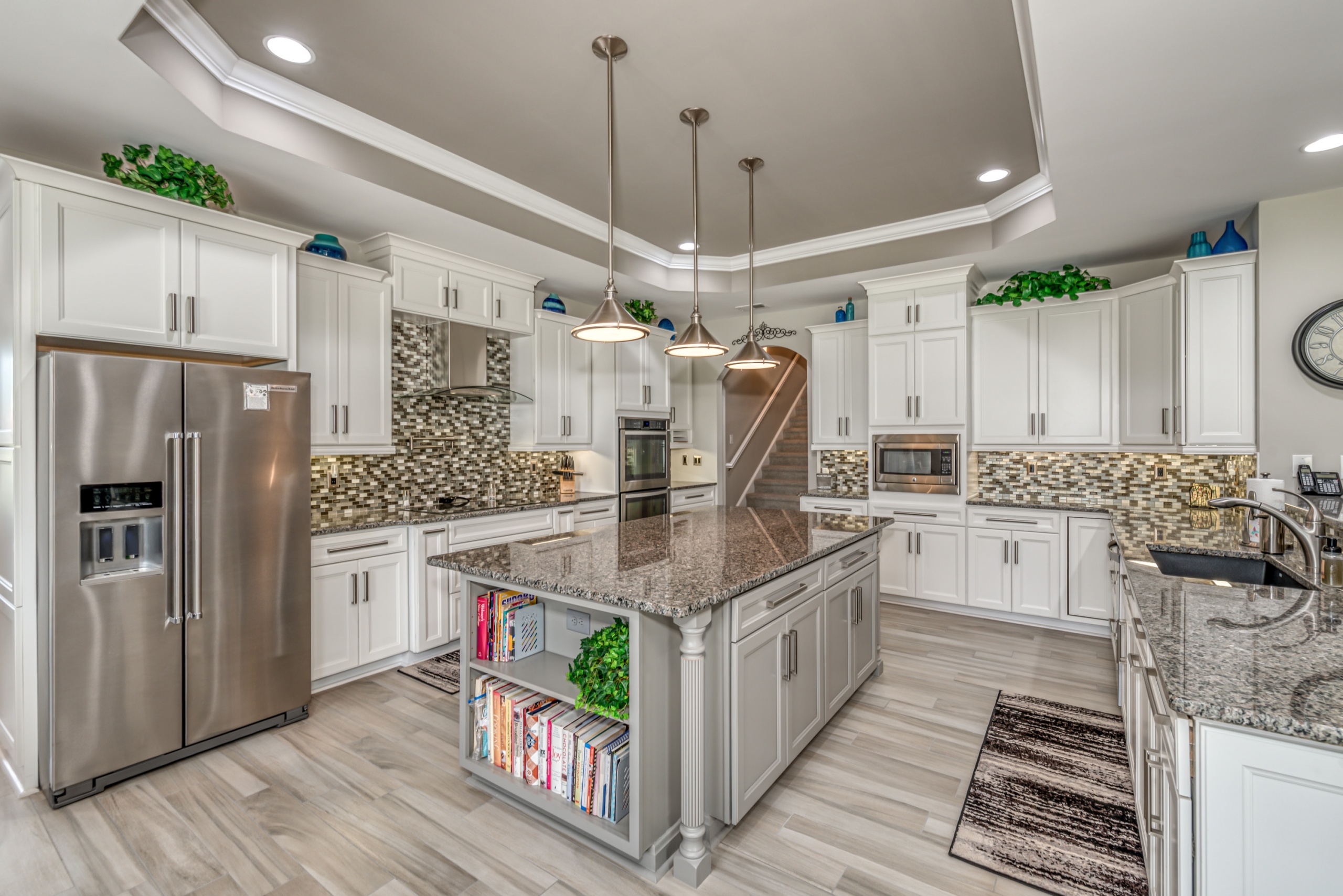 The centerpiece of the kitchen is a vast work island positioned around premium appliances and an exorbitant amount of cabinet and countertop space. Over the GE Cafe Induction cooktop is a pot filler and a custom cabinet spice rack on its lower flank. Double ovens with convection option, built-in microwave, Lazy Susan corner cabinet, and large pantry will make the chef of the family extremely happy.