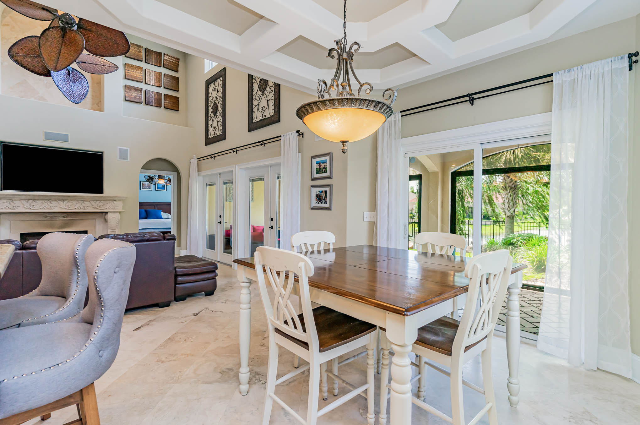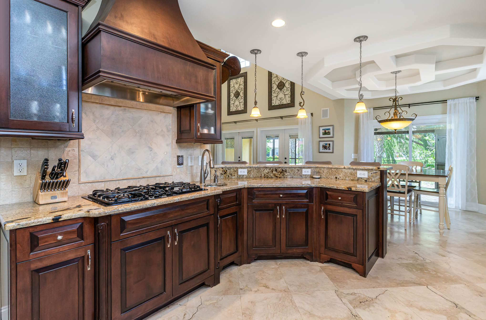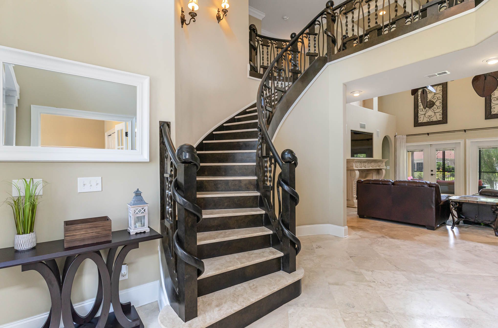 969 Bluffview Drive is a sprawling custom-built Mediterranean masterpiece. Located in the sought-after gated community of The Bluffs on the Waterway, this home has luxury features throughout. Just through the cast-iron front doors is a one-of-a-kind handcrafted metal staircase handrail. Designed and built by the renowned artist Robert Sadlemire, this feature is a sight to be seen, along with top-quality travertine throughout the main living area and stairs. Accenting the two-story great room is a cast stone fireplace and decorative art niches. A very spacious kitchen with custom cabinetry, breakfast bar, high-end appliances, and a large pantry are perfect for the chef in your family. The breakfast nook has a coffered ceiling and a fantastic view of the lake. A covered lanai with all-season panels has tumbled paver tile floors, a sitting area, propane hookup for grill, Bose speakers, and is wired for mounted TVs. Tucked under the stairs is the most recent addition, the custom-made wine cellar.