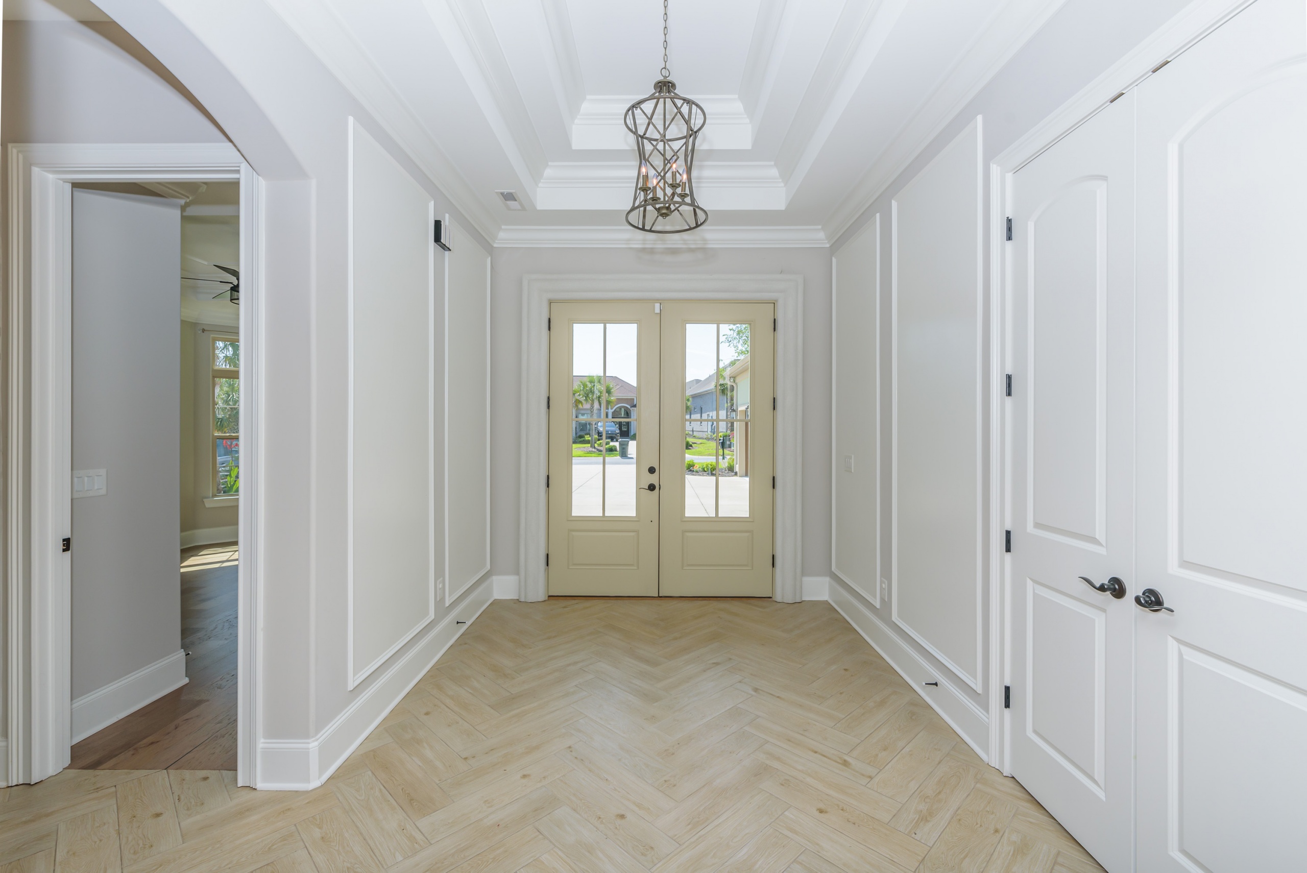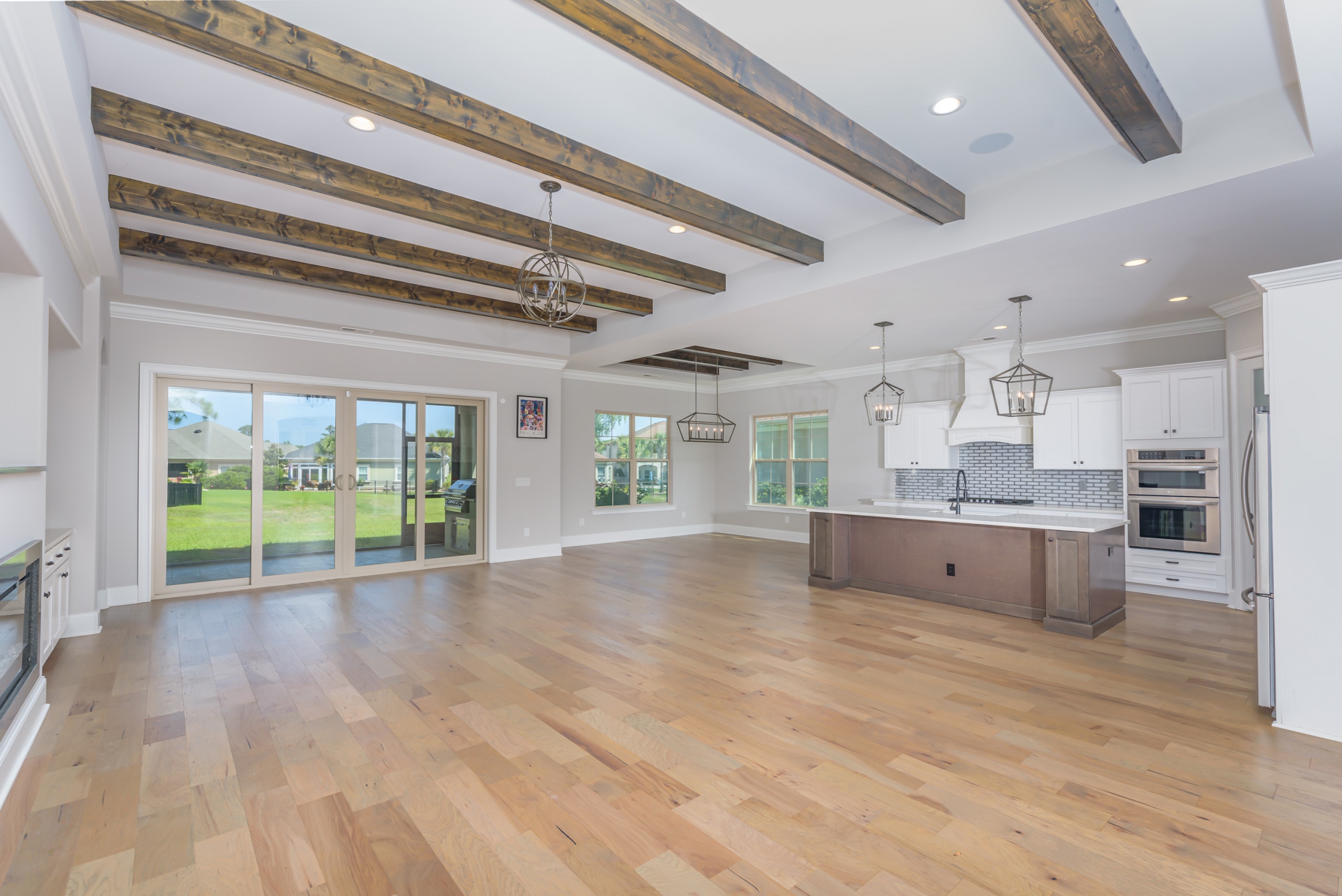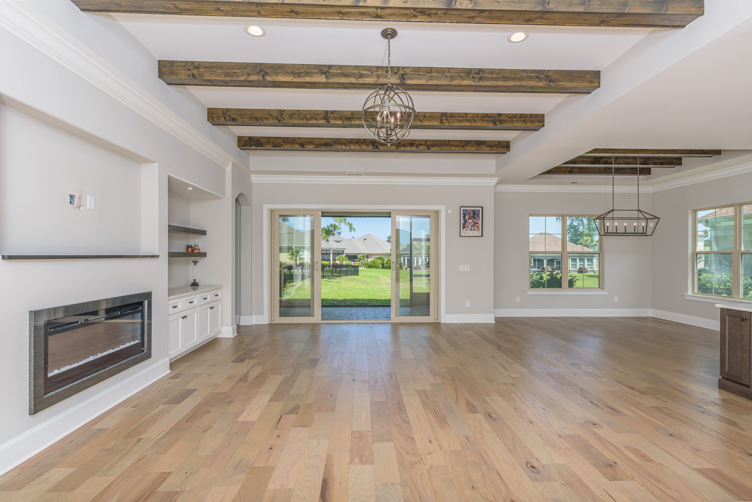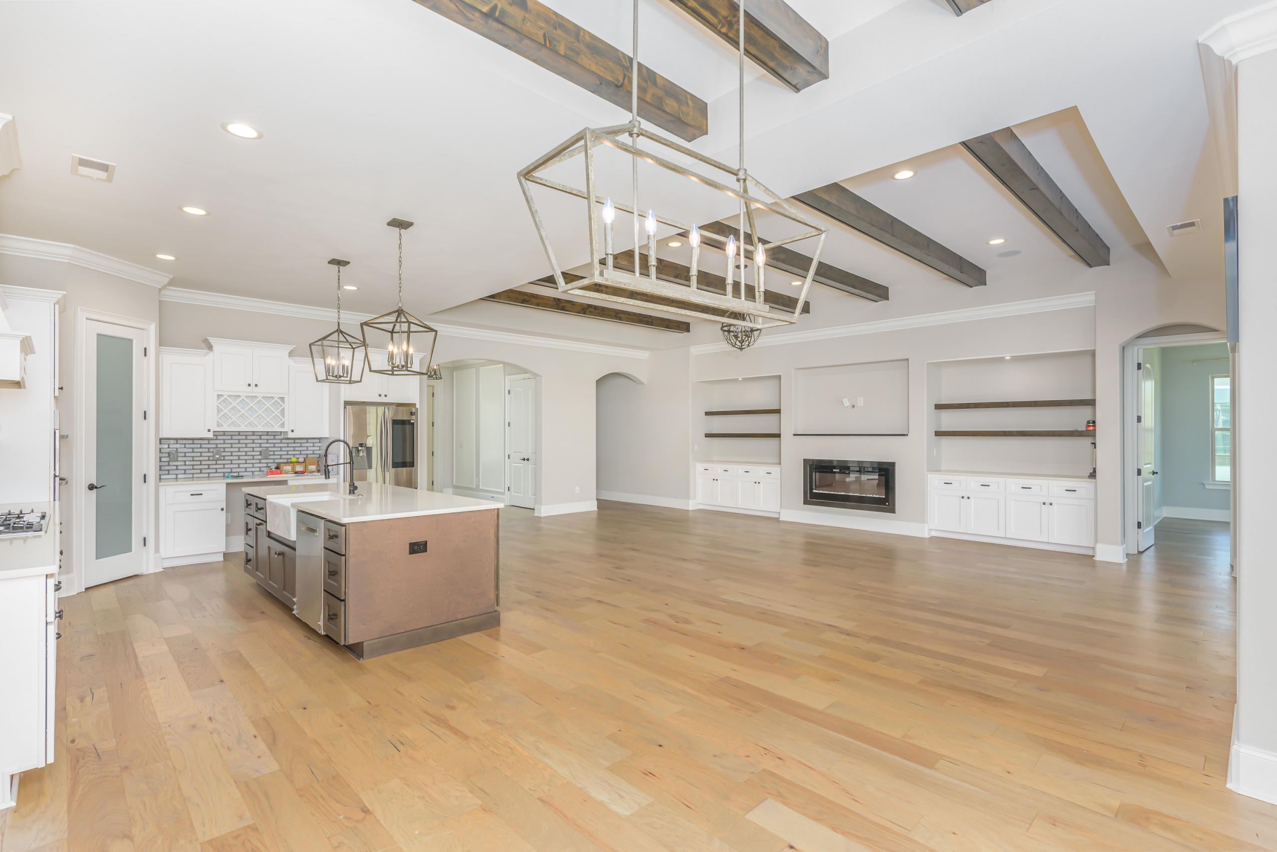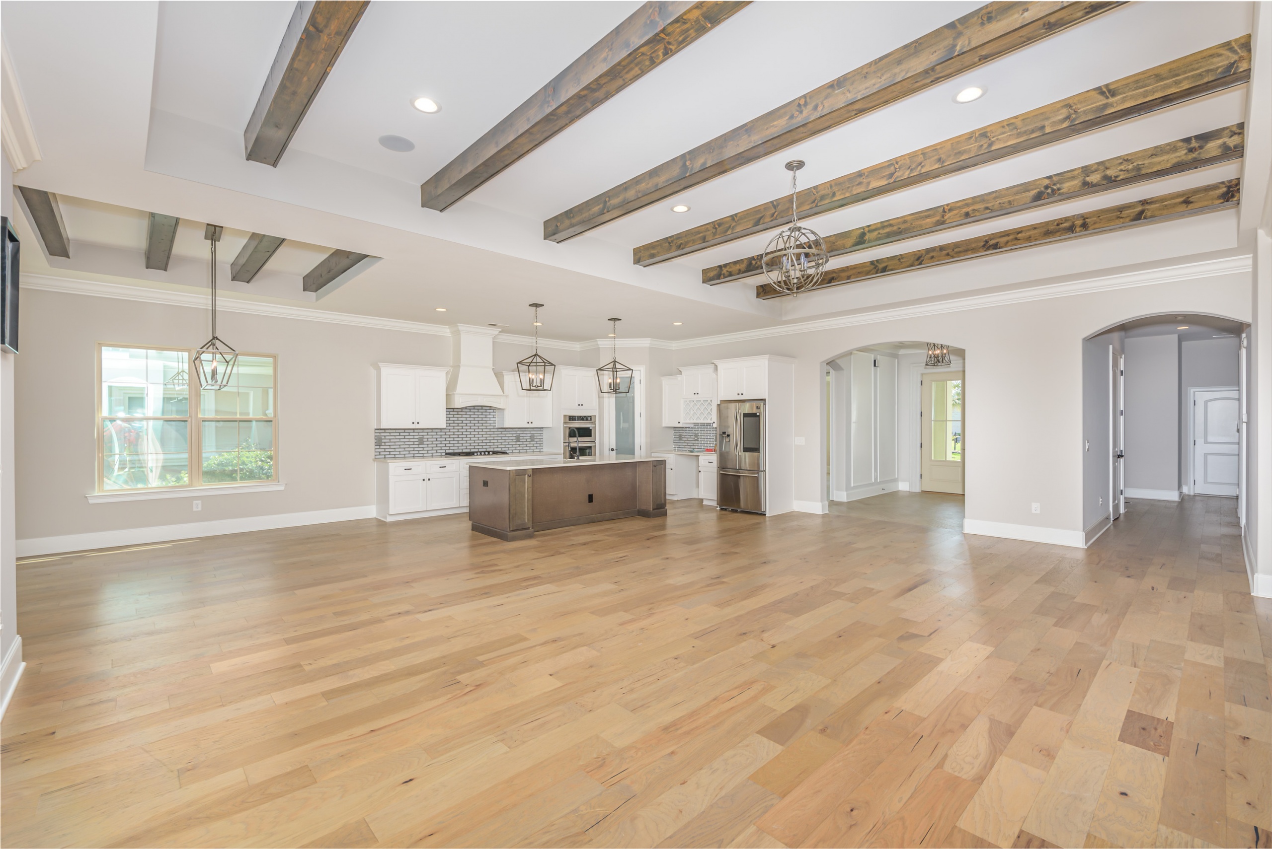 As you step into the grand foyer, you’ll be captivated by the meticulous attention to detail, from the extensive crown molding and shadow boxes to the striking multi-level tray ceiling. The predominantly single-level layout is designed for easy family living, with a spacious guest bedroom at the front of the house and a luxurious owner’s retreat, complete with his and her walk-in closets and a five-star bathroom at the rear. The main living area is flooded with natural light and features gorgeous beam ceilings, a cozy fireplace, and built-in cabinetry.