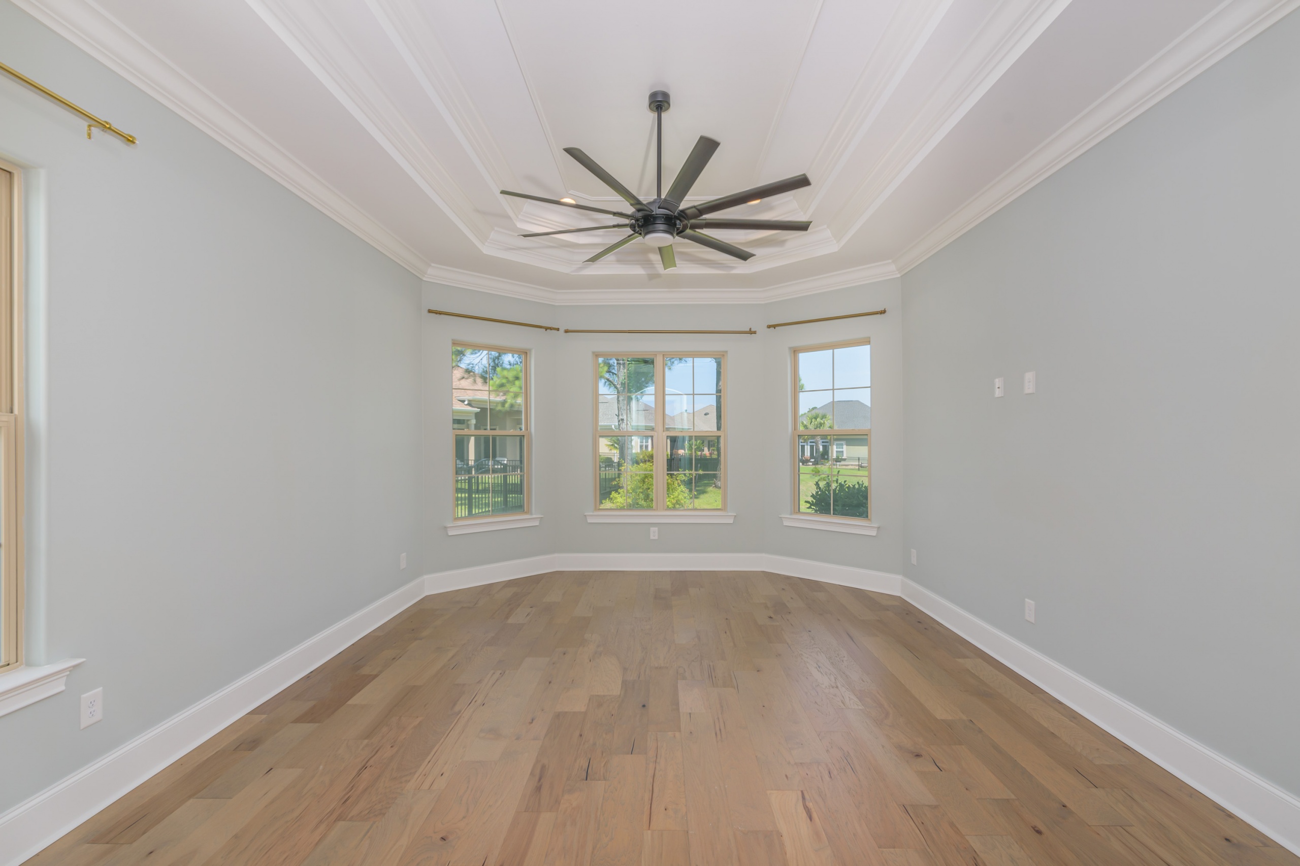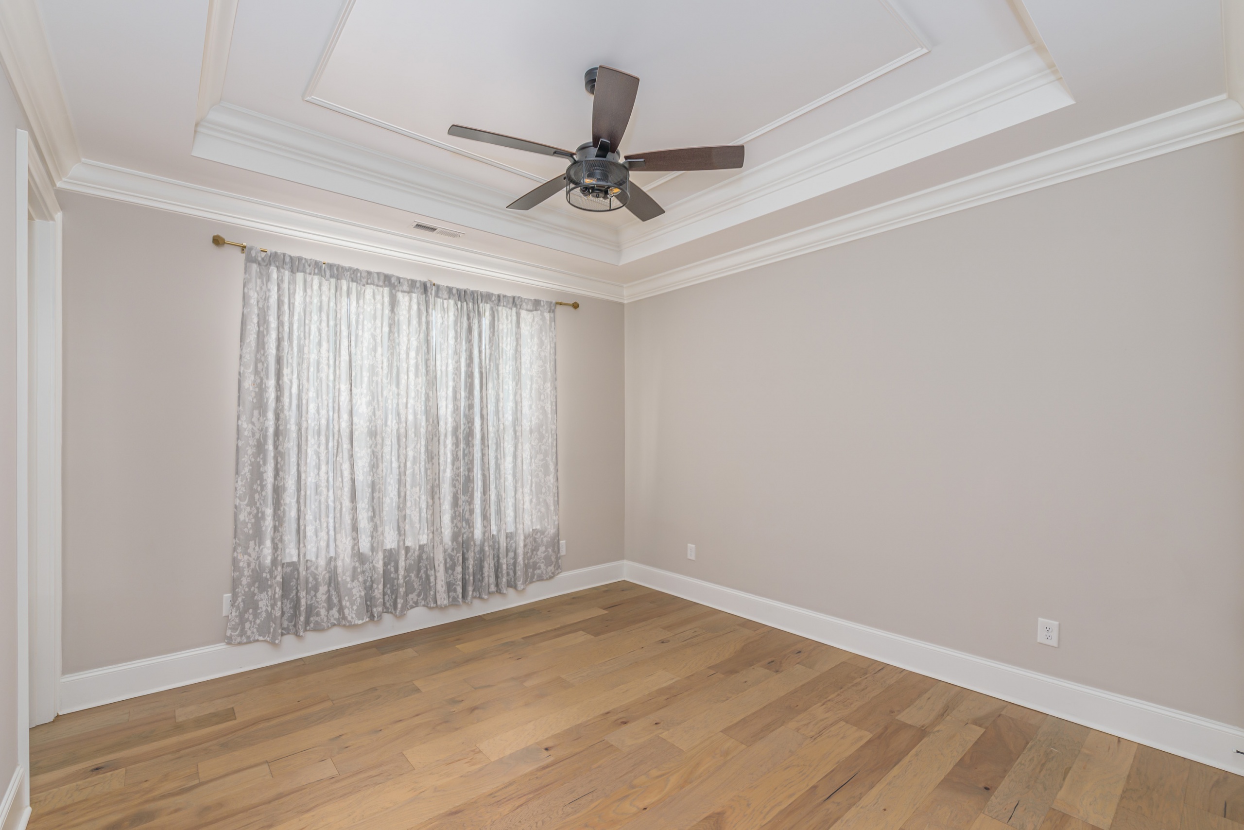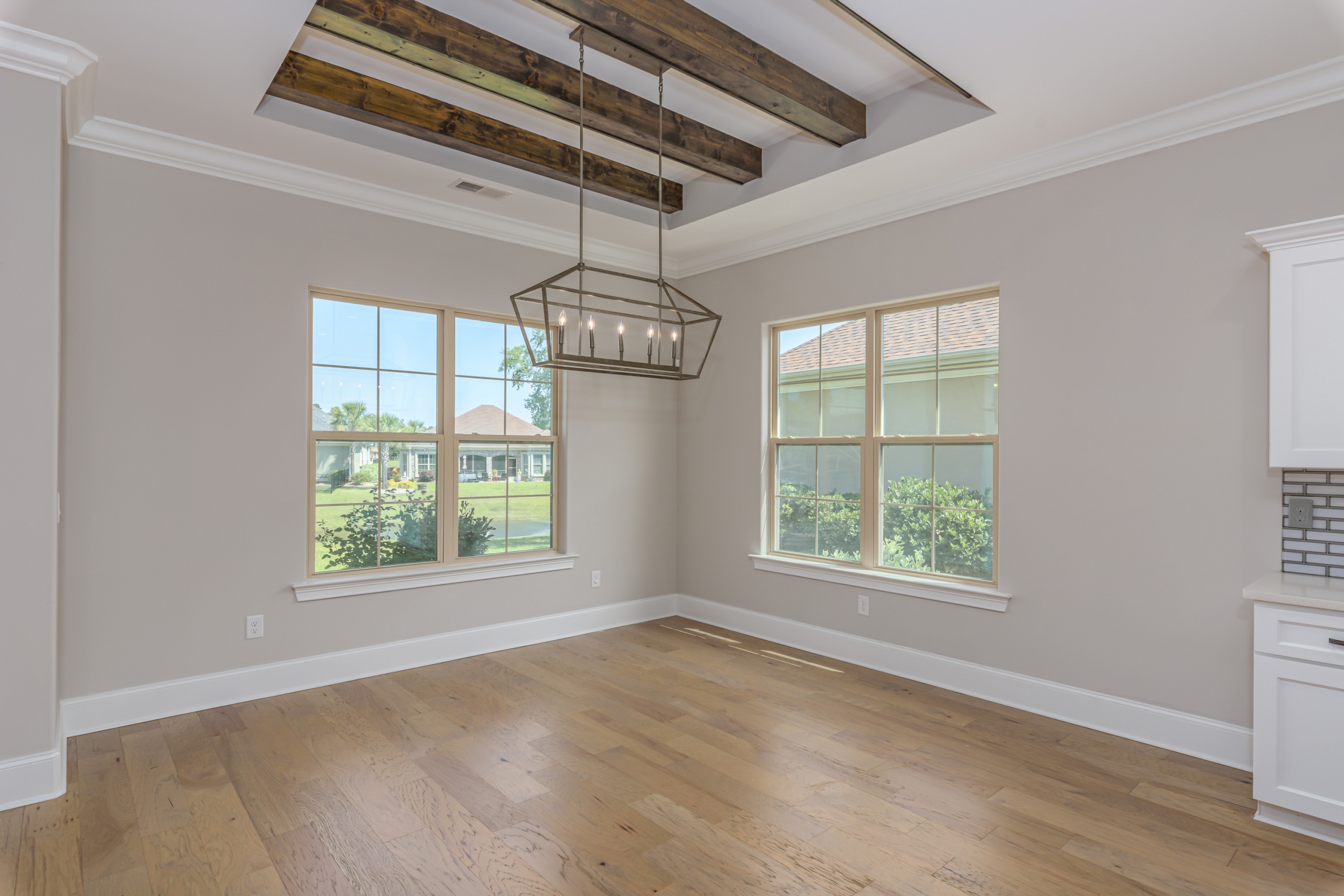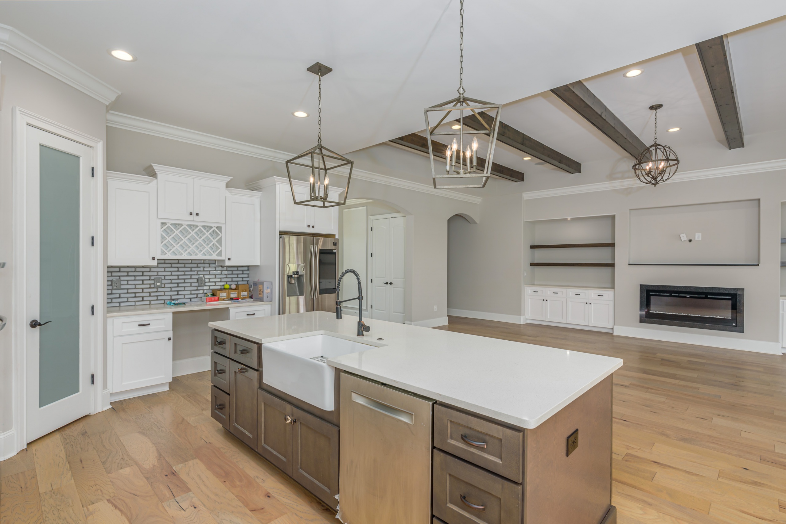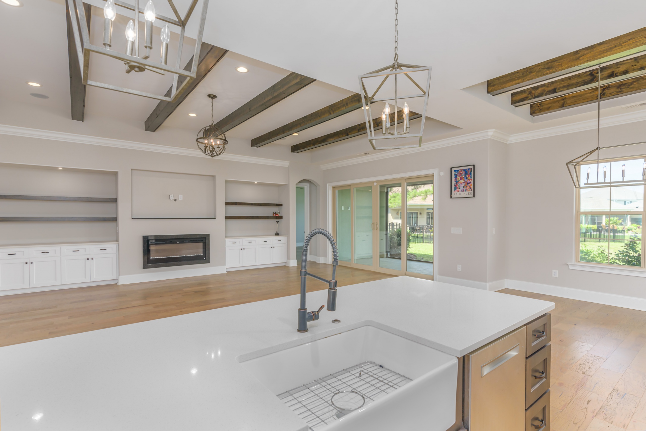 As you step into the grand foyer, you’ll be captivated by the meticulous attention to detail, from the extensive crown molding and shadow boxes to the striking multi-level tray ceiling. The predominantly single-level layout is designed for easy family living, with a spacious guest bedroom at the front of the house and a luxurious owner’s retreat, complete with his and her walk-in closets and a five-star bathroom at the rear. The main living area is flooded with natural light and features gorgeous beam ceilings, a cozy fireplace, and built-in cabinetry.