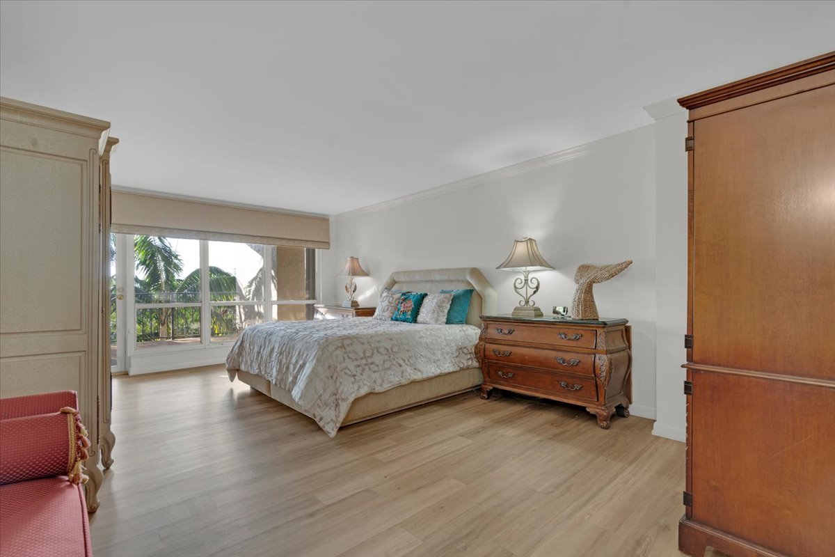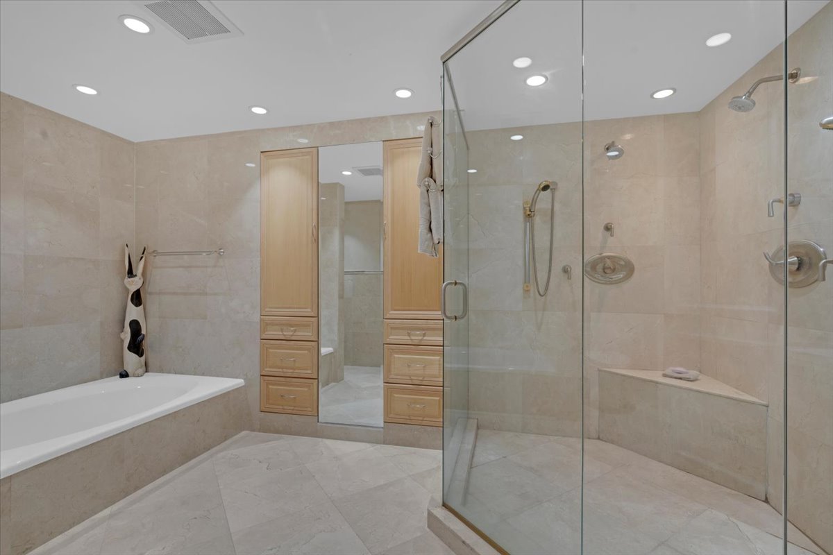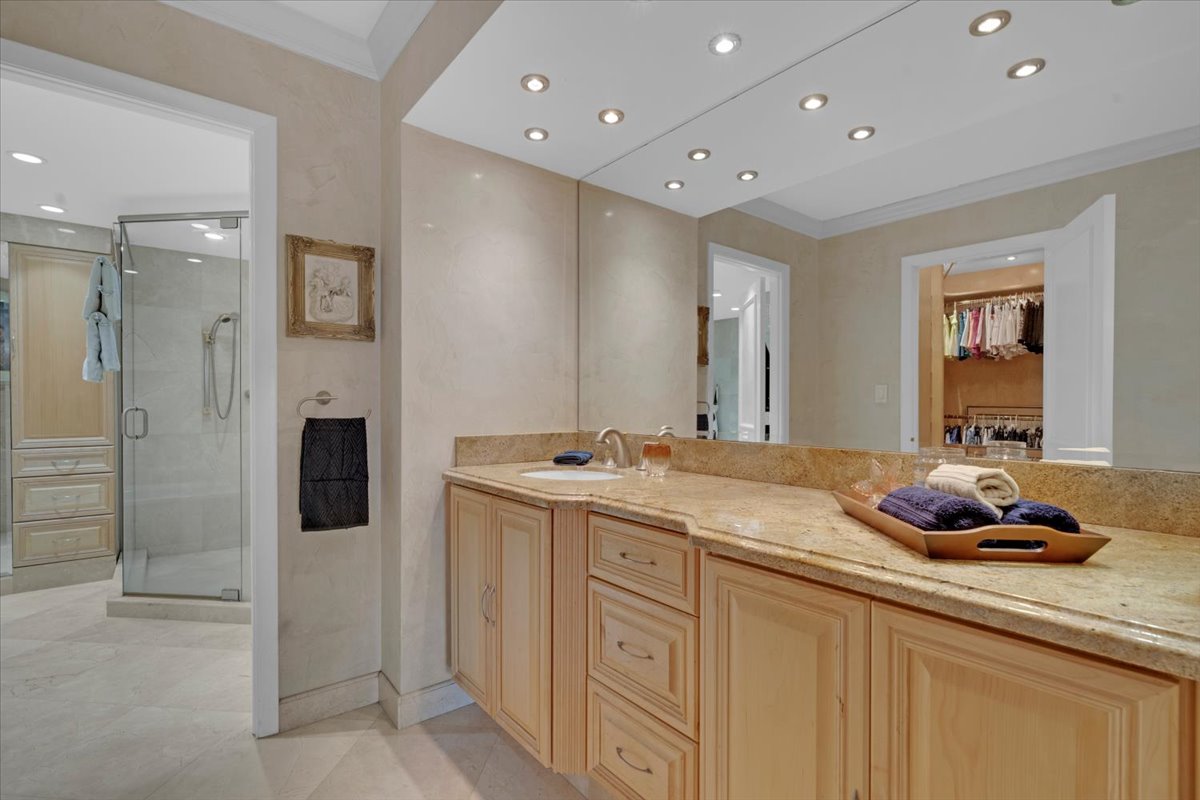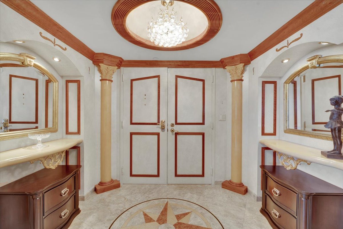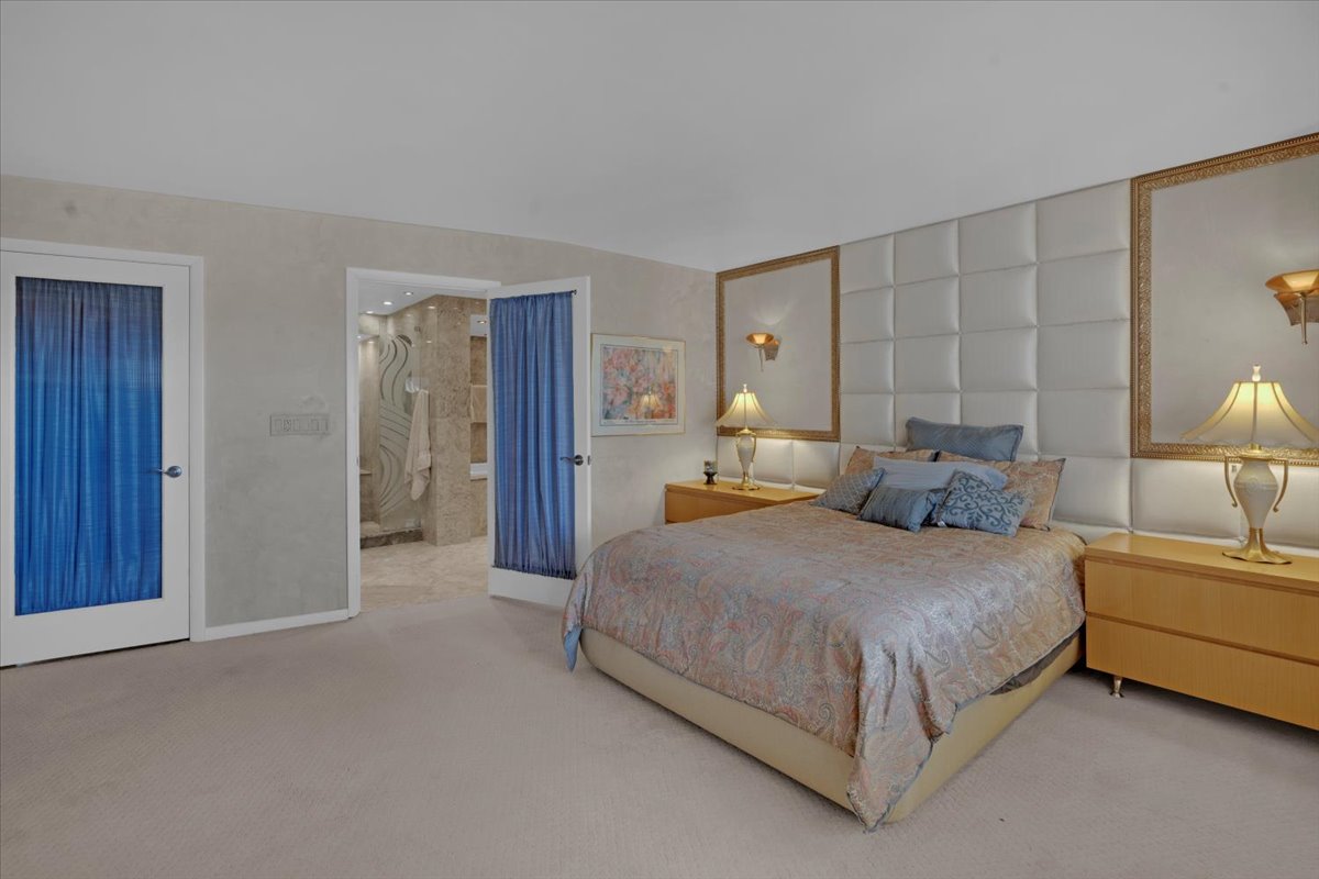 The allure of direct oceanfront living is epitomized in the expansive master suite, which features private balcony access, his and hers closets with custom wood built-ins, and an indulgent master bath, showcasing the grandeur of this exquisite home.