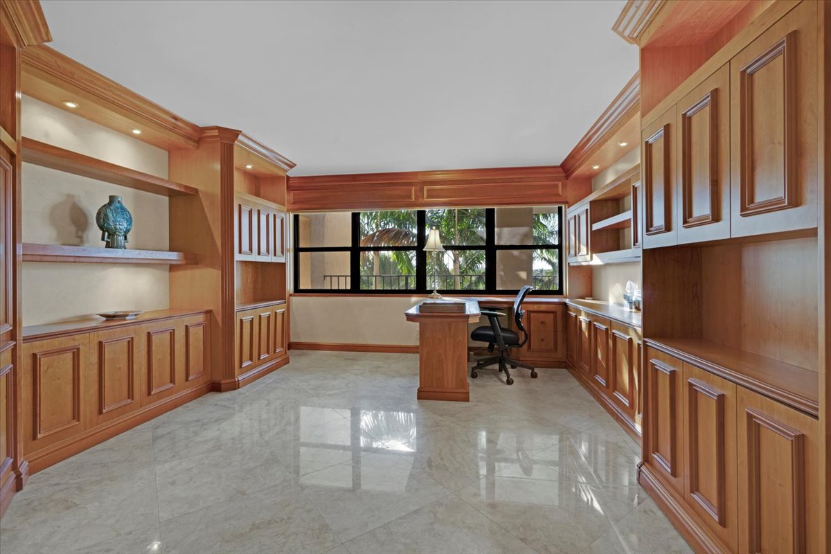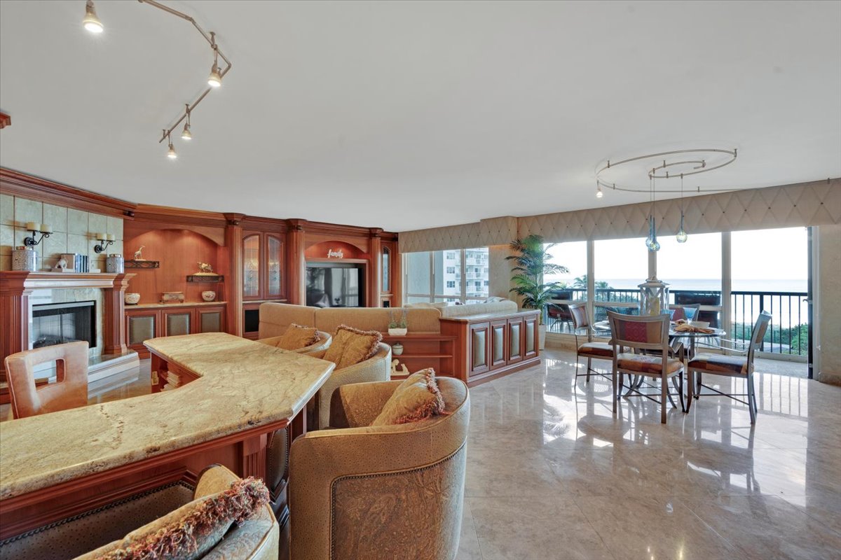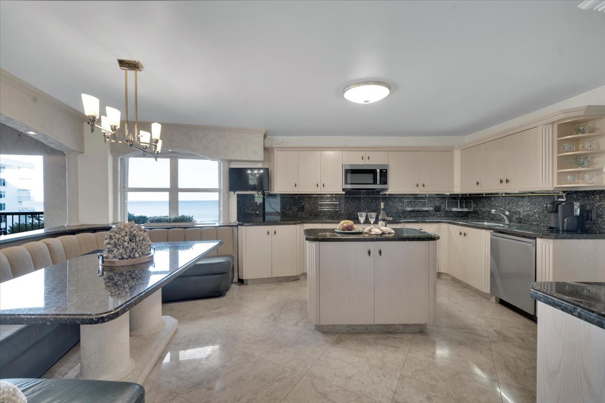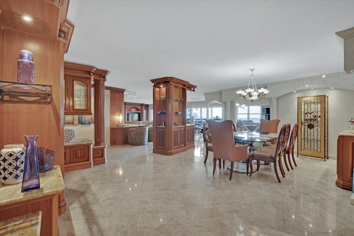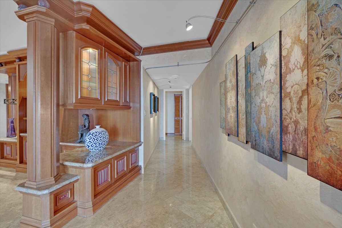 From the moment you step inside, you're greeted with a world of refined comfort. Large open floor plans are adorned with travertine flooring, setting a tone of understated elegance. The property, offered fully furnished, promises an effortless transition to coastal living. Extensive custom woodwork and built-ins throughout the condo highlight the unparalleled craftsmanship that defines every inch of the space. The spacious open kitchen and dining area, complete with built-in bench seating, offer the perfect backdrop for entertaining guests against the view of breathtaking ocean views.