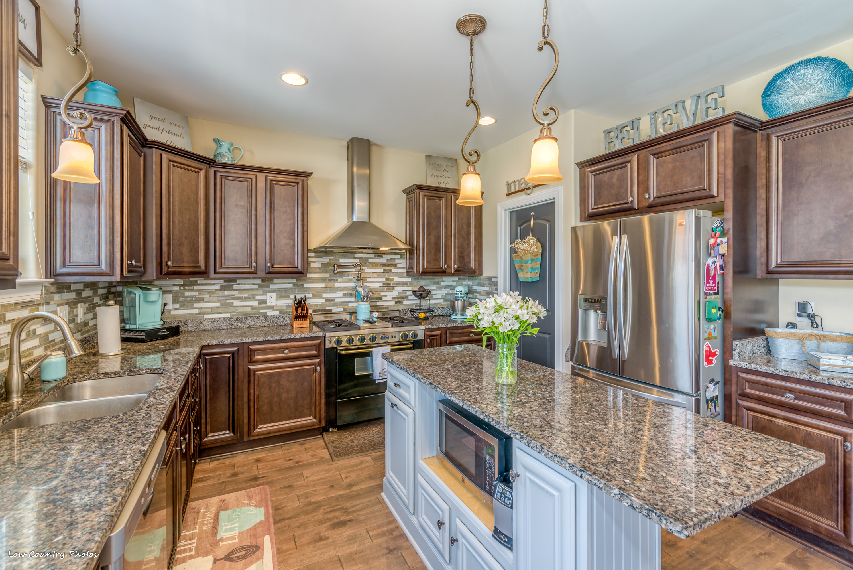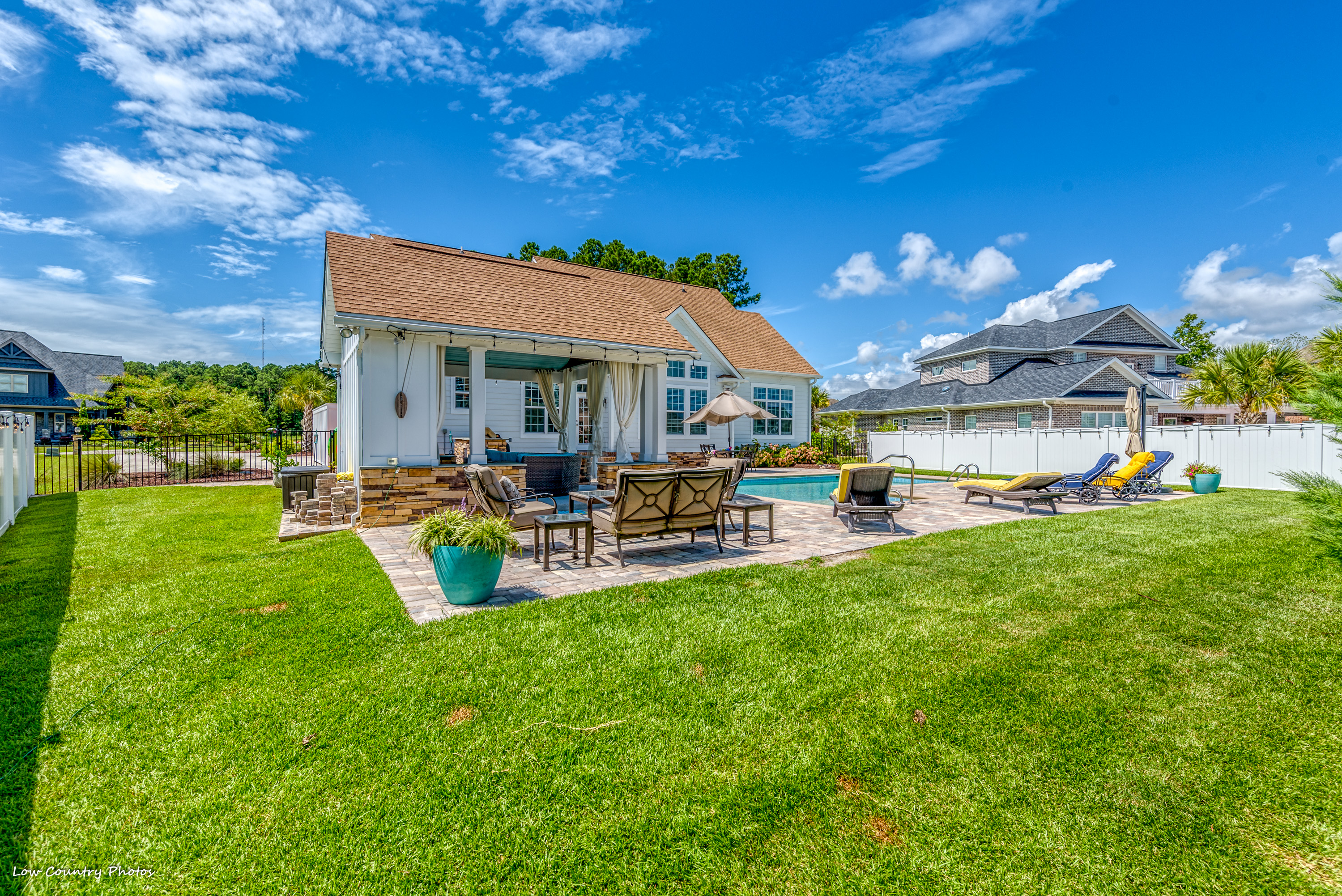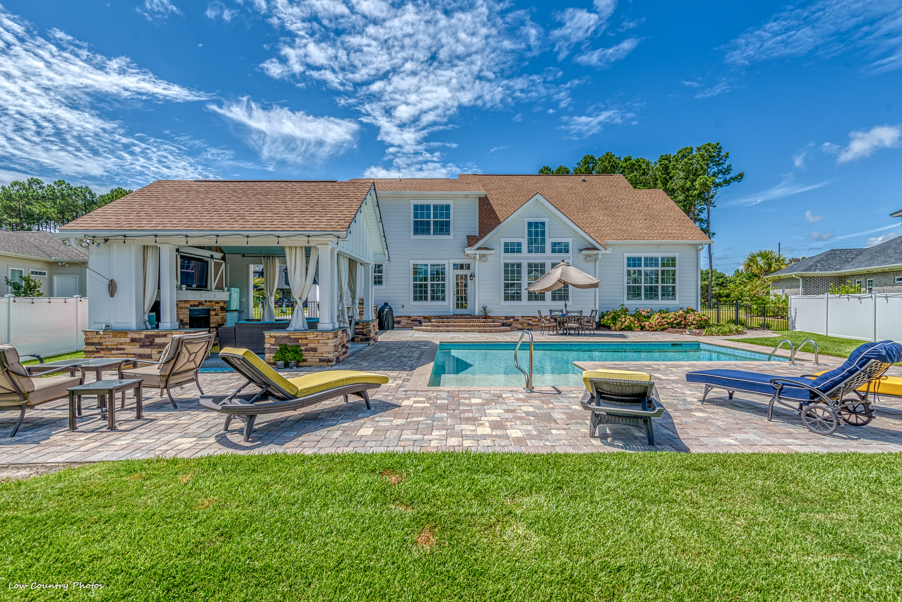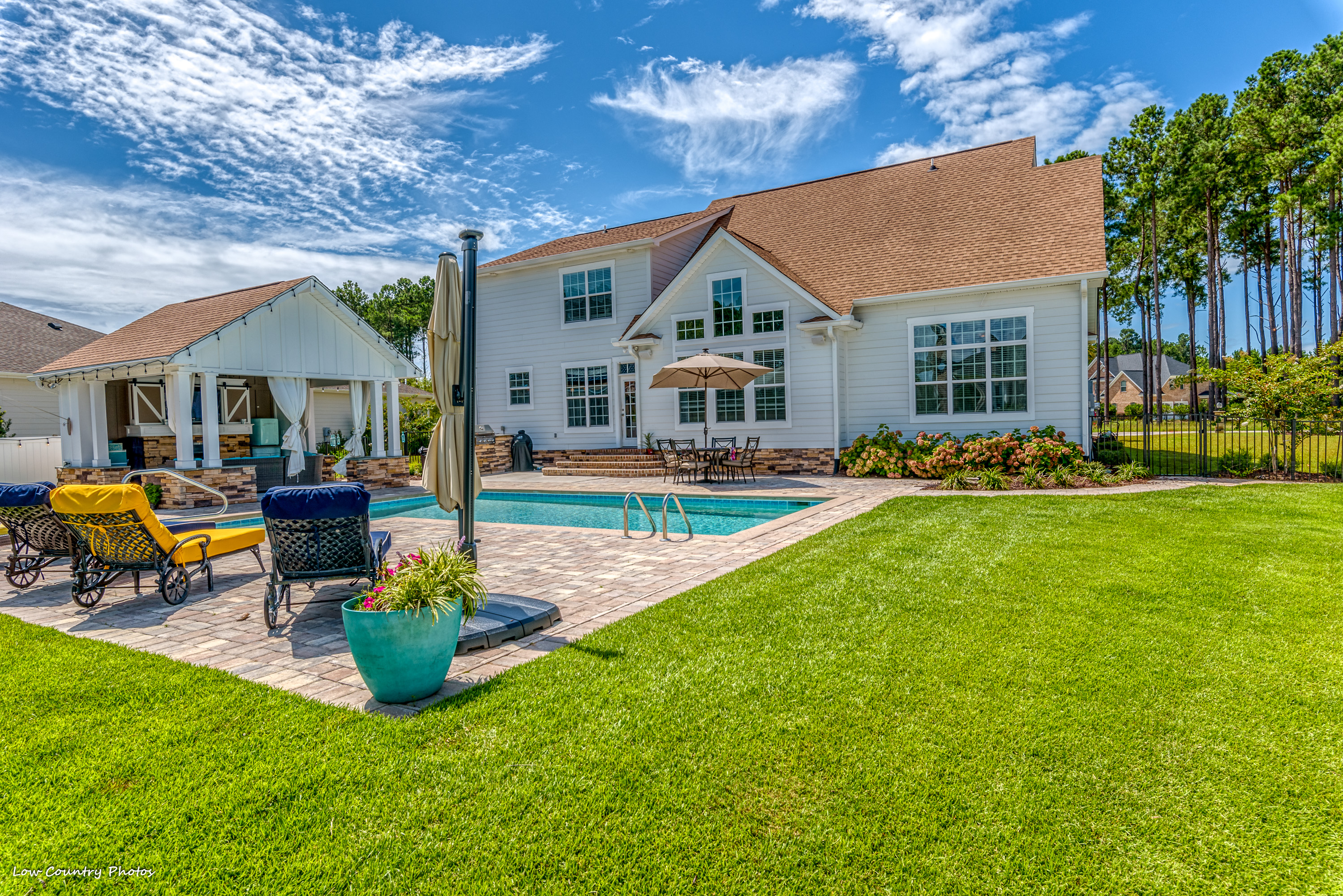 Only four years young, this modified Frank Betz floor plan is the epitome of coastal living. From the southern front porch to the poolside cabana and everything in between, the rest of your life is waiting for you at 3945 Lark Hill Drive.