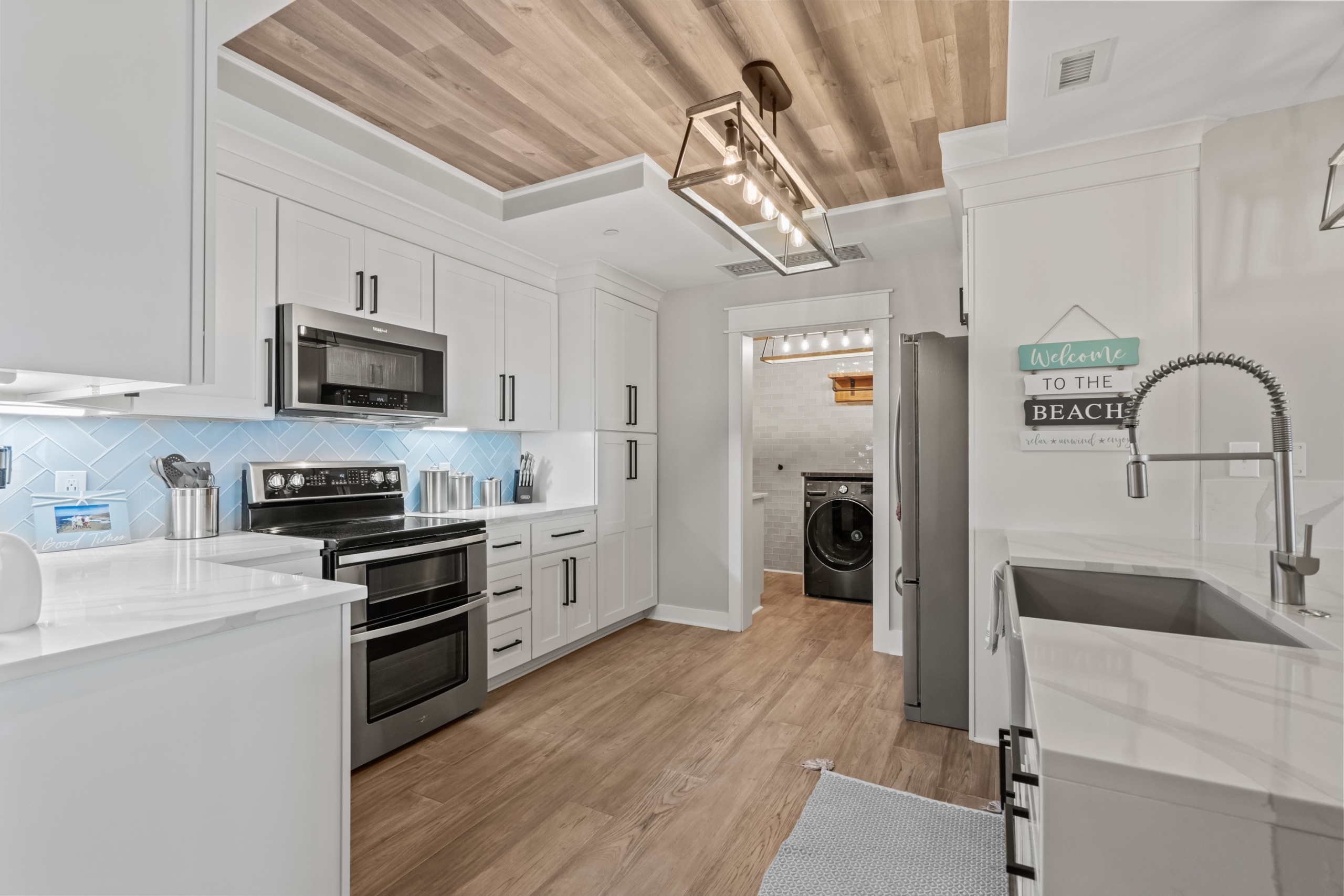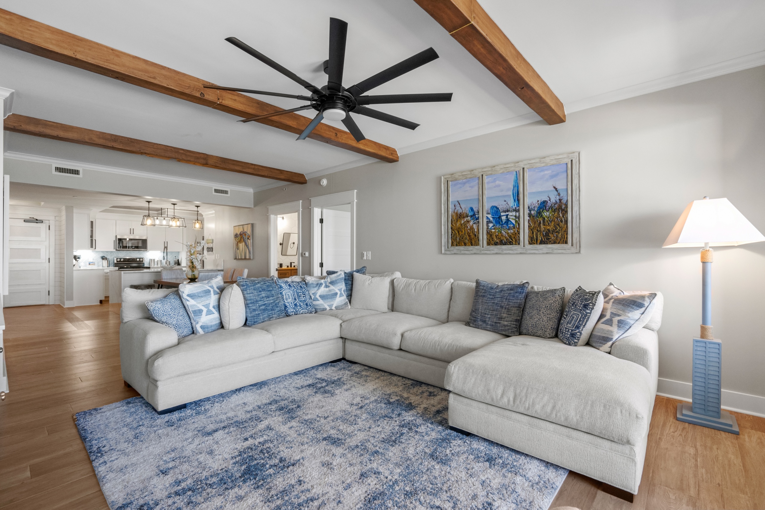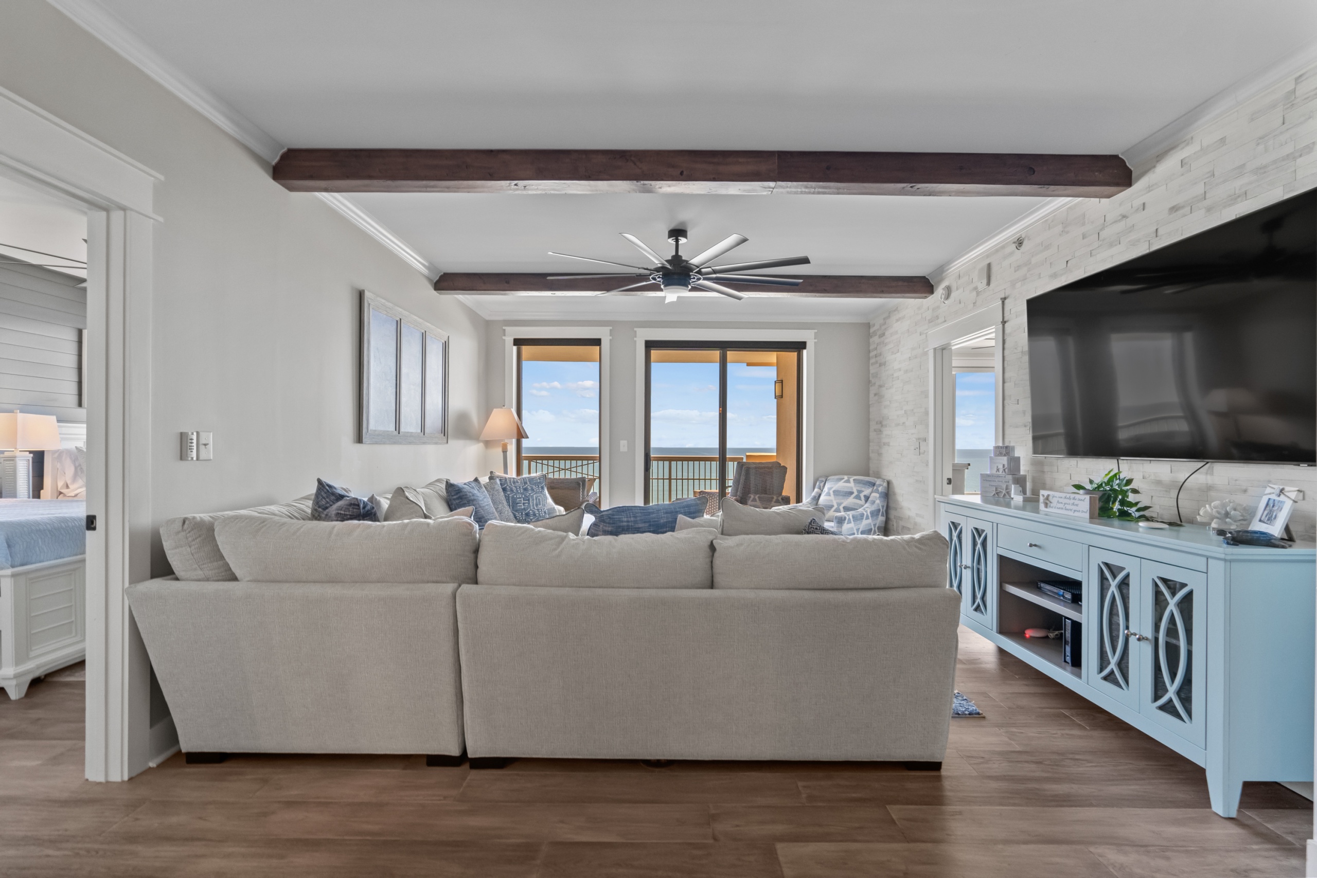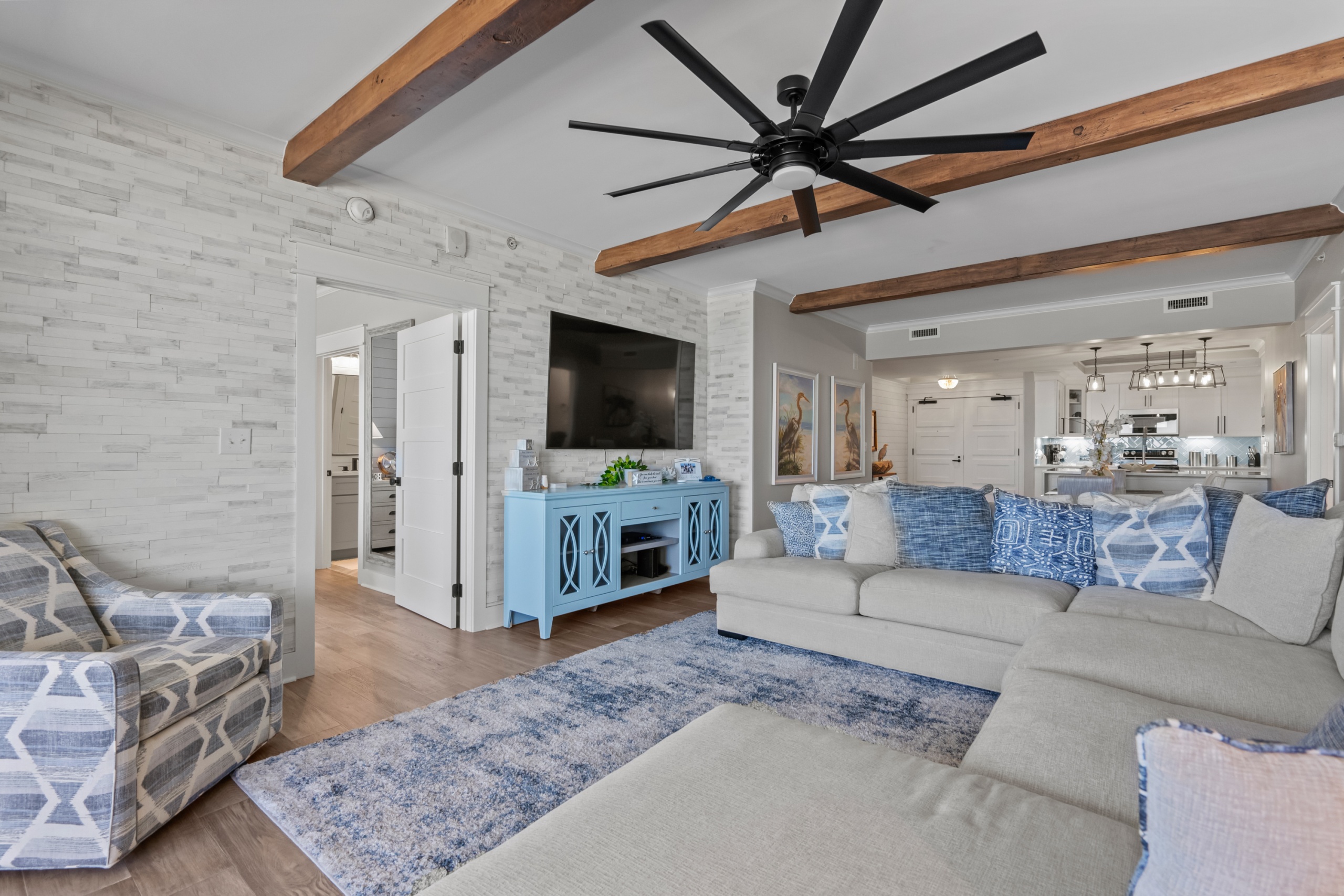 Every detail has been considered, from new electrical and plumbing features to Woodtrac shelving in the closets. The home also comes equipped with brand-new, top-tier appliances and wall-mounted TVs in each room. The condo is fully furnished with new furniture, including the patio set, and it's all tastefully accented by freshly painted walls, added shiplap, and faux beams in the living rooms.