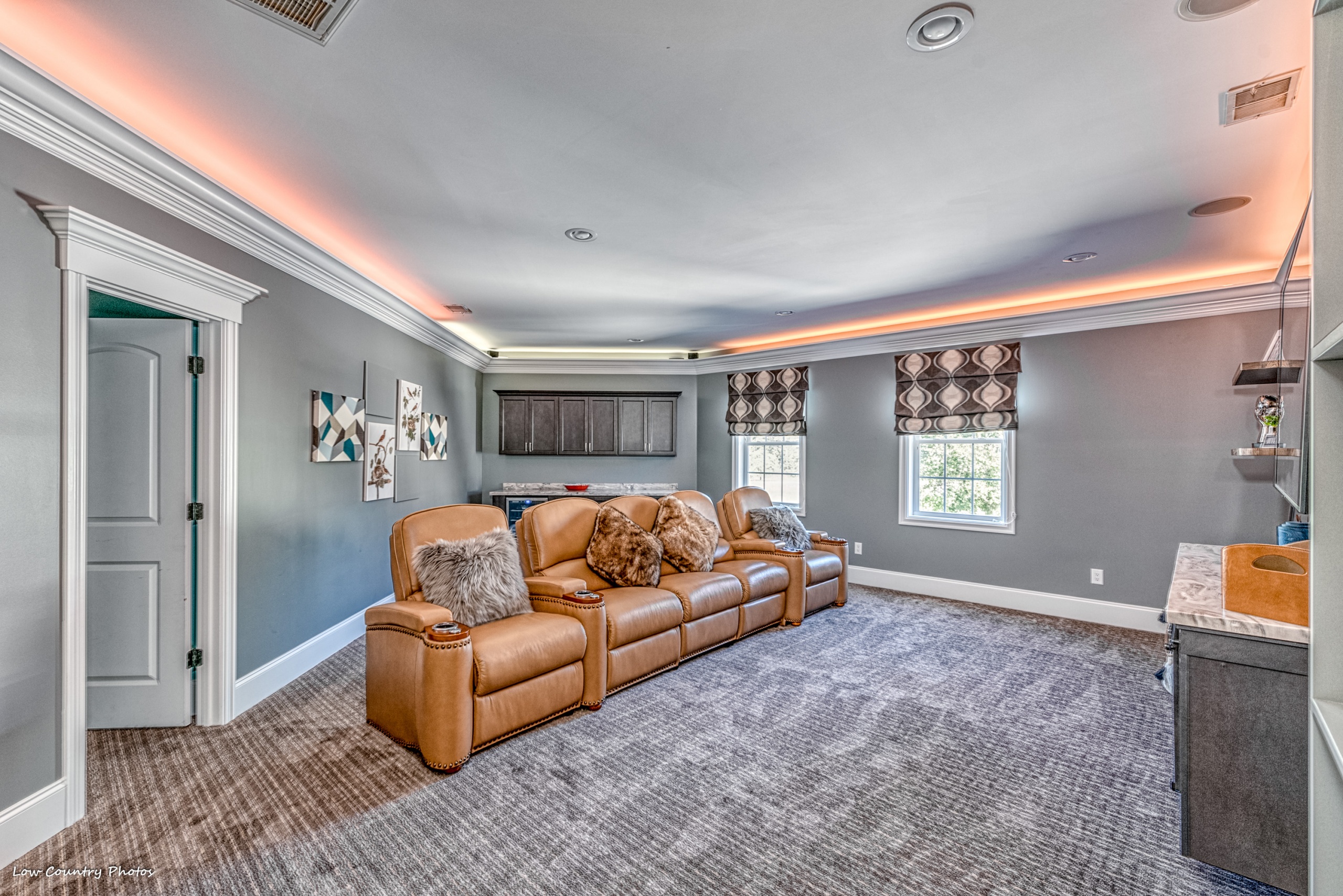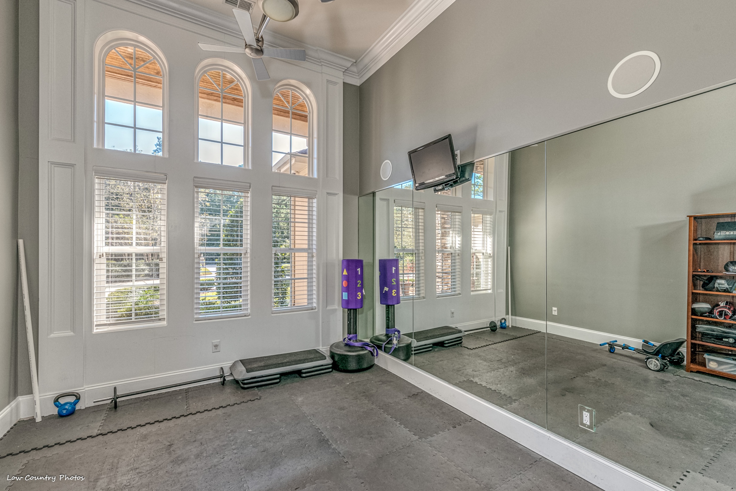 You are greeted with an elegant dining room, formal living room, high ceilings, extensive architectural moldings, archways, tray, and coffered ceilings once through the double door entrance. In the center of the home is a gourmet kitchen with ample cabinet and countertop space. Flanking the kitchen is a breakfast nook and a large two-story family room. The family room has a cozy feel with a fireplace and tons of natural light from the floor to ceiling windows. An owner's suite encompasses the entire left-hand side of the home. This oversized suite has an en-suite bathroom to die for a sitting area perfect for a book or afternoon nap. Rounding out the home's main level are three spacious guest bedrooms, a large laundry room, and a home gym with padded flooring and mirrored walls. Upstairs is a home theater with a beverage center and craft room that could have many different uses.